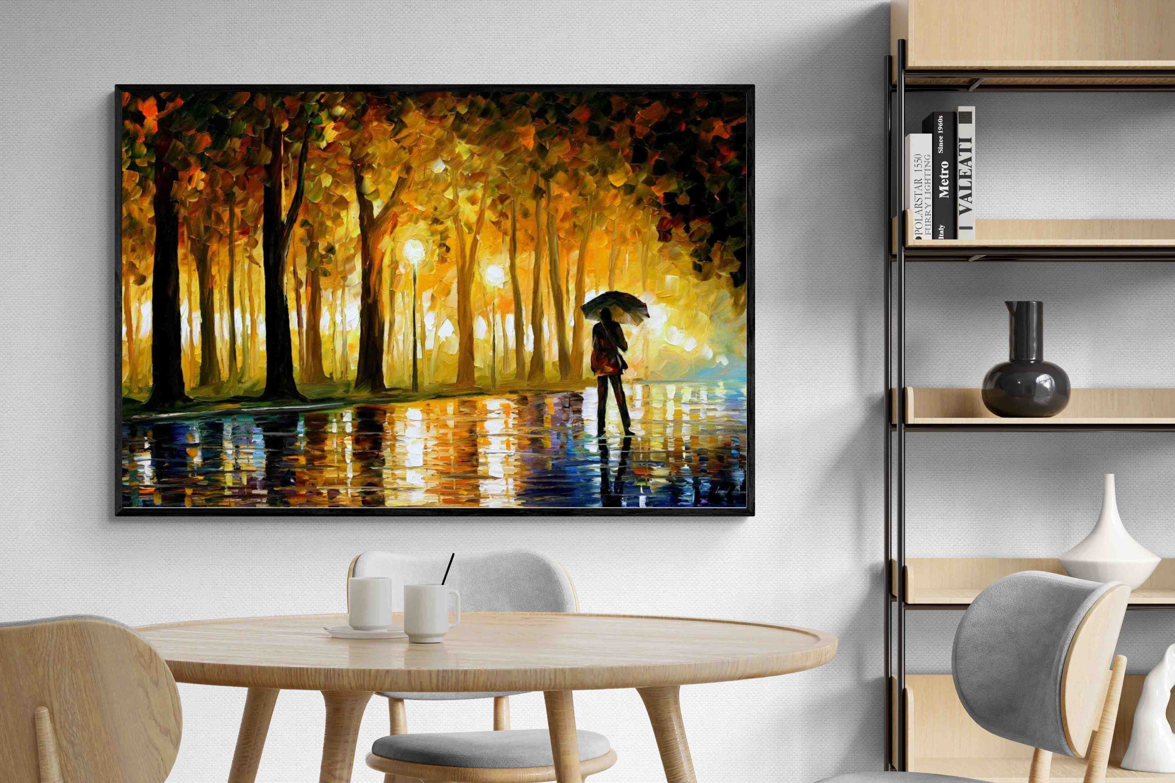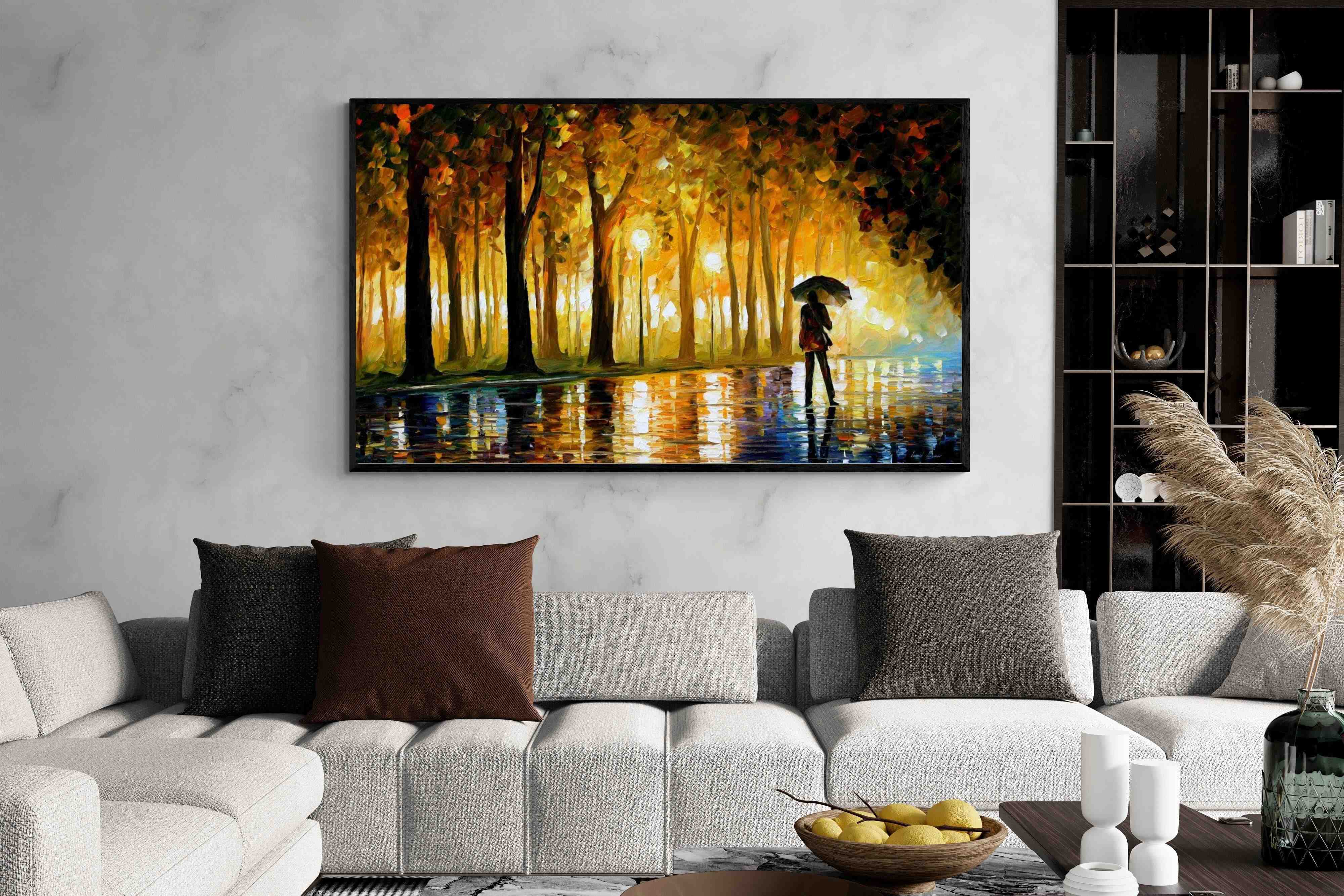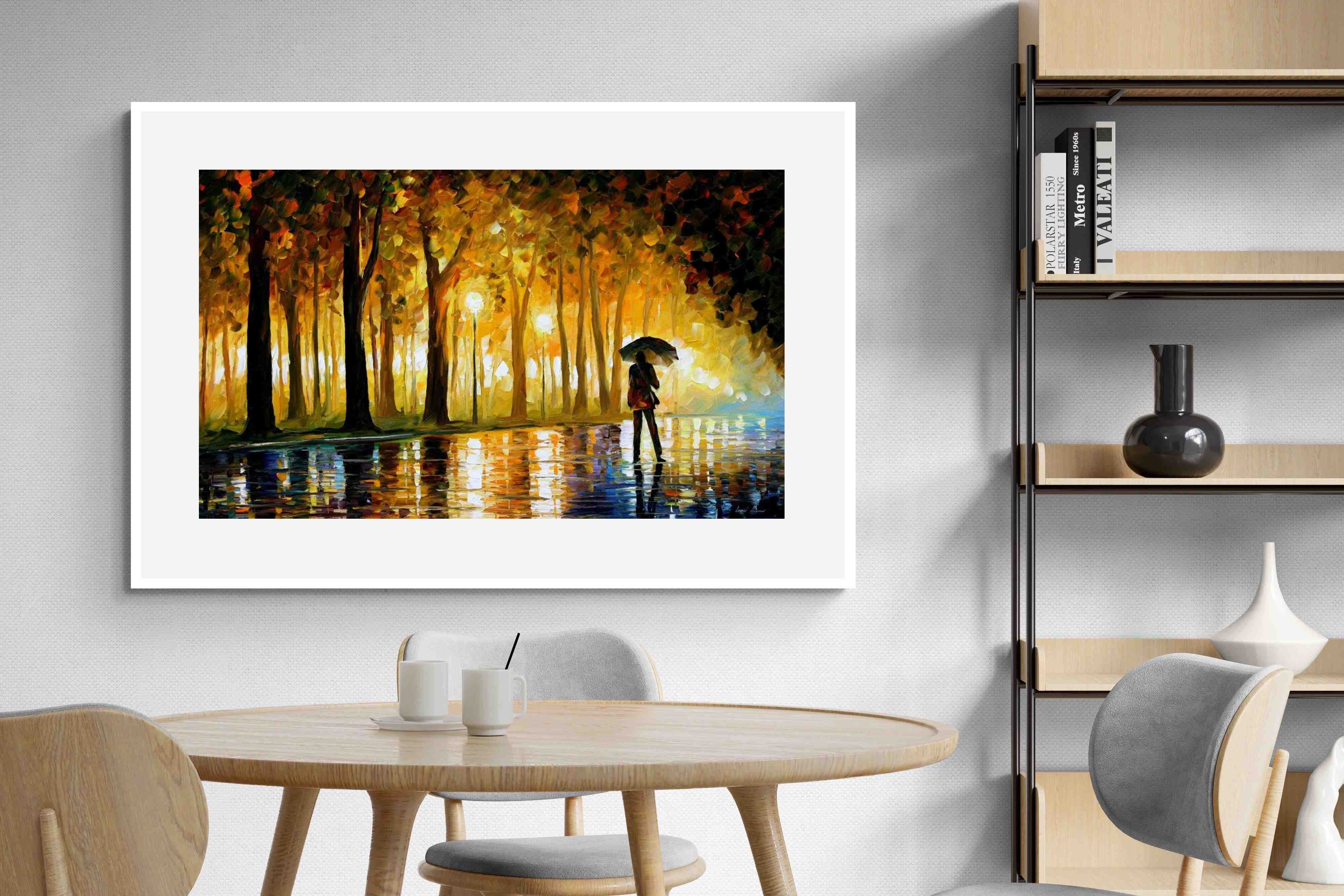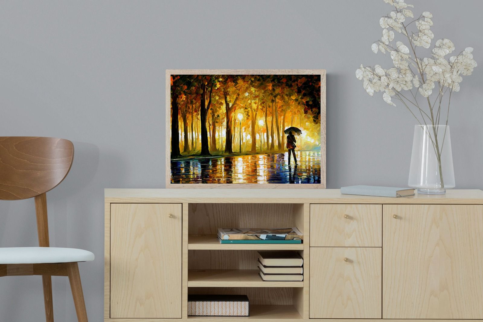"Alley by the River" by Leonid Afremov captures the serene beauty of an autumn evening. The glowing streetlights and autumnal hues reflect beautifully on the wet pavement, creating a peaceful, glowing atmosphere. This painting, with its rich textures and dynamic colours, evokes a sense of warmth and nostalgia, making it a perfect piece of wall art for a contemporary home, bringing vibrancy and comfort to any space.
