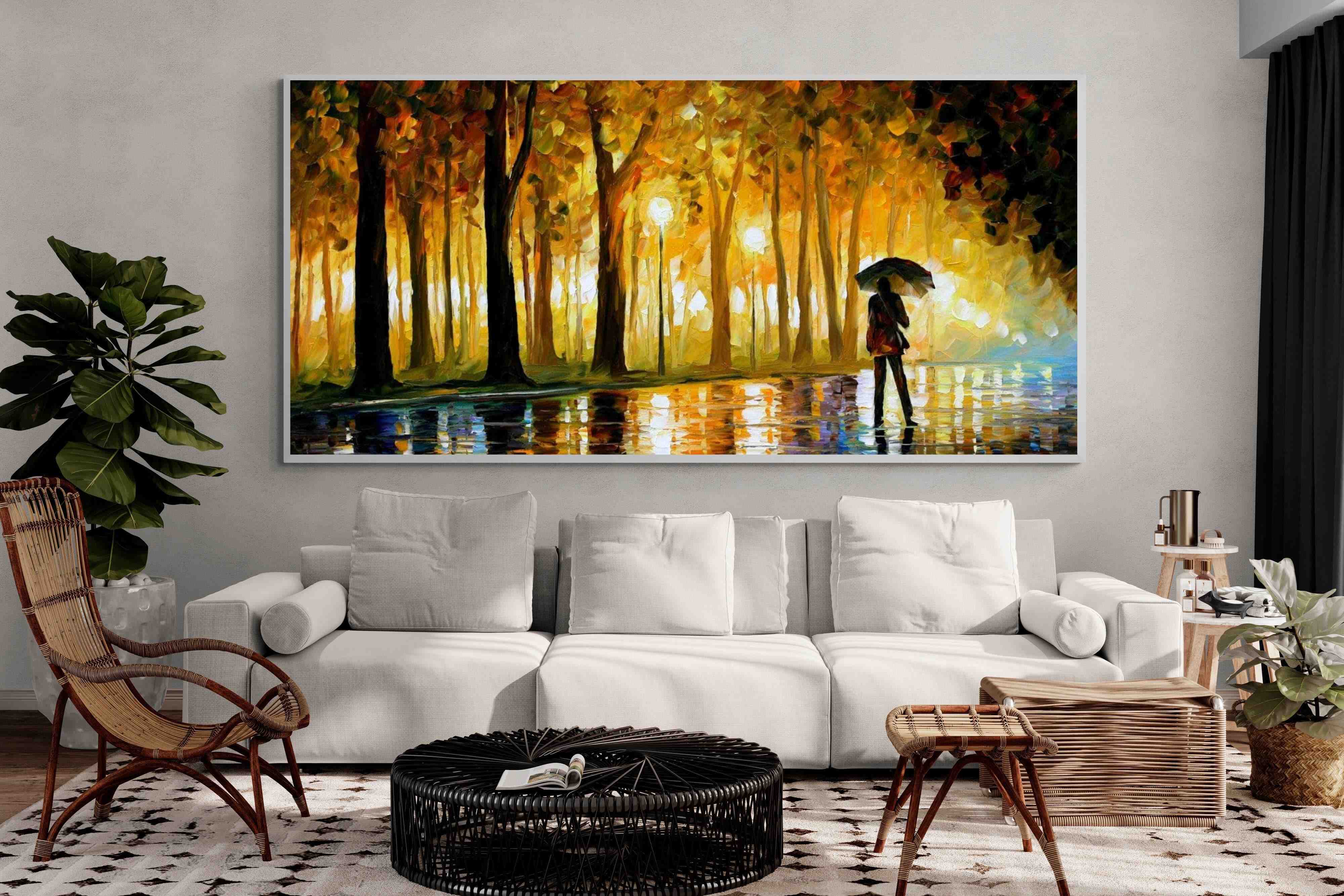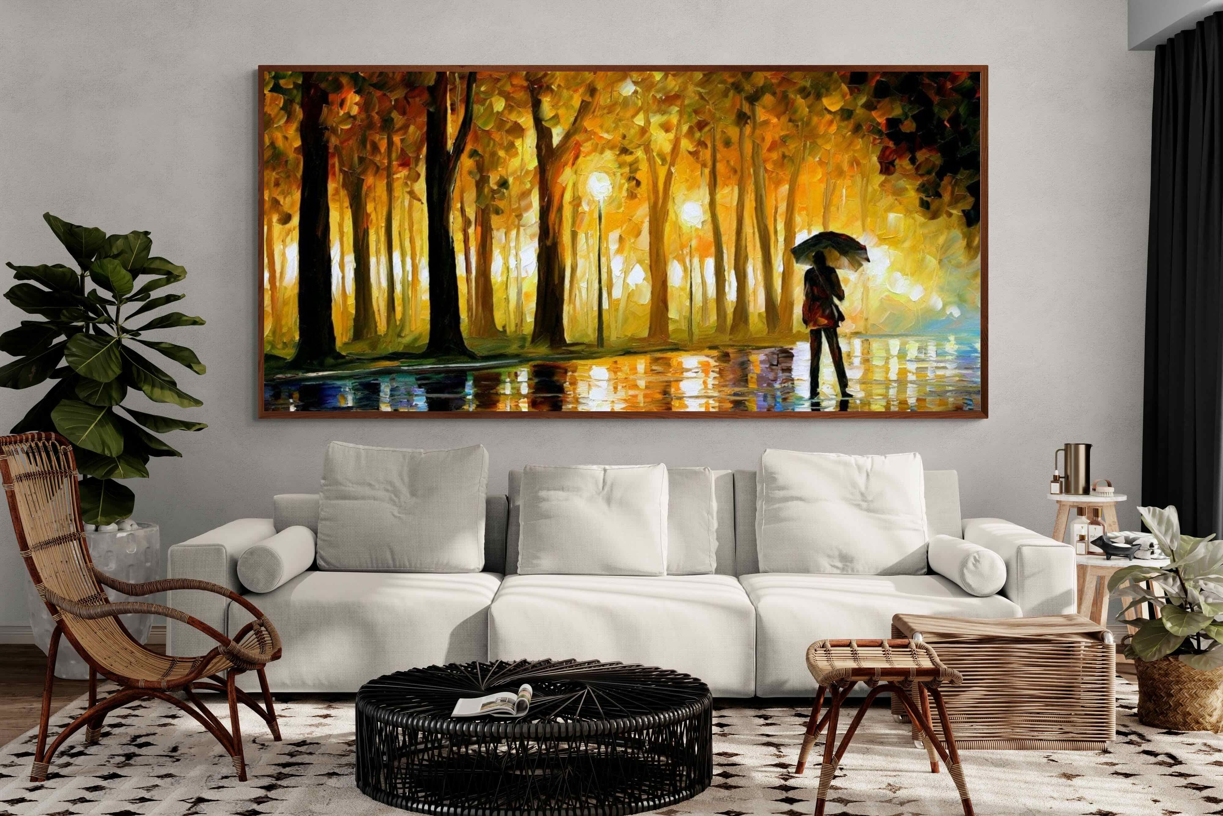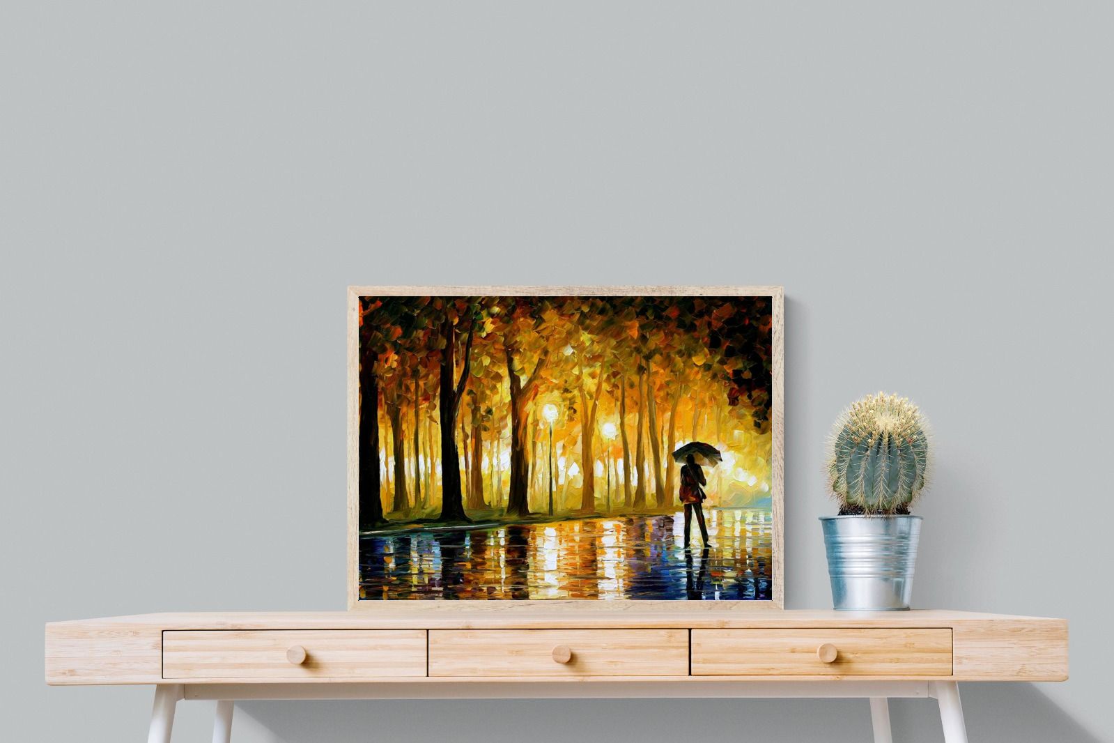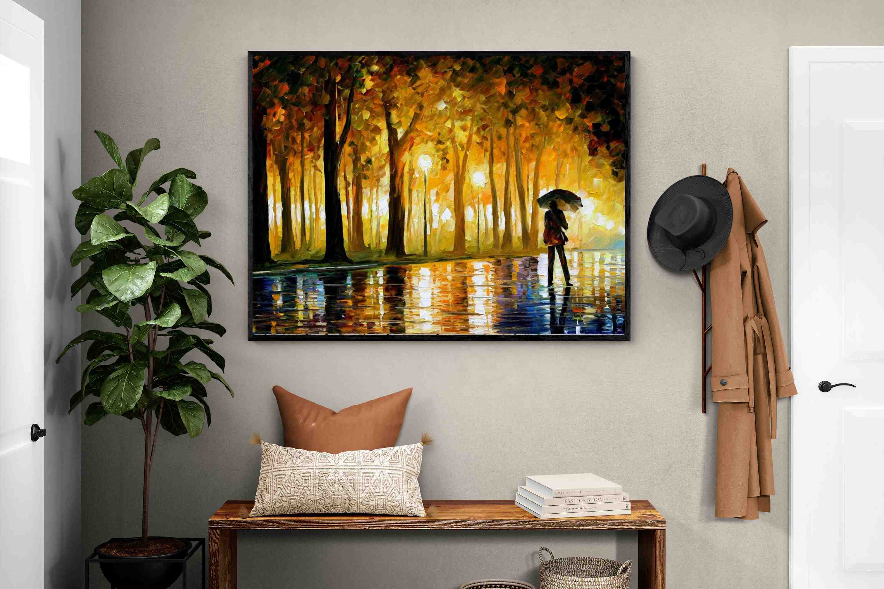 "Alley by the River" by Leonid Afremov captures the serene beauty of an autumn evening. The glowing streetlights and autumnal hues reflect beautifully on the wet pavement, creating a peaceful, glowing atmosphere. This painting, with its rich textures and dynamic colours, evokes a sense of warmth and nostalgia, making it a perfect piece of wall art for a contemporary home, bringing vibrancy and comfort to any space.