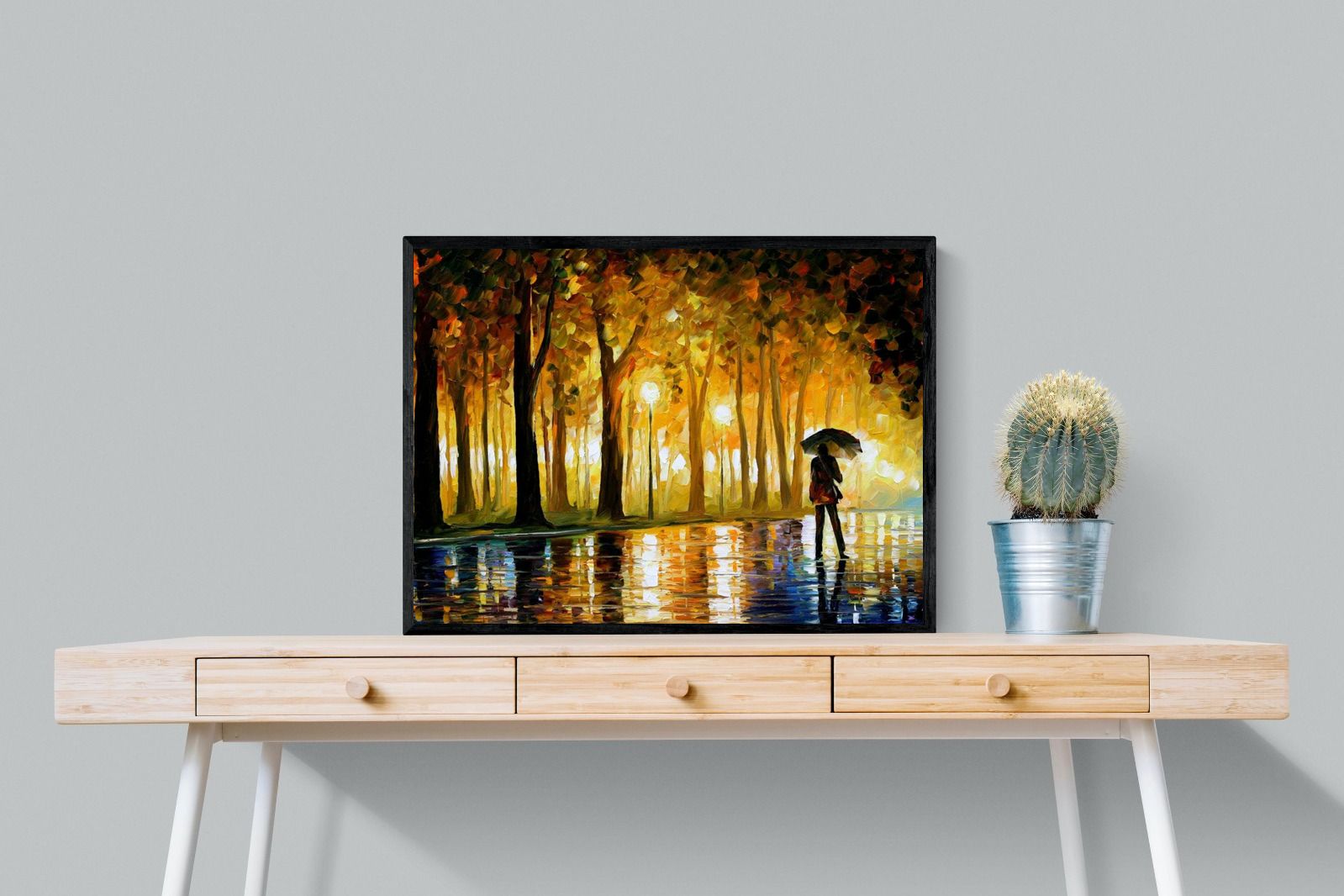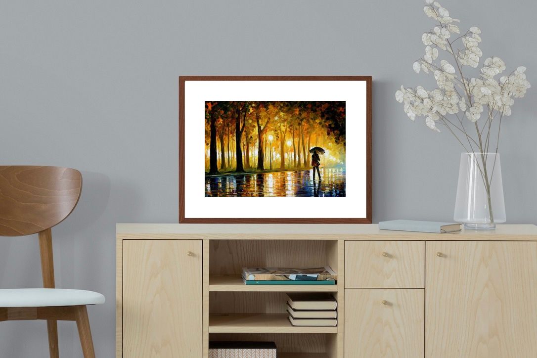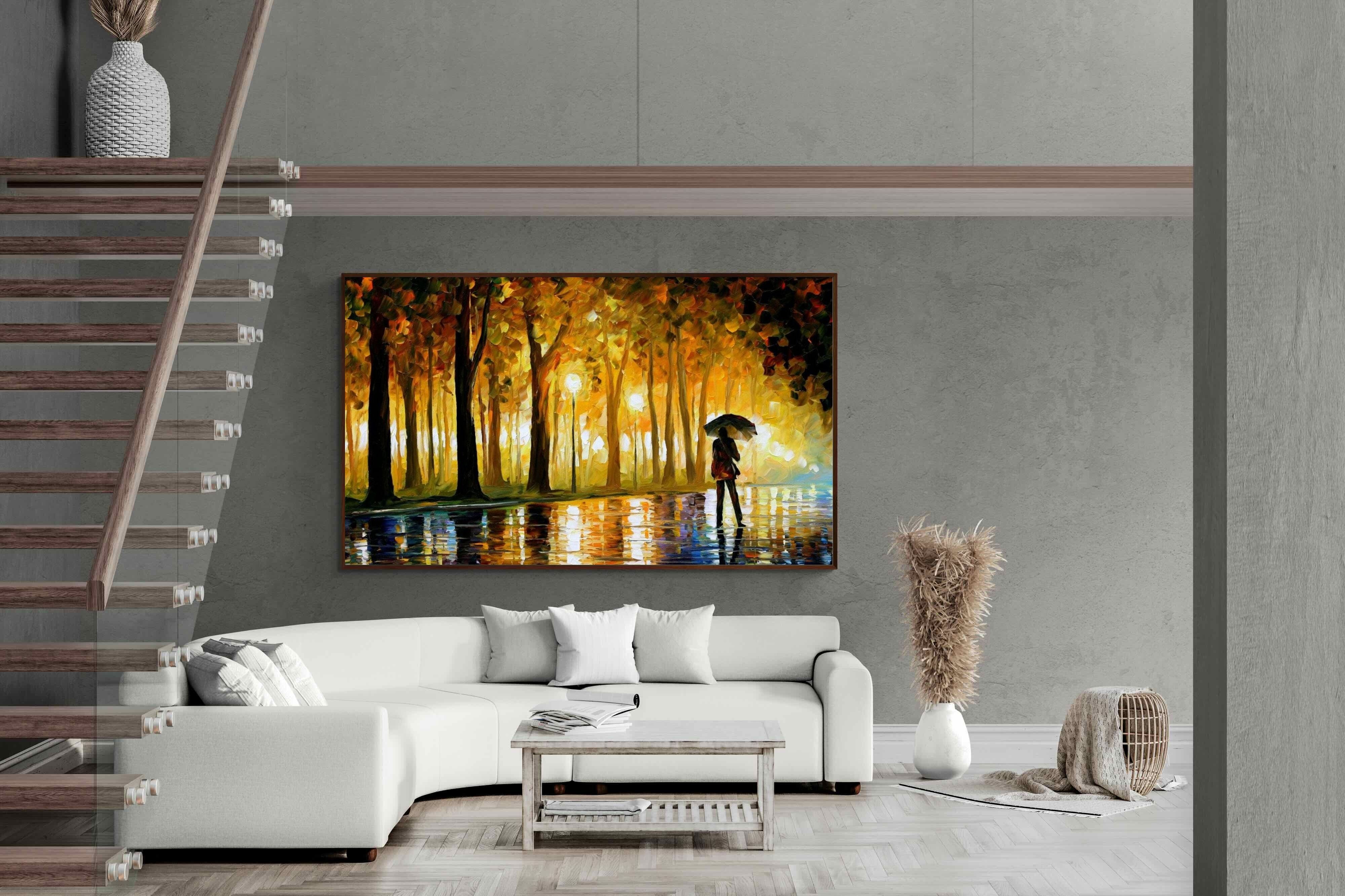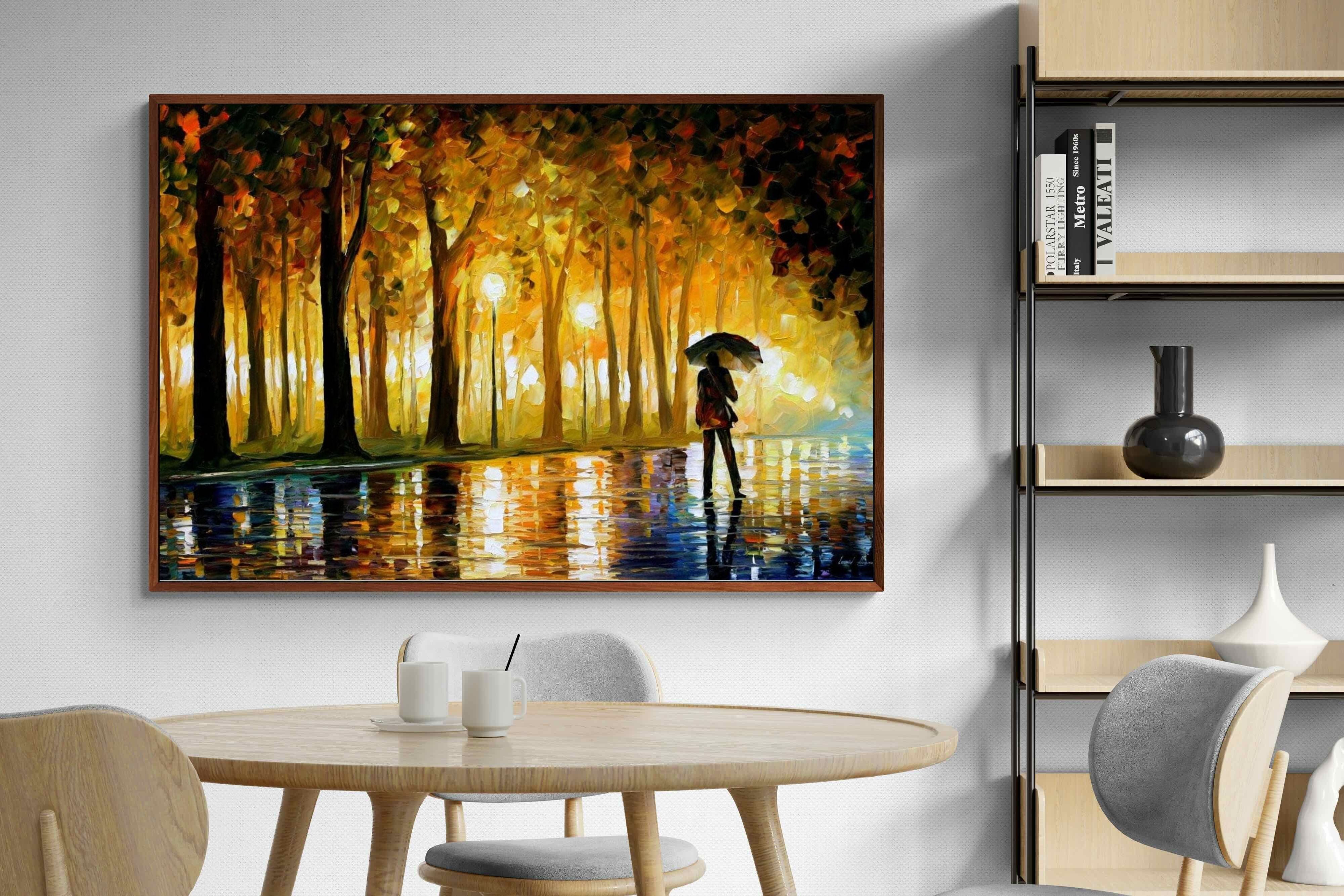 "Alley by the River" by Leonid Afremov captures the serene beauty of an autumn evening. The glowing streetlights and autumnal hues reflect beautifully on the wet pavement, creating a peaceful, glowing atmosphere. This painting, with its rich textures and dynamic colours, evokes a sense of warmth and nostalgia, making it a perfect piece of wall art for a contemporary home, bringing vibrancy and comfort to any space.