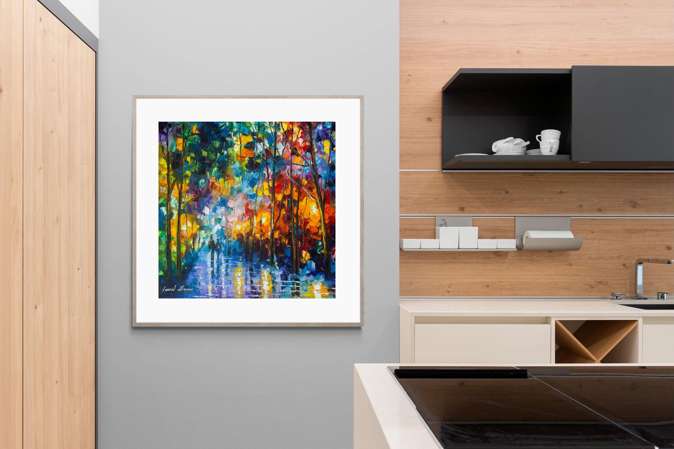 Blue Feelings" by Leonid Afremov is a captivating depiction of autumnal beauty in vibrant hues. The vivid blue reflections in the water juxtaposed with fiery autumn leaves create a serene, yet emotionally rich atmosphere. The scene of two figures walking in the distance under the glowing lights brings warmth to the cool surroundings, making it an ideal piece for any contemporary home in need of striking, colourful artwork.