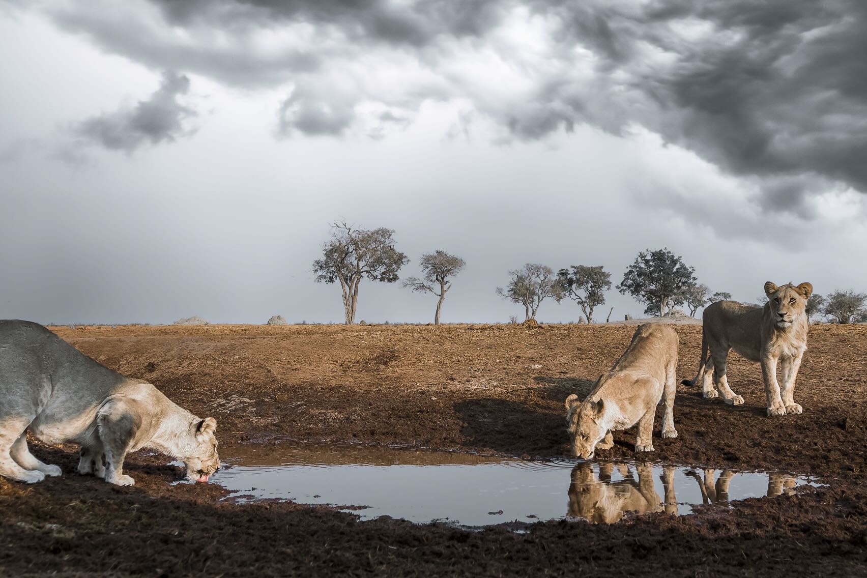Lionesses Drinking Under Stormy African Sky – Moody Wildlife Art for Contemporary Spaces