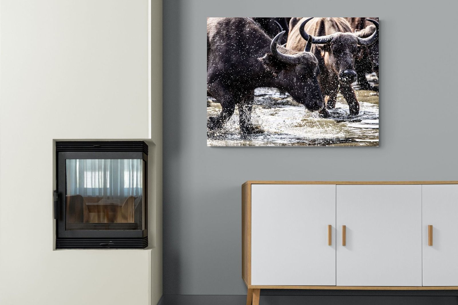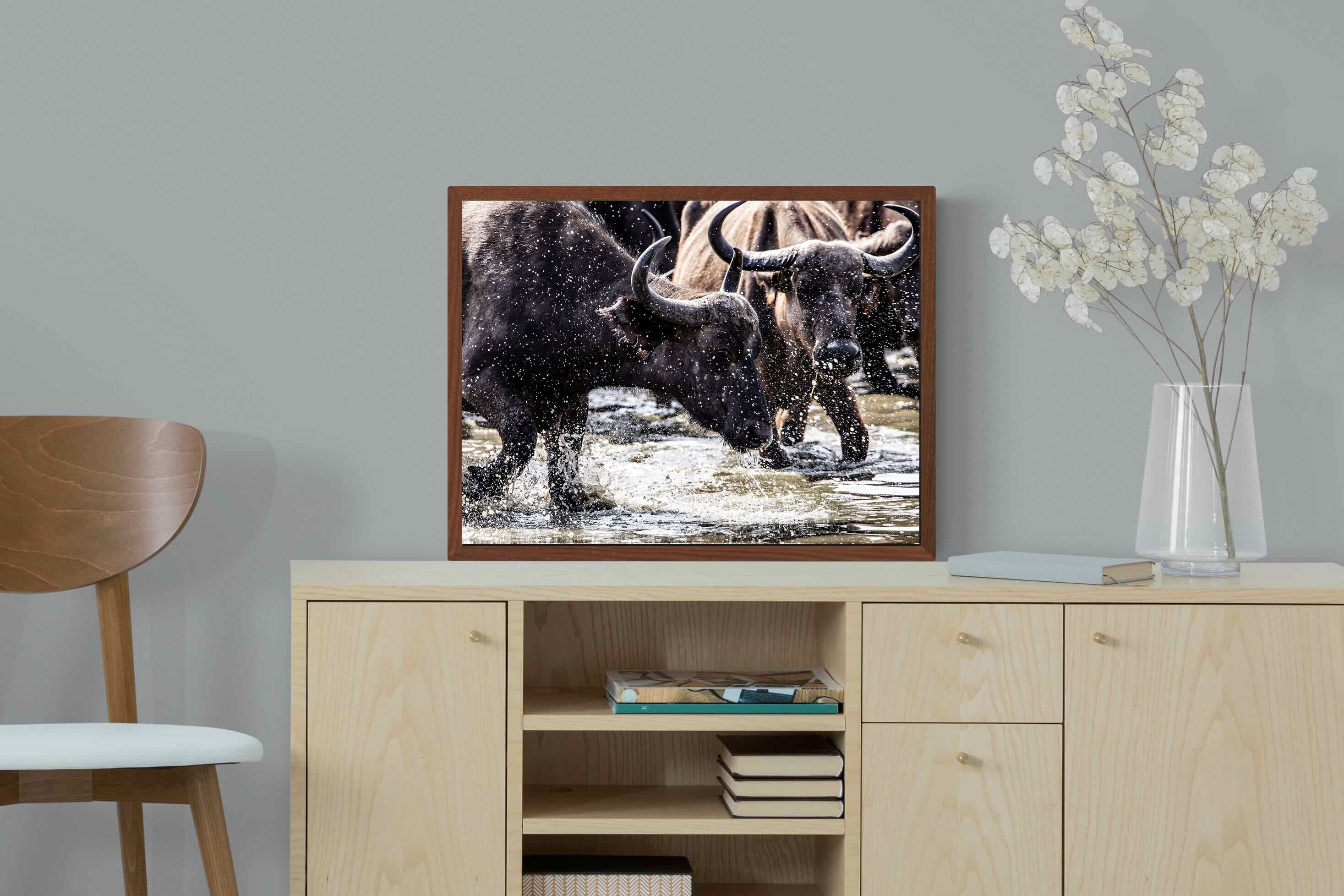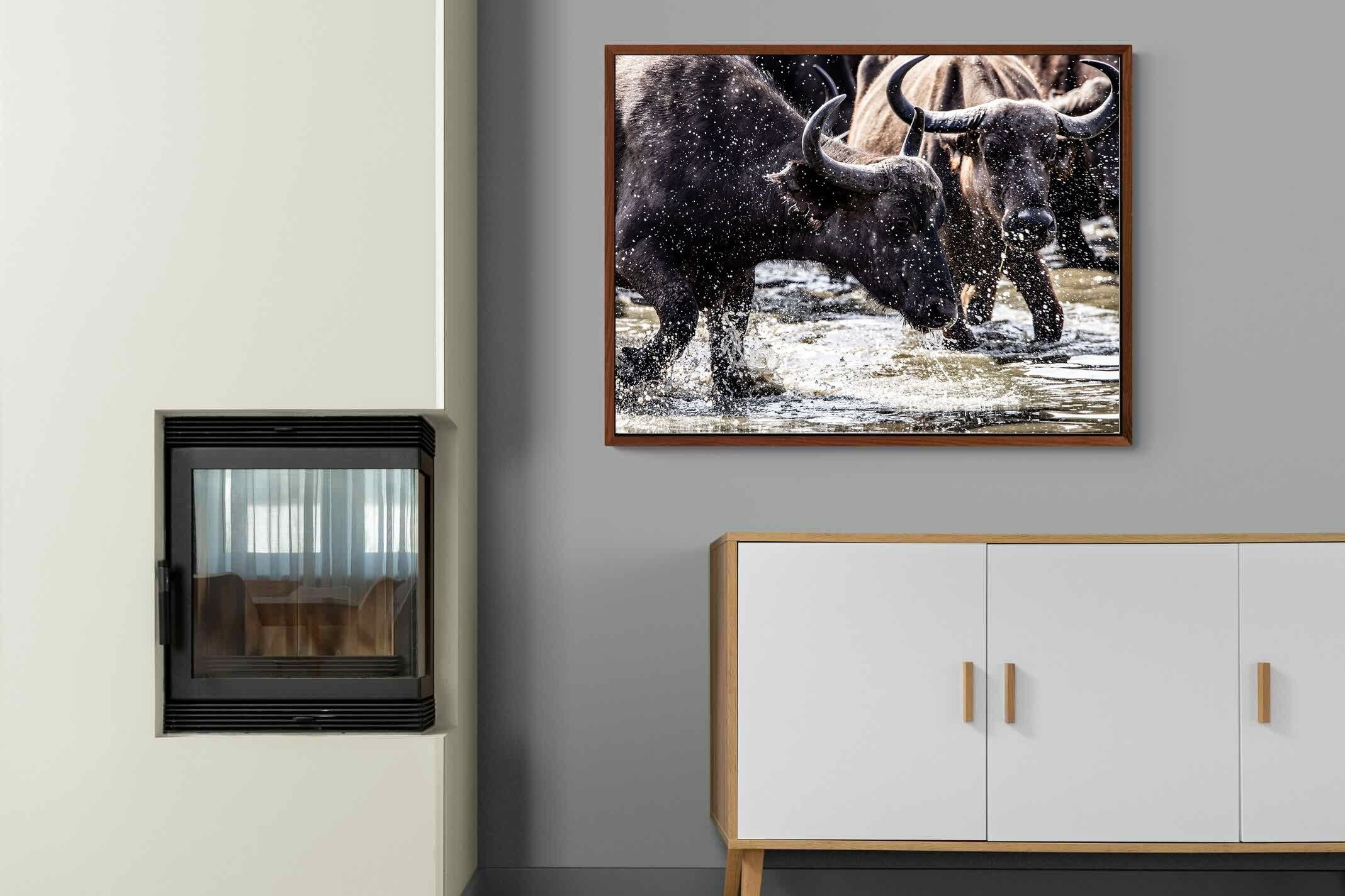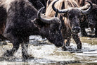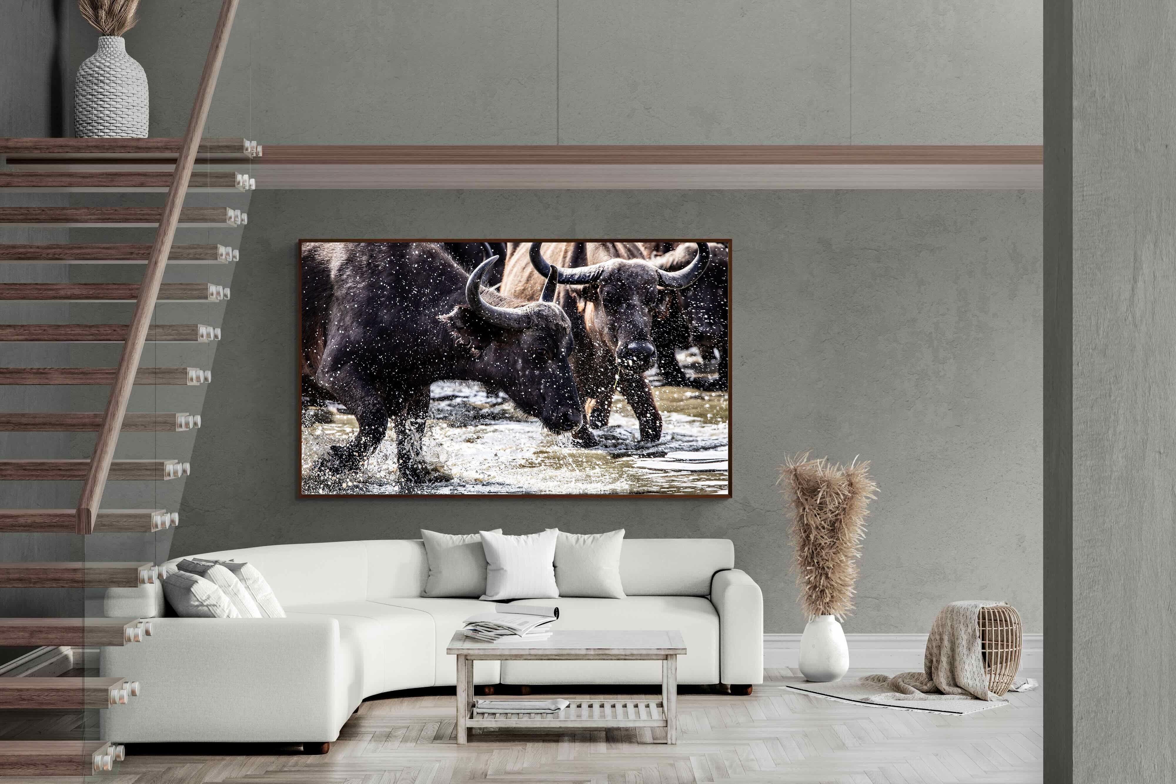 Shot by Jenny Hishin, this dynamic image of buffalo splashing through water captures the raw energy and motion of wildlife in action. The splattering water droplets and powerful movement of the buffalo convey a sense of vitality and freedom. It would be an inspiring piece for wall art in a contemporary home, adding a sense of dynamism and natural beauty to the space.