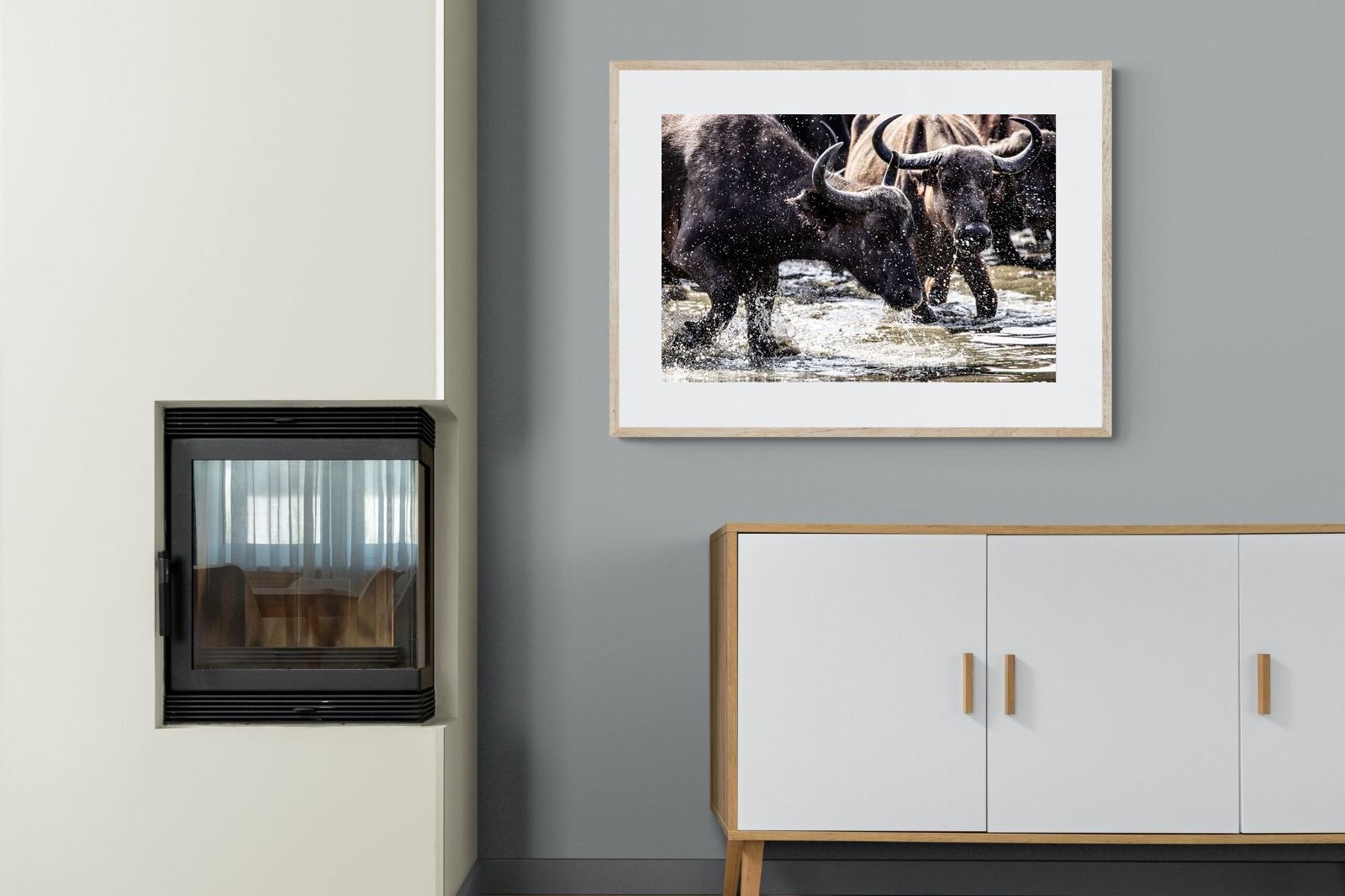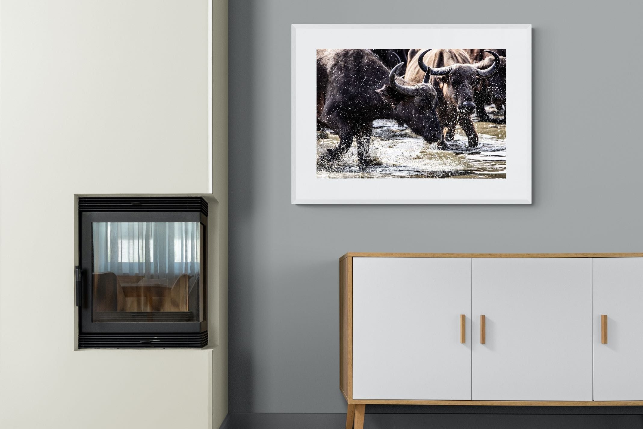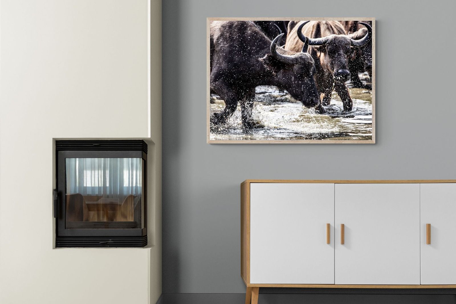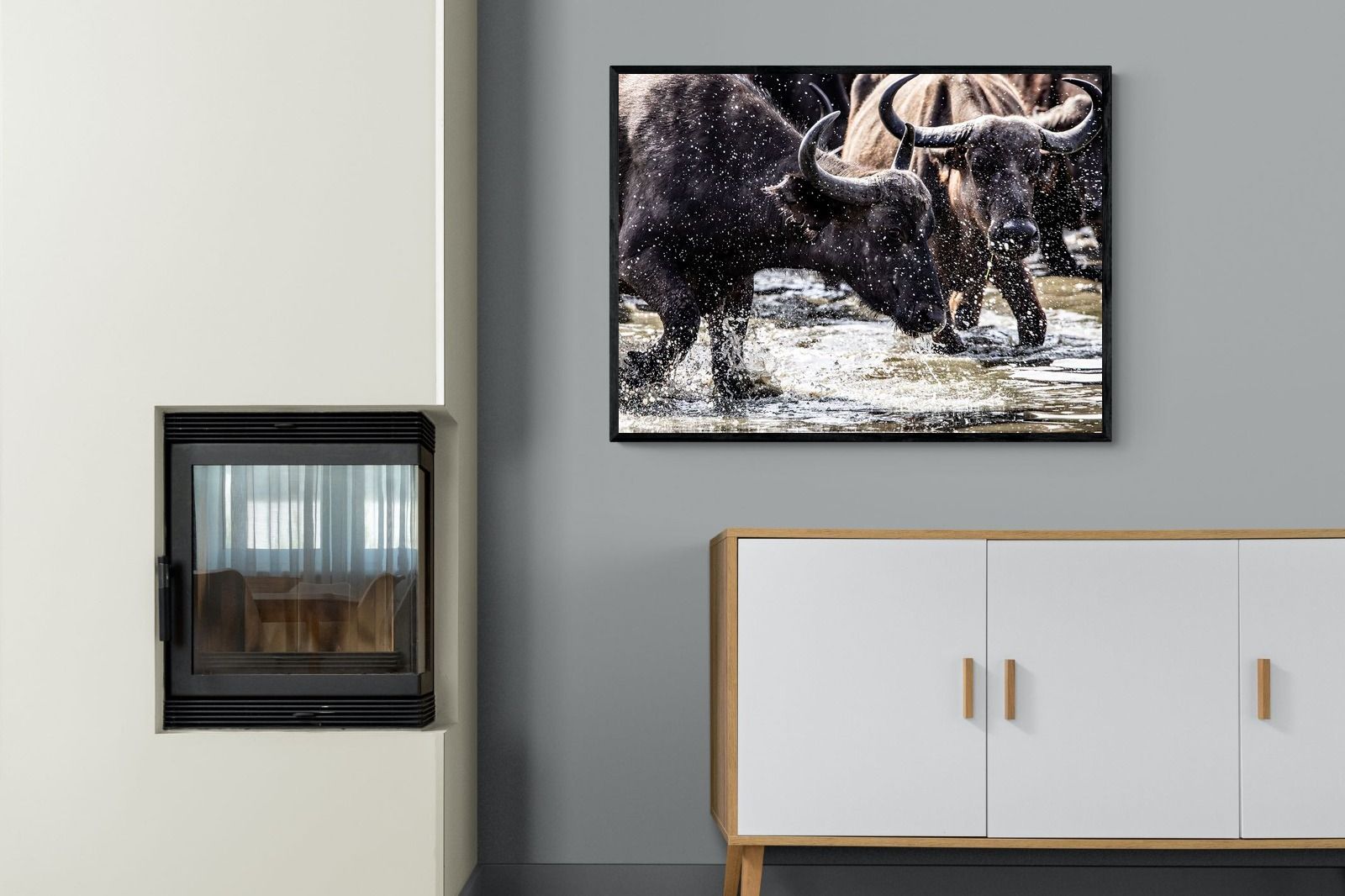 Shot by Jenny Hishin, this dynamic image of buffalo splashing through water captures the raw energy and motion of wildlife in action. The splattering water droplets and powerful movement of the buffalo convey a sense of vitality and freedom. It would be an inspiring piece for wall art in a contemporary home, adding a sense of dynamism and natural beauty to the space.