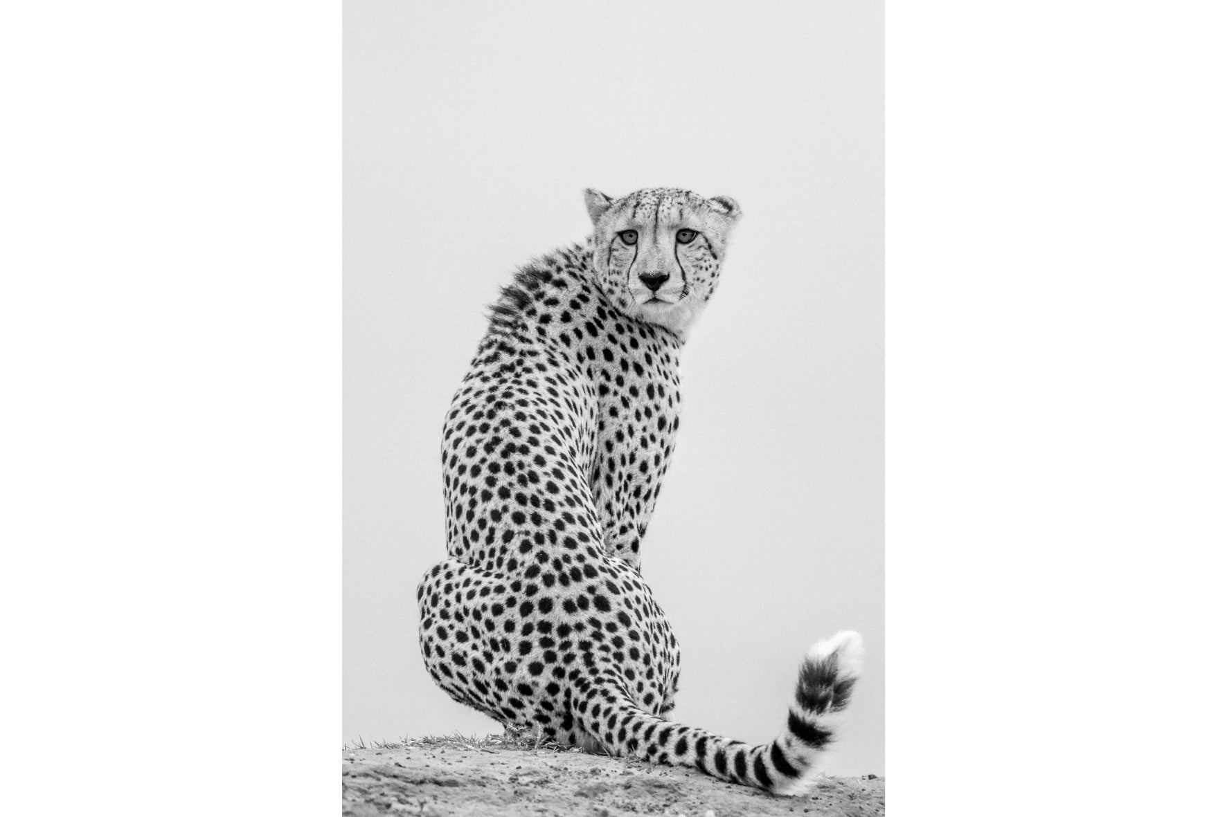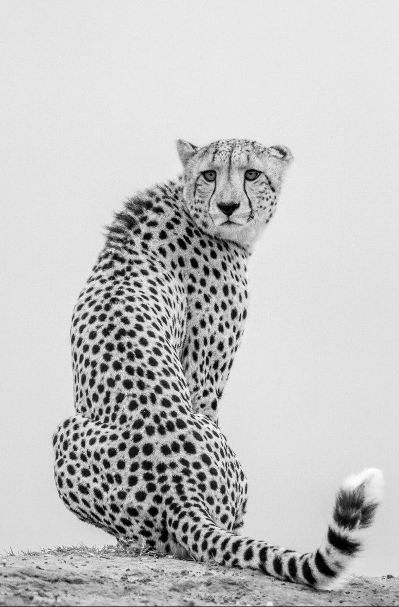 This photograph presents a poised cheetah captured in refined black and white detail. The minimalist backdrop isolates the animal’s elegant form, highlighting distinctive markings and focused expression. The clean composition creates a gallery-quality wildlife portrait with striking visual clarity. Perfect for contemporary interiors, studies or curated safari-inspired spaces seeking sophistication, contrast and iconic African presence.