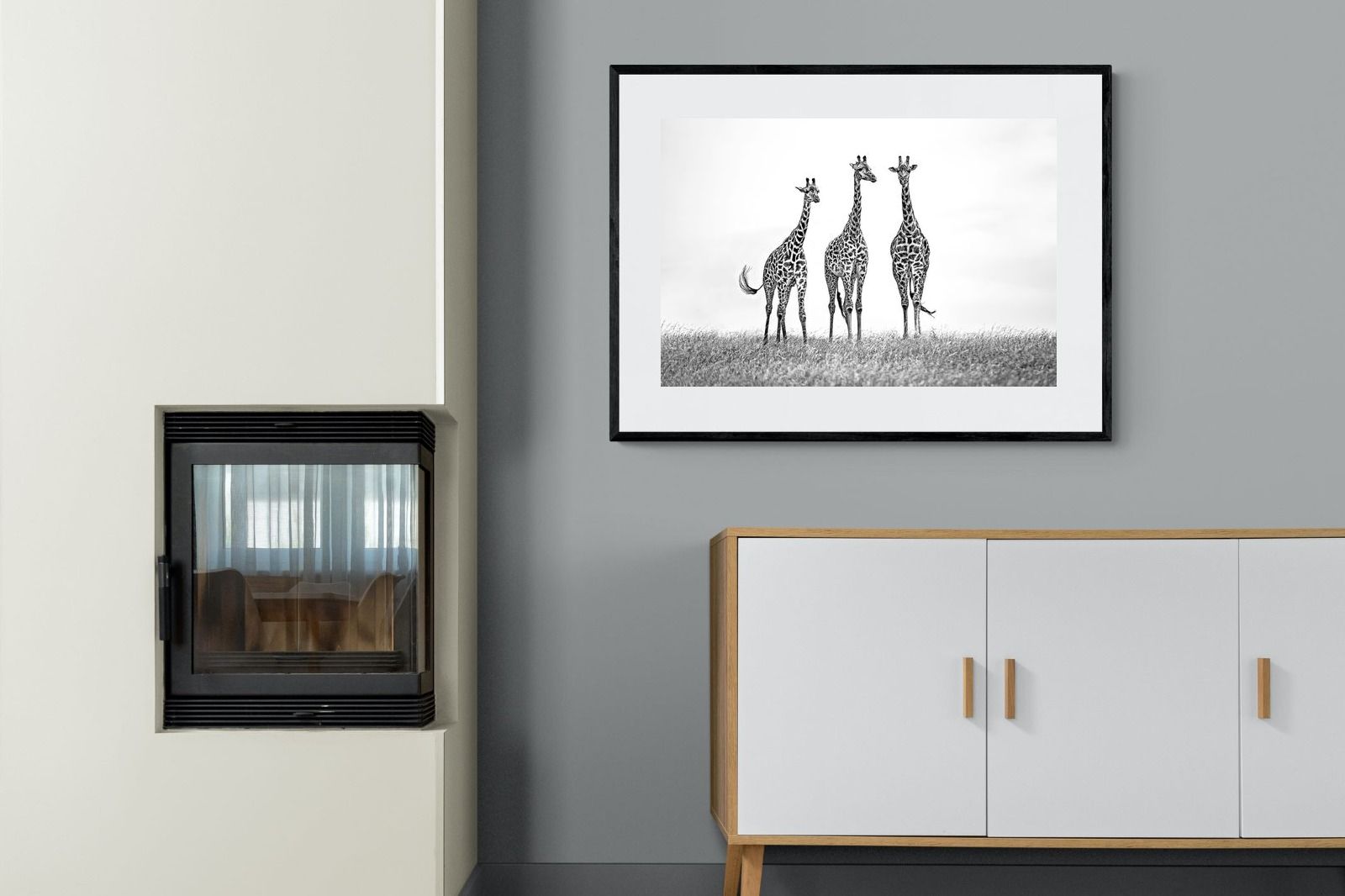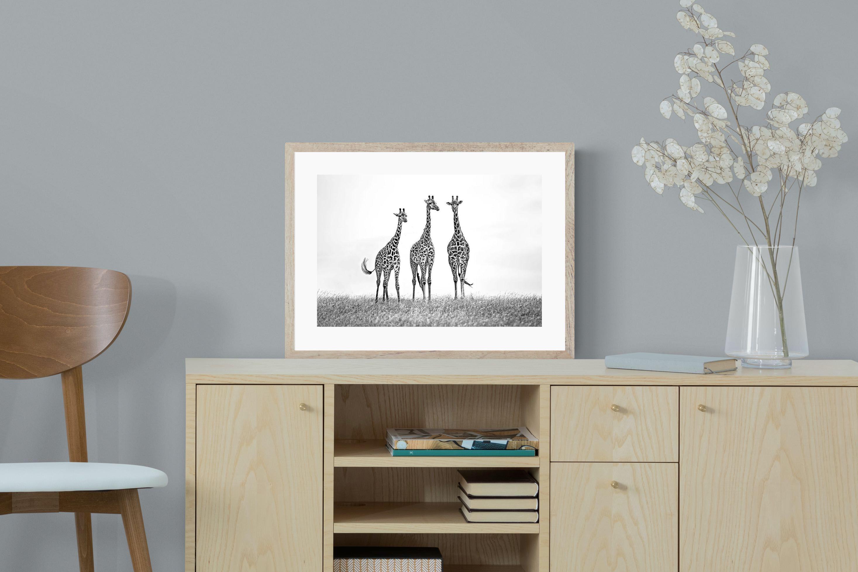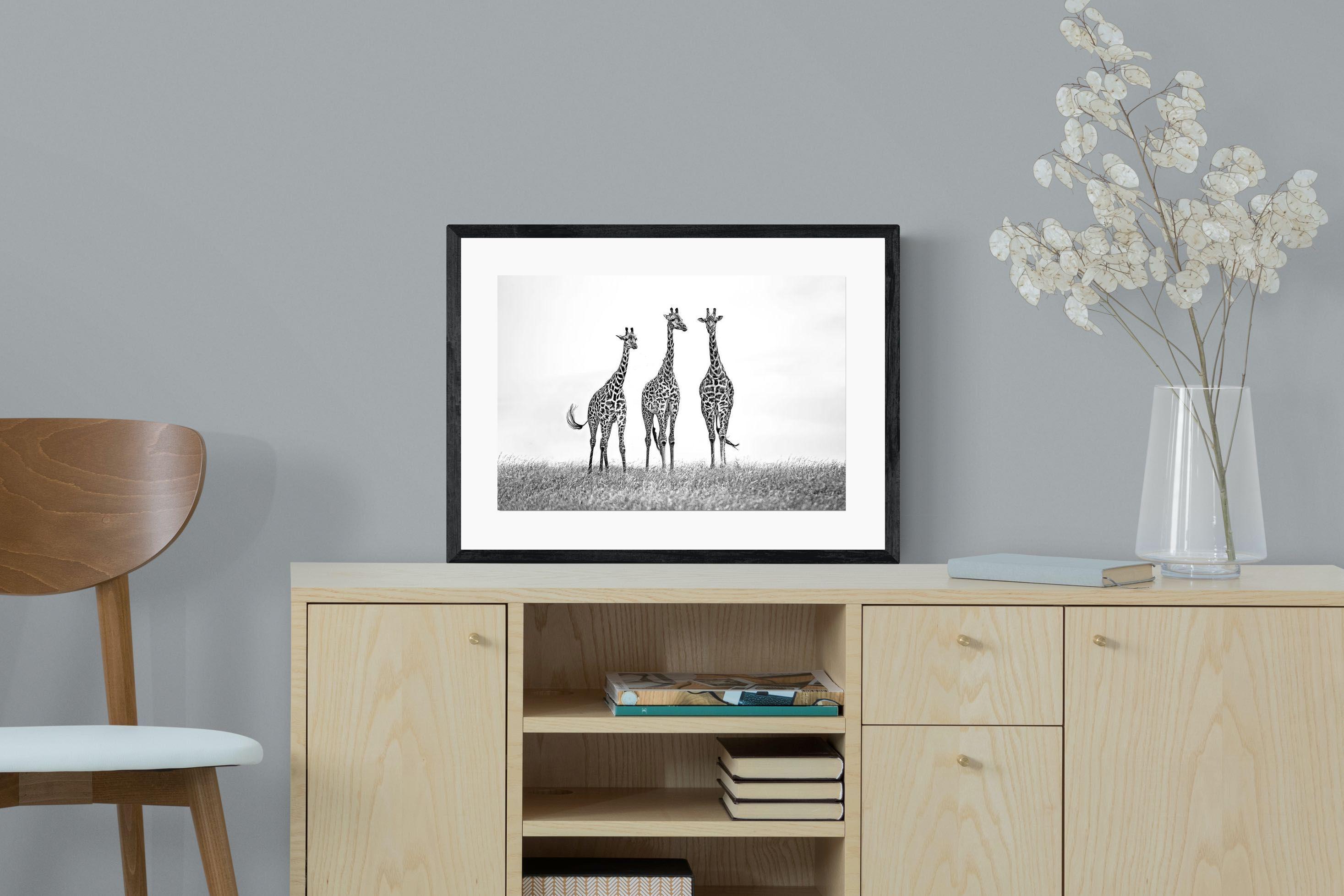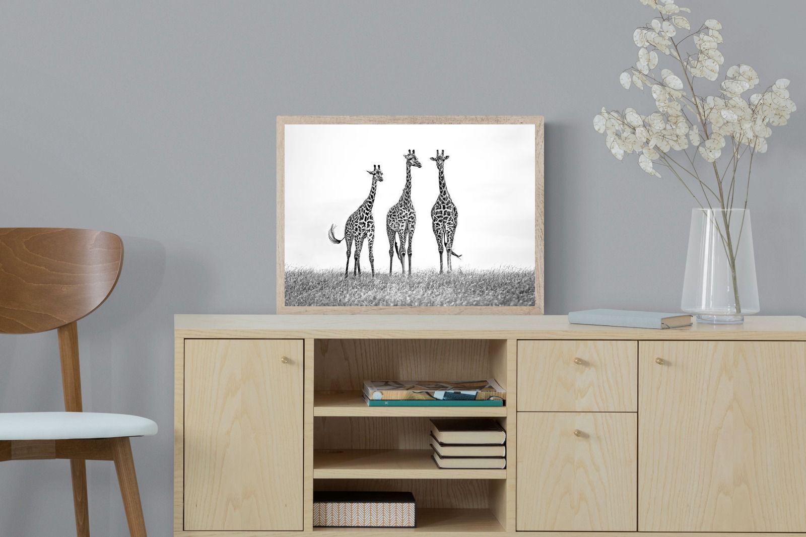 The trio of giraffes stands tall not just in stature but also in the symbolism of grace and peaceful coexistence. This sketch is not just an artistic representation; it's a call to appreciate the subtle beauty of the animal kingdom and the delicate balance of life on the African plains. The understated elegance of the charcoal medium adds depth to this representation, inviting viewers to explore themes of nature's diversity and the beauty of wildlife.