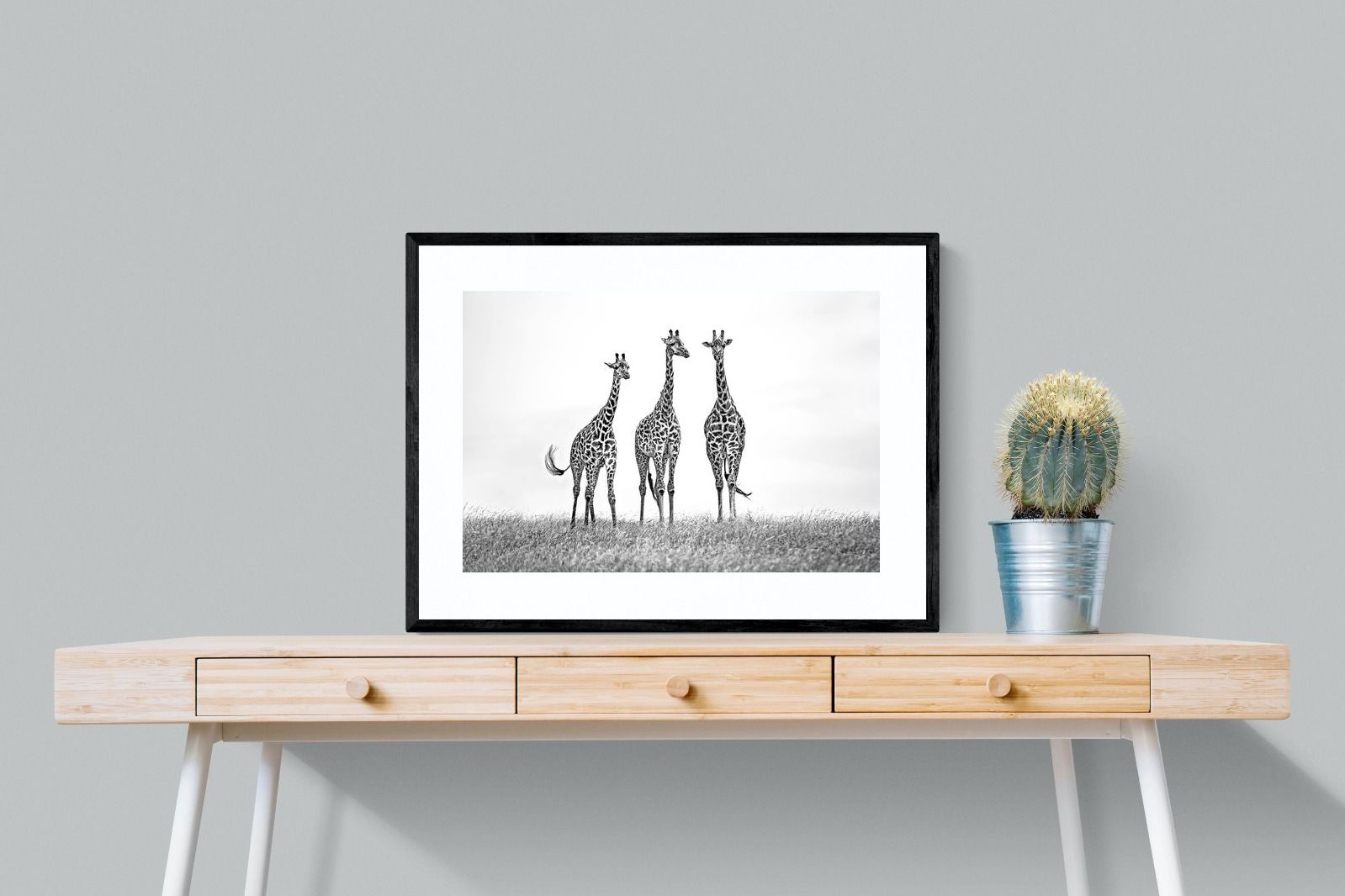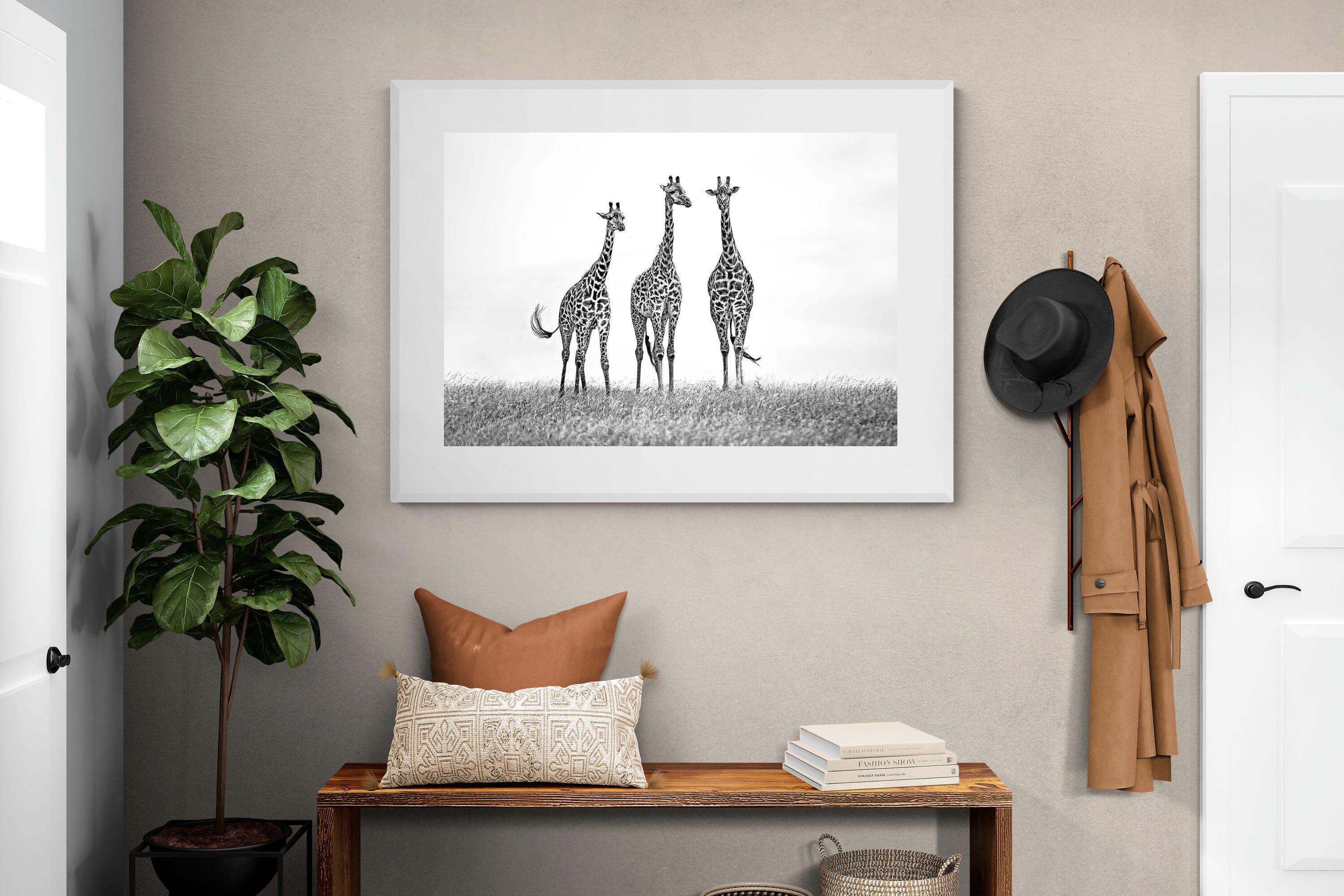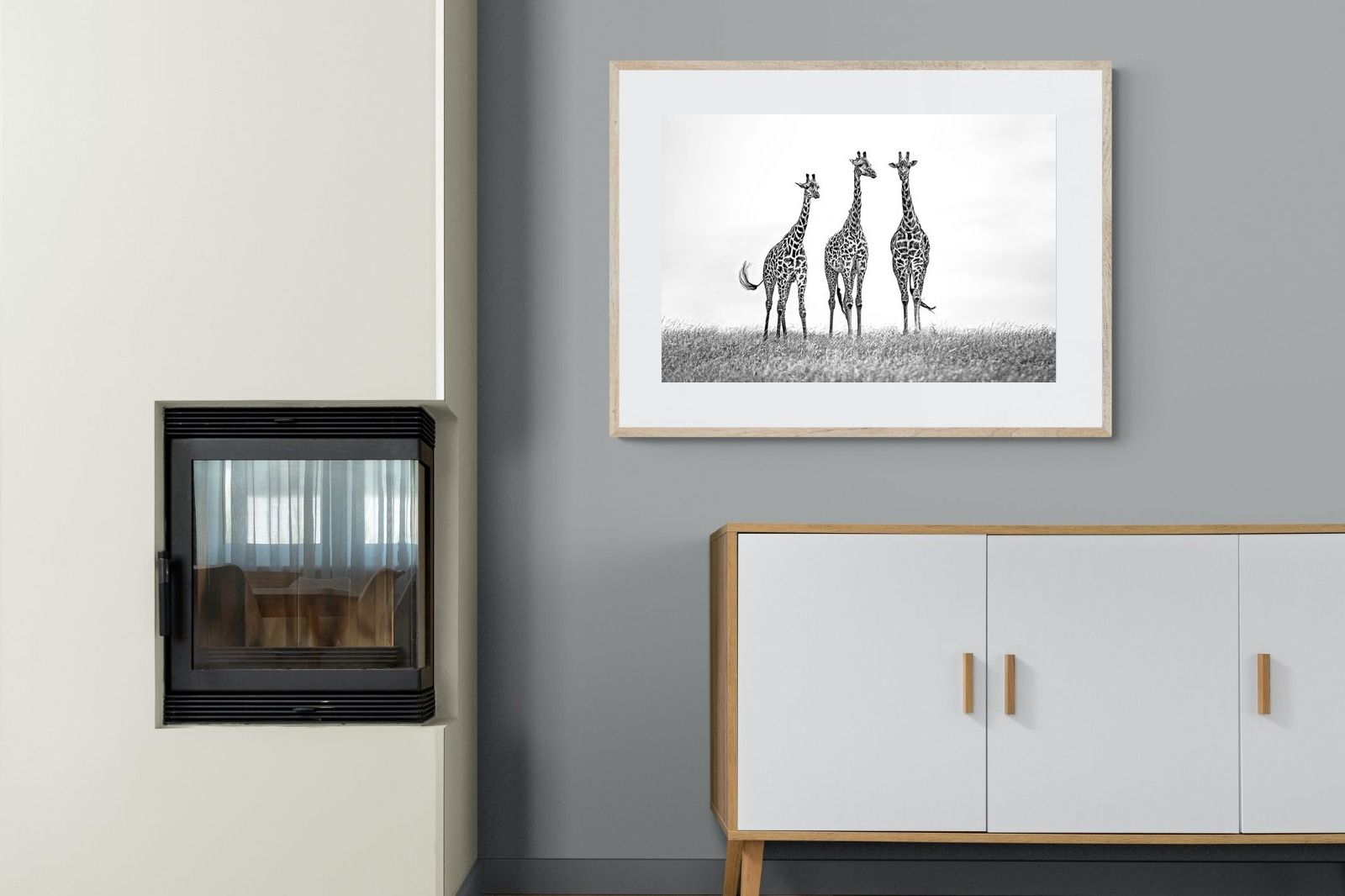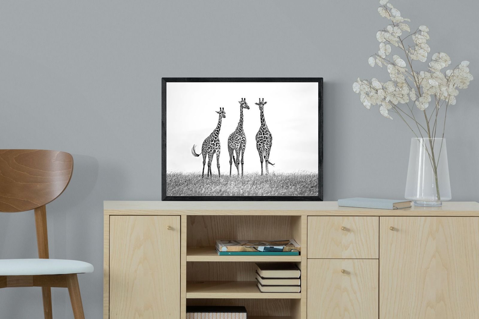 The trio of giraffes stands tall not just in stature but also in the symbolism of grace and peaceful coexistence. This sketch is not just an artistic representation; it's a call to appreciate the subtle beauty of the animal kingdom and the delicate balance of life on the African plains. The understated elegance of the charcoal medium adds depth to this representation, inviting viewers to explore themes of nature's diversity and the beauty of wildlife.