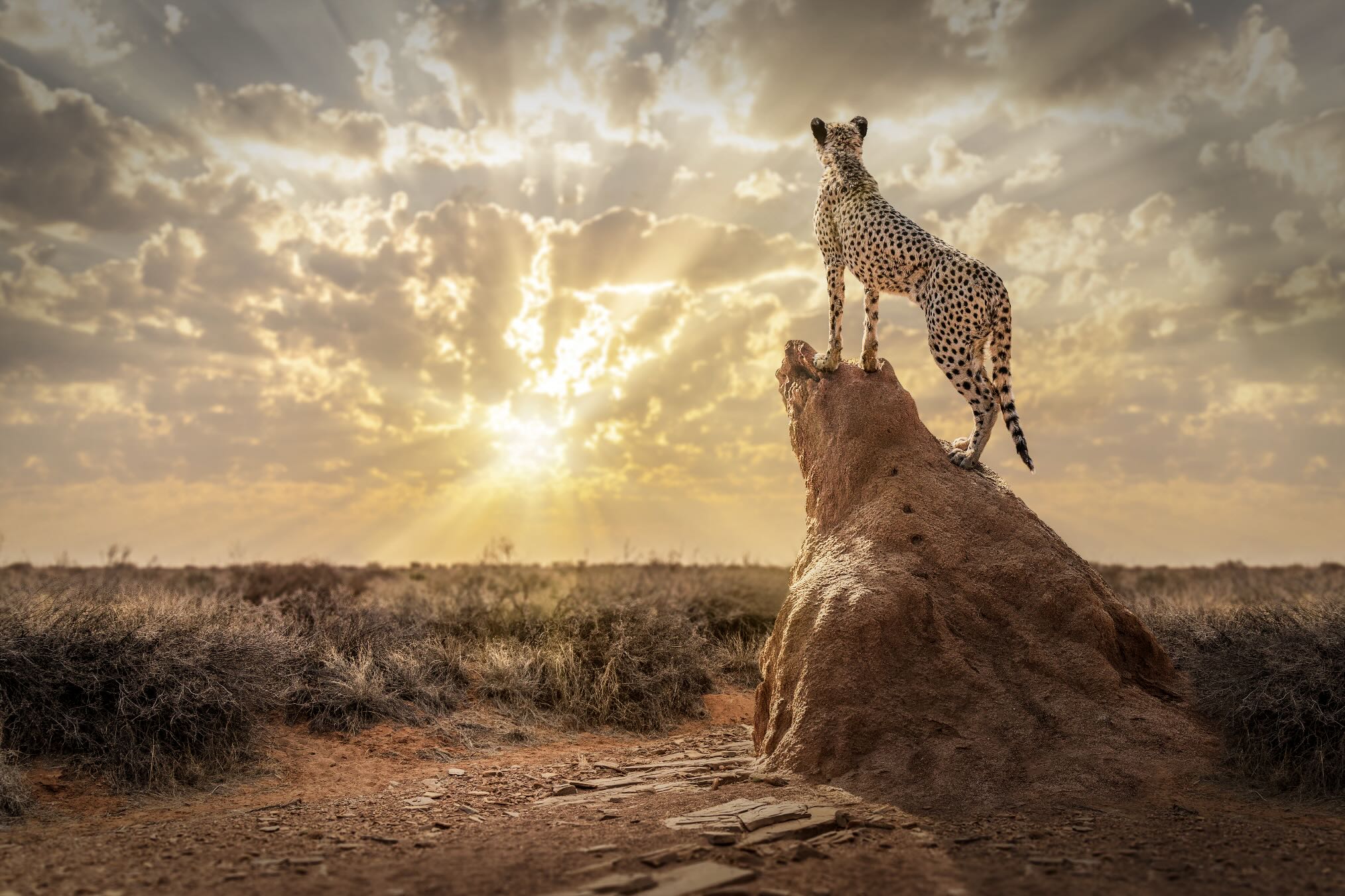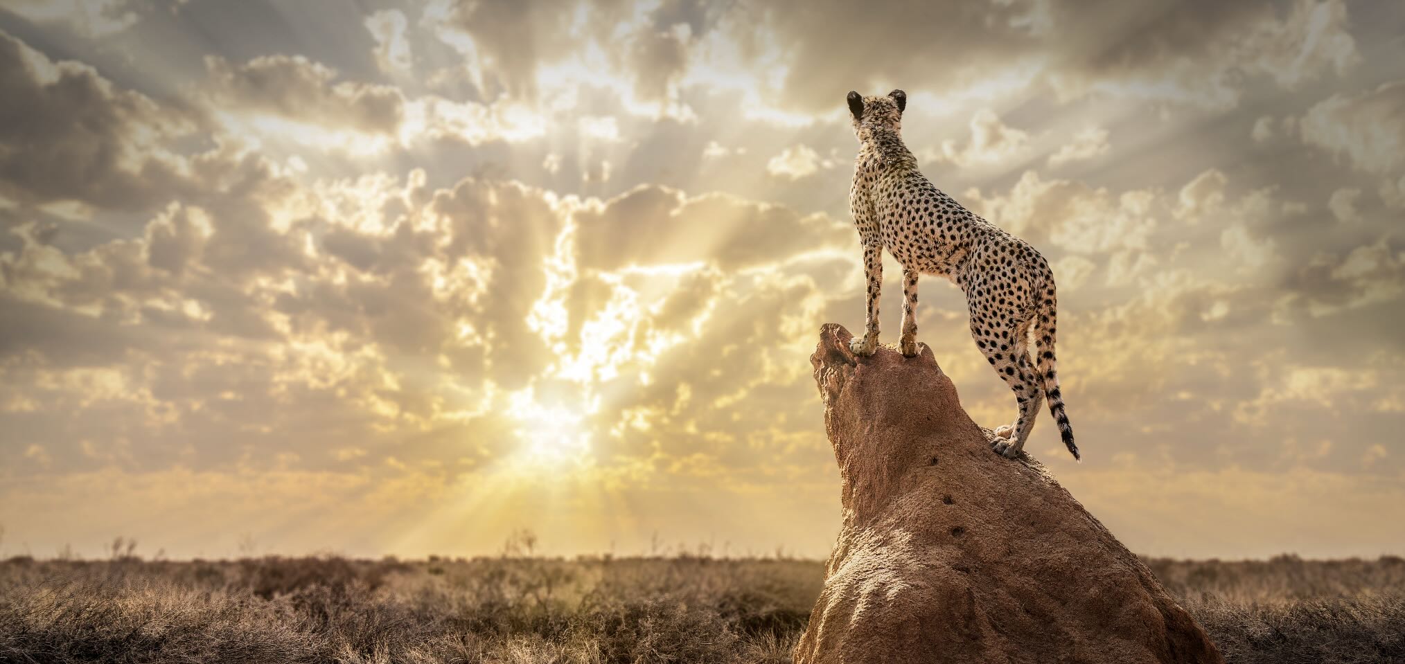 "King of the Savannah" captures the poised cheetah surveying the vast plains, framed against a dramatic sky. The striking black-and-white tones emphasize the grace and strength of this magnificent animal. Ideal for modern homes with an appreciation for wildlife and nature, this powerful image adds drama and depth to any space, serving as a reminder of the untamed beauty of the animal kingdom.