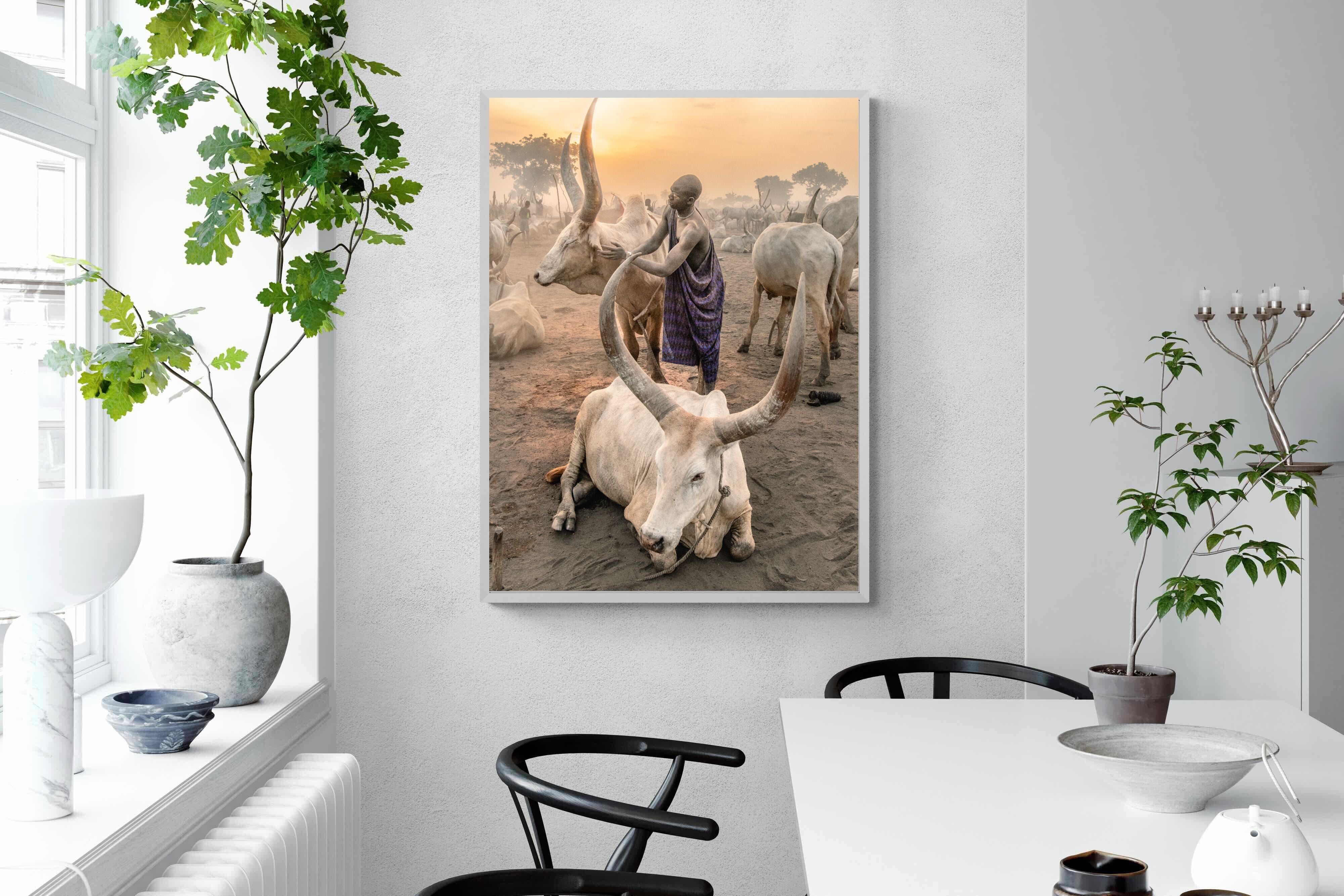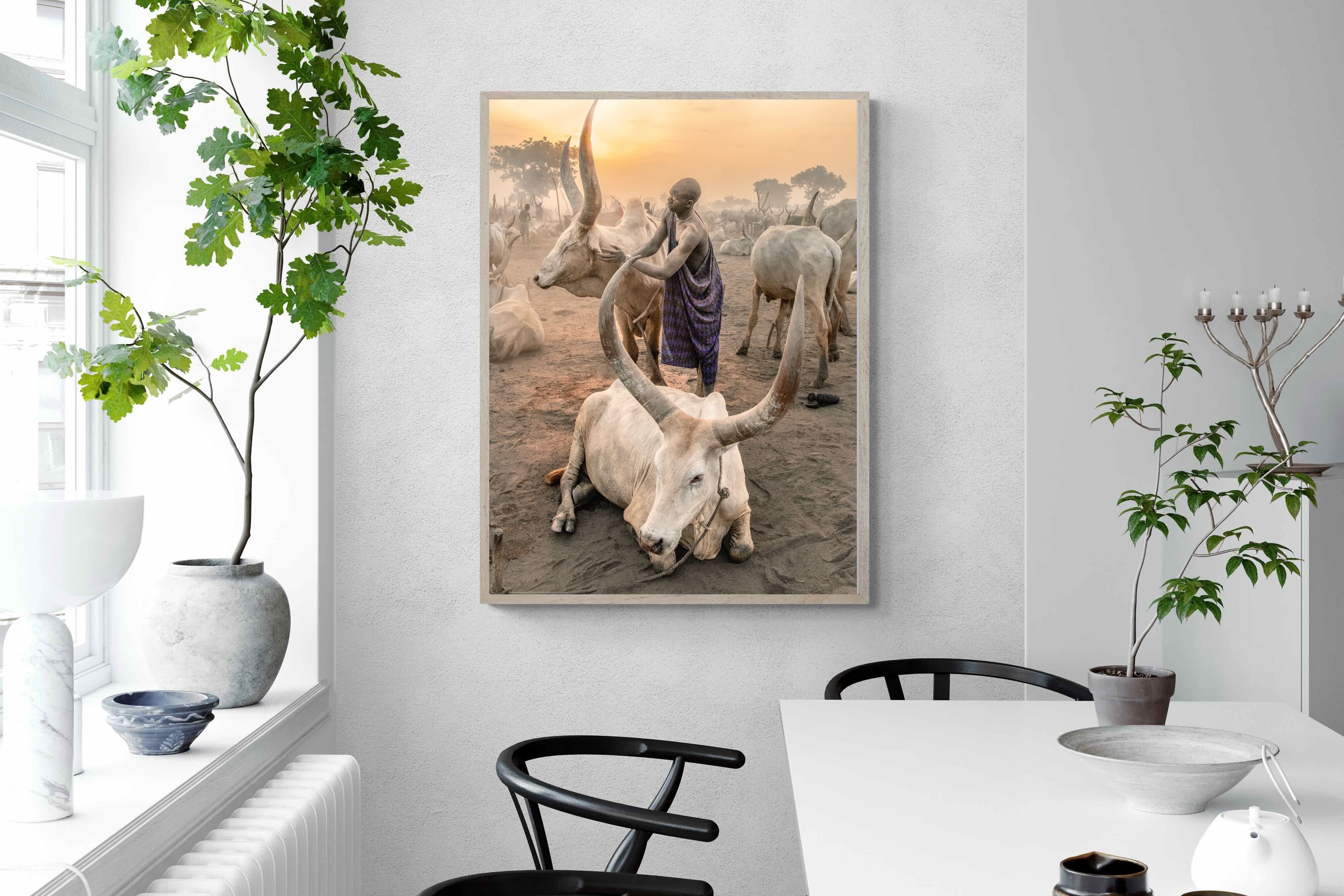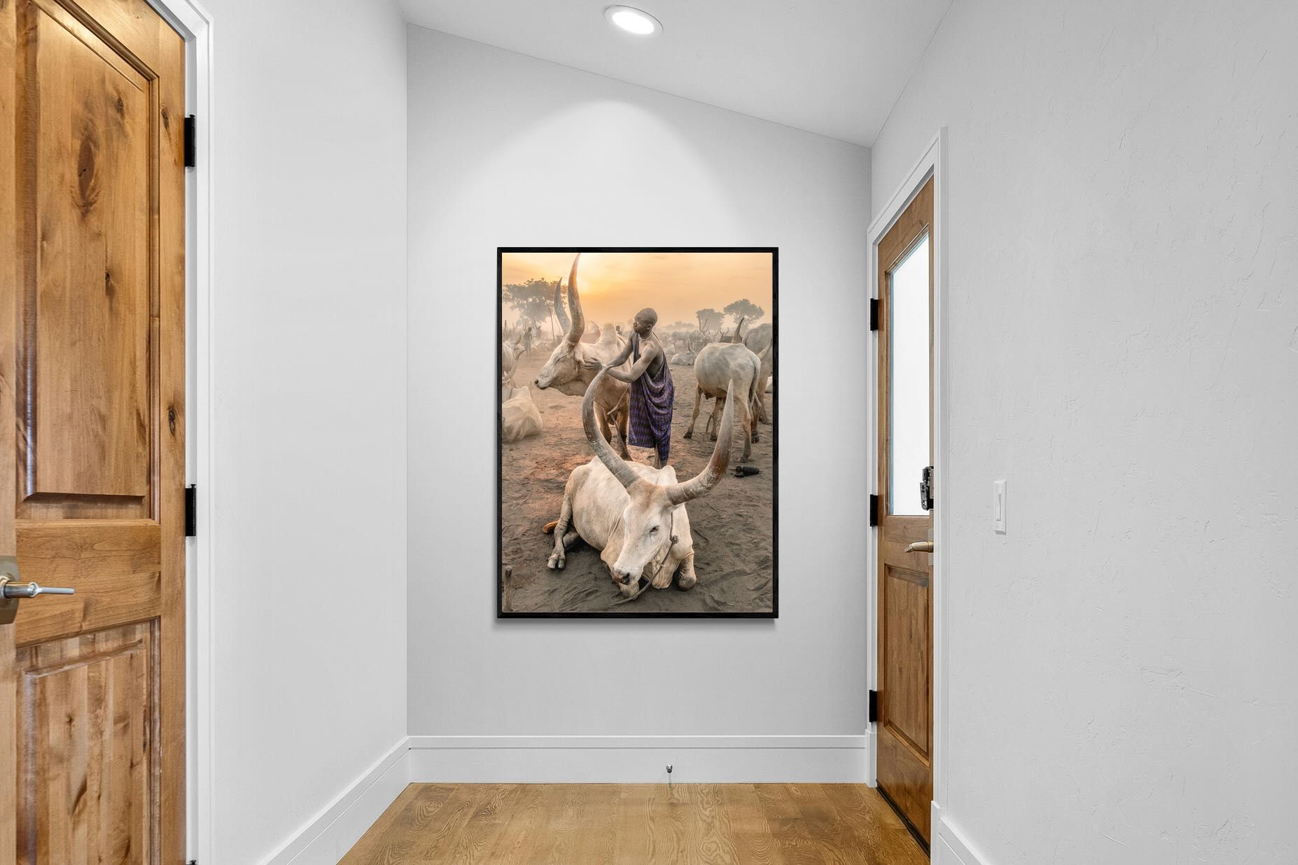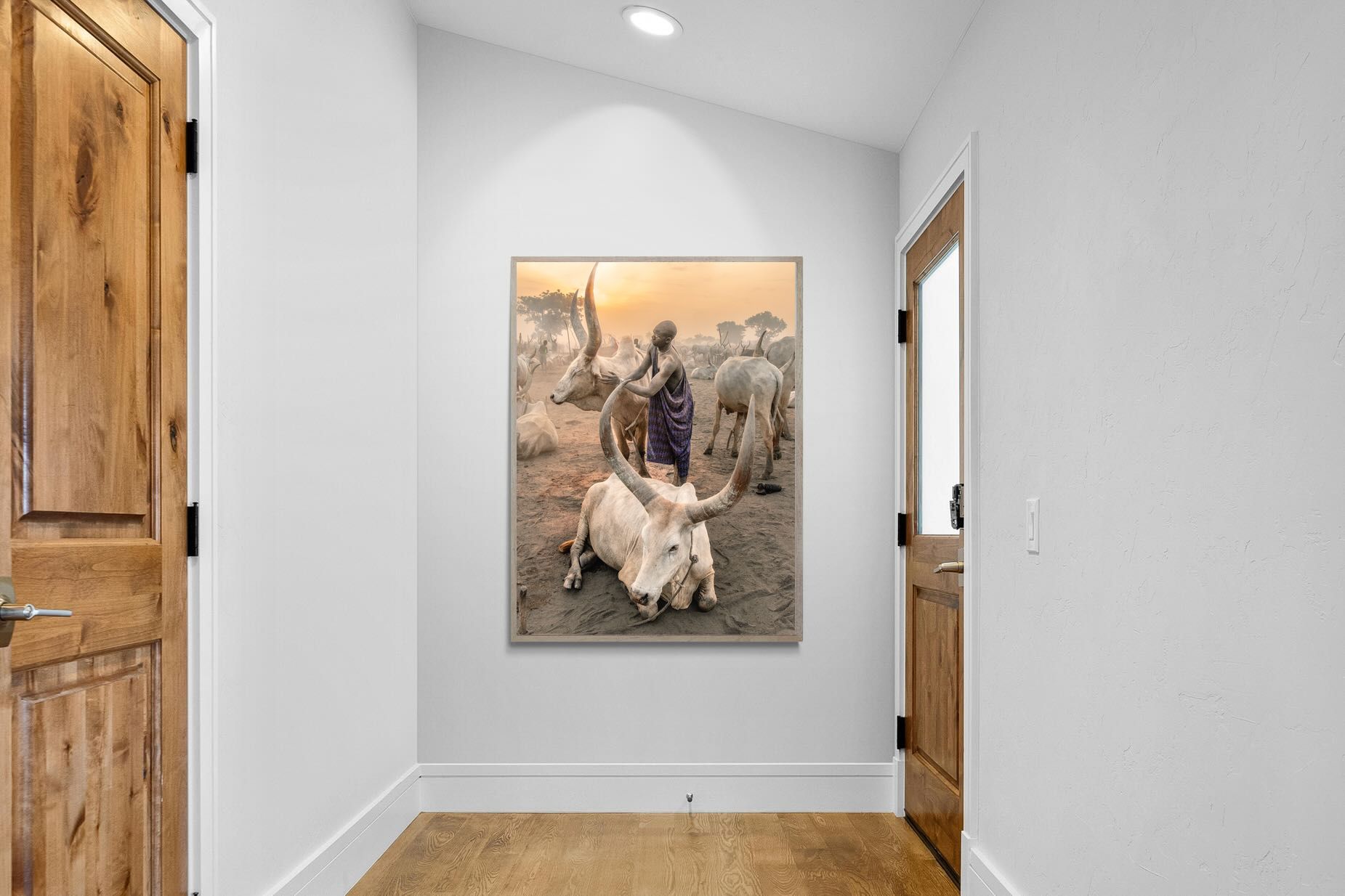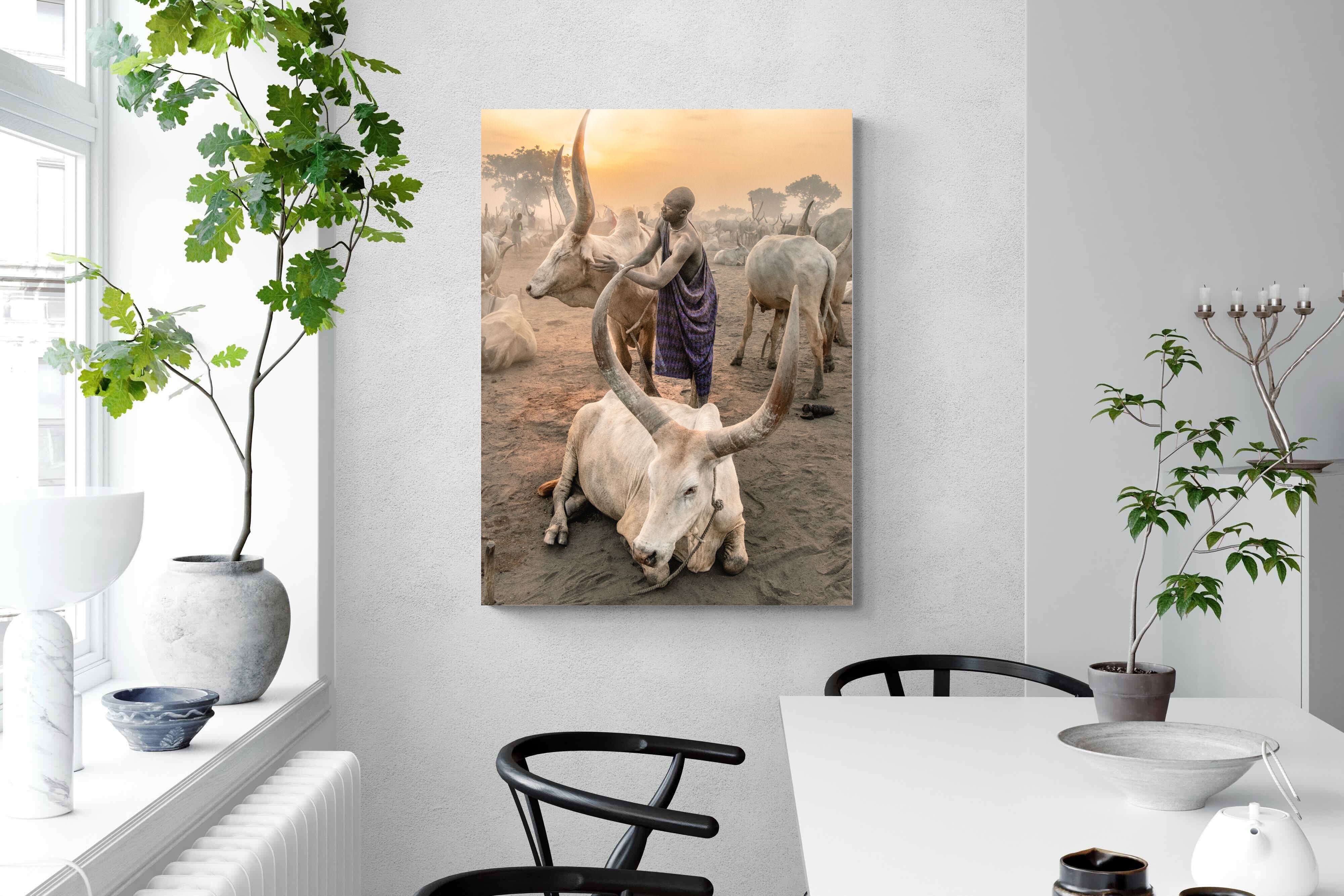 This powerful image captures a tranquil sunrise at a Mundari cattle camp in South Sudan, where a tribesman gently tends his prized Ankole-Watusi cattle. The soft morning light and dusty atmosphere create a cinematic sense of place and ritual. A compelling choice for contemporary homes or cultural spaces, this artwork honours tradition, dignity, and the profound bond between people and land. Rich in soul and photographic storytelling.