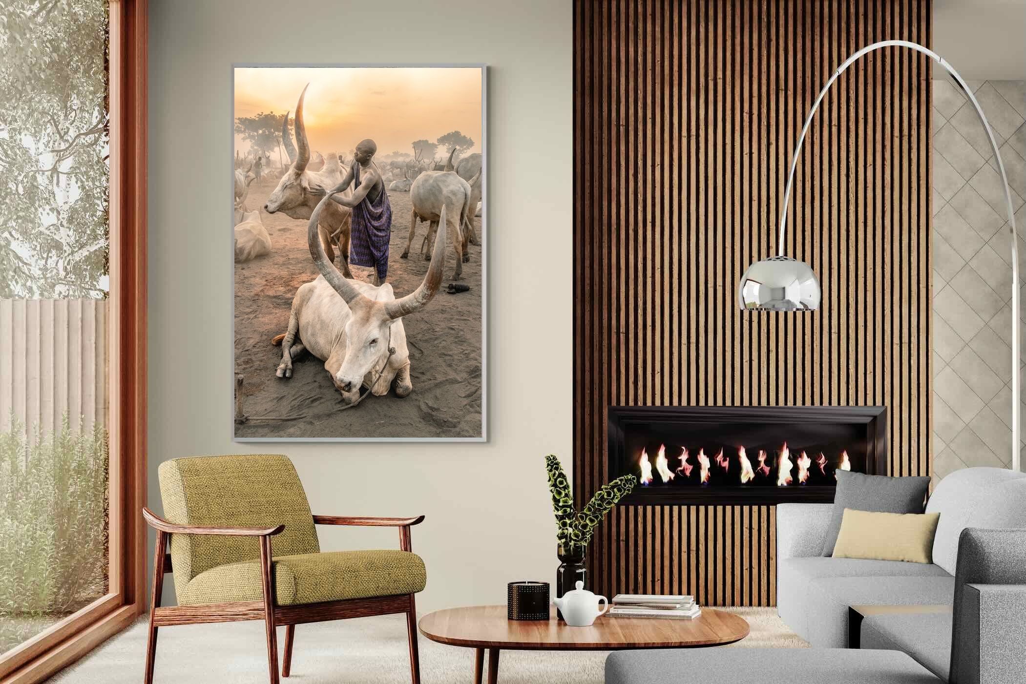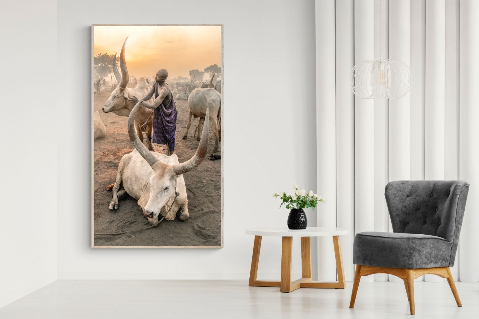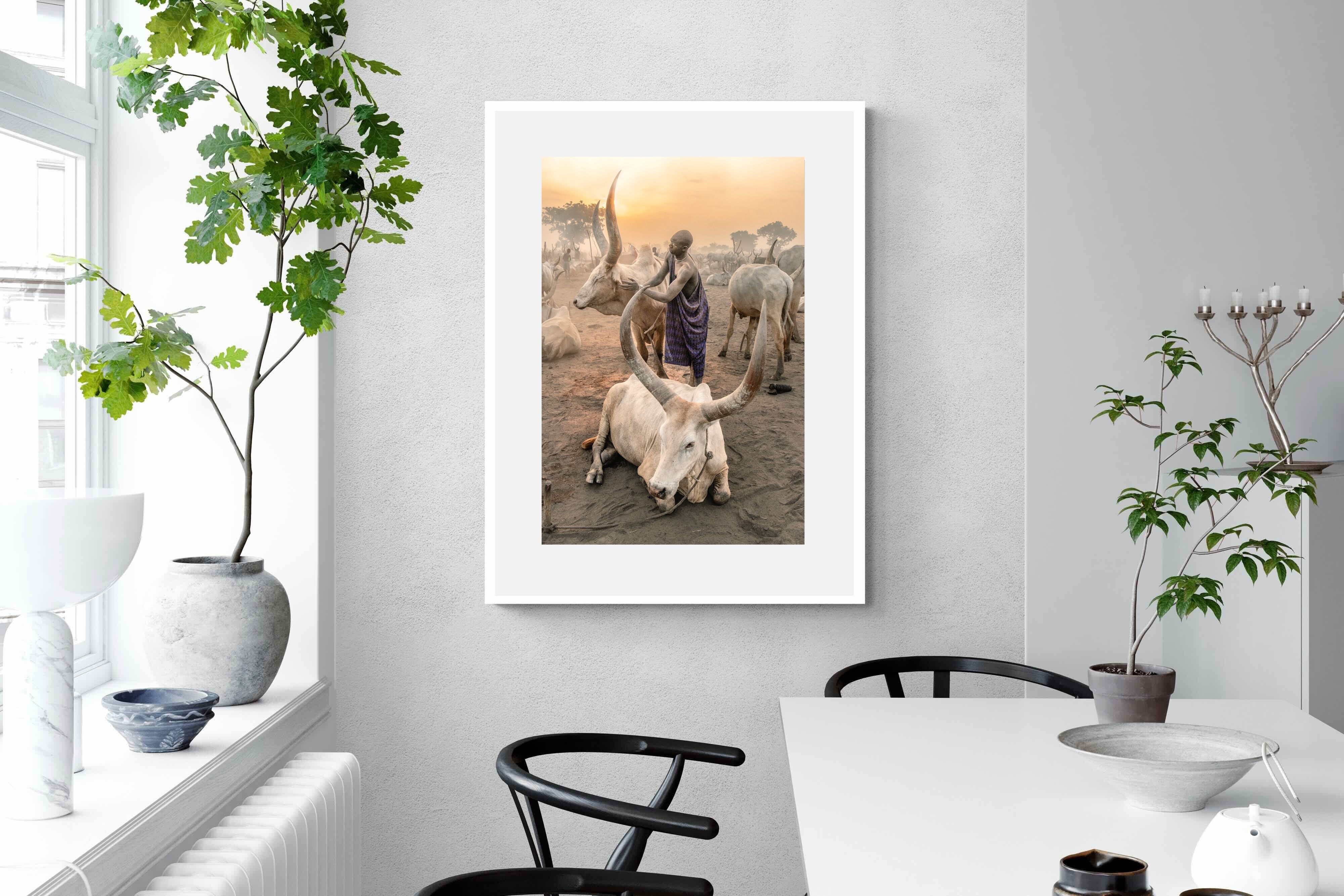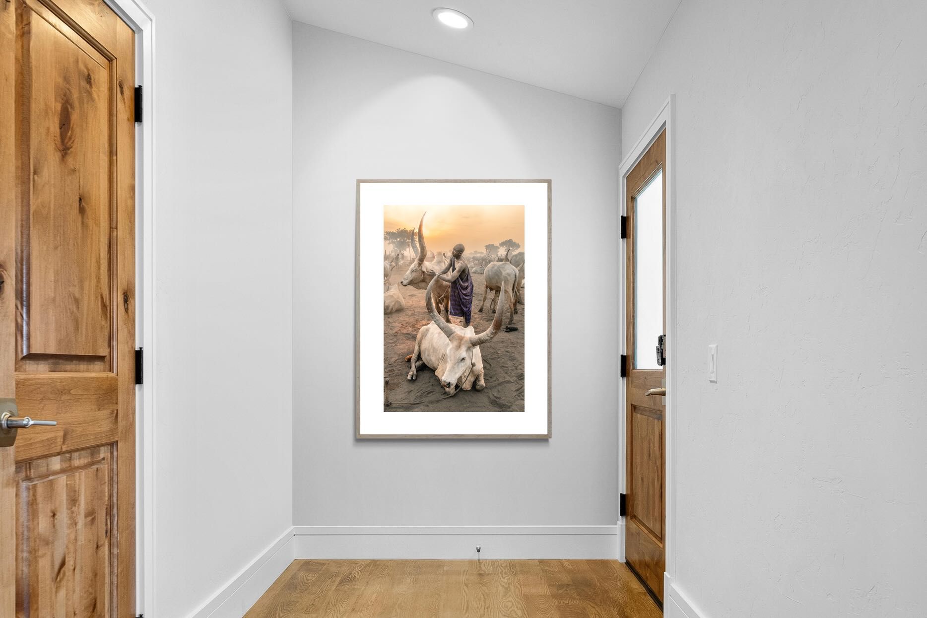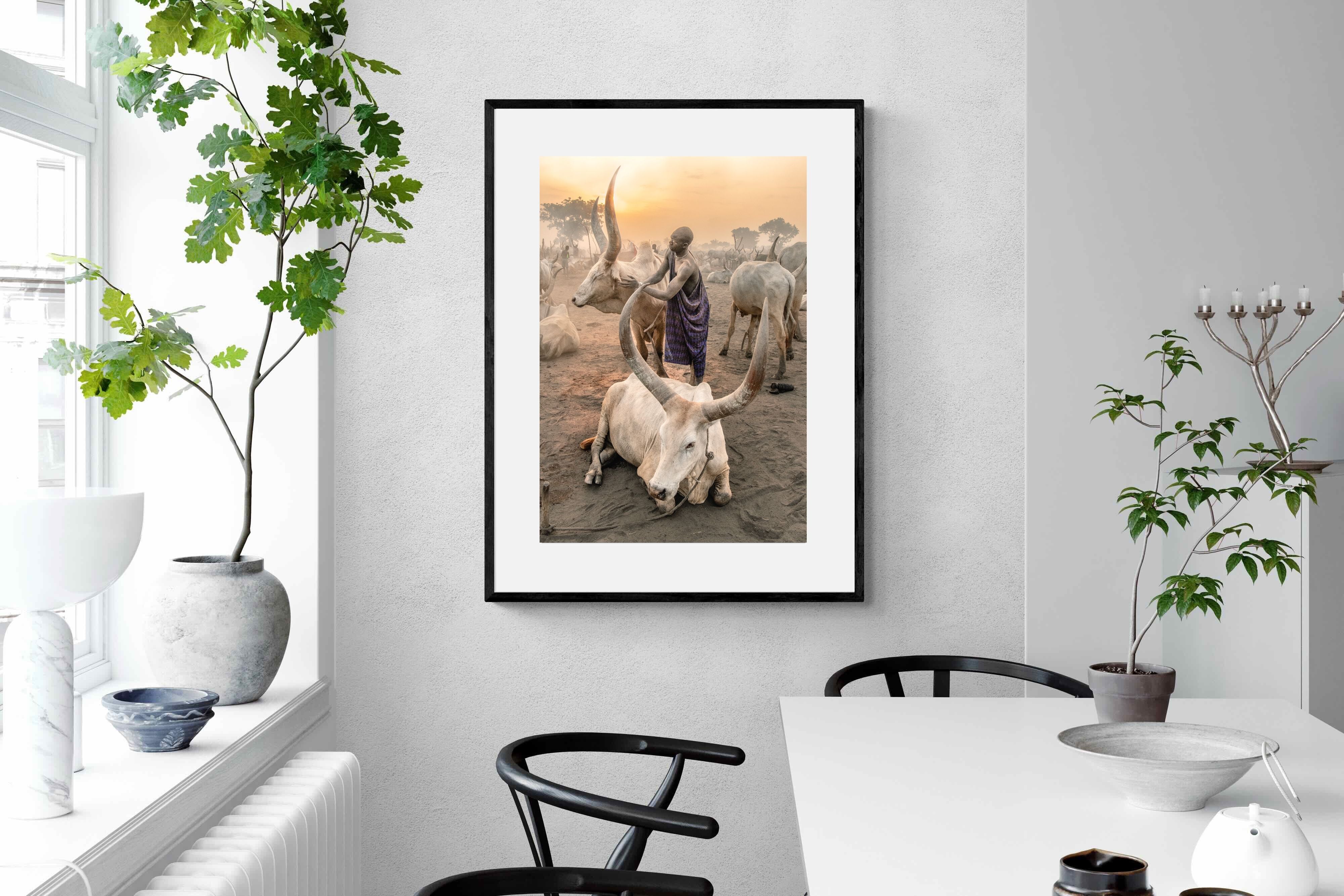 This powerful image captures a tranquil sunrise at a Mundari cattle camp in South Sudan, where a tribesman gently tends his prized Ankole-Watusi cattle. The soft morning light and dusty atmosphere create a cinematic sense of place and ritual. A compelling choice for contemporary homes or cultural spaces, this artwork honours tradition, dignity, and the profound bond between people and land. Rich in soul and photographic storytelling.