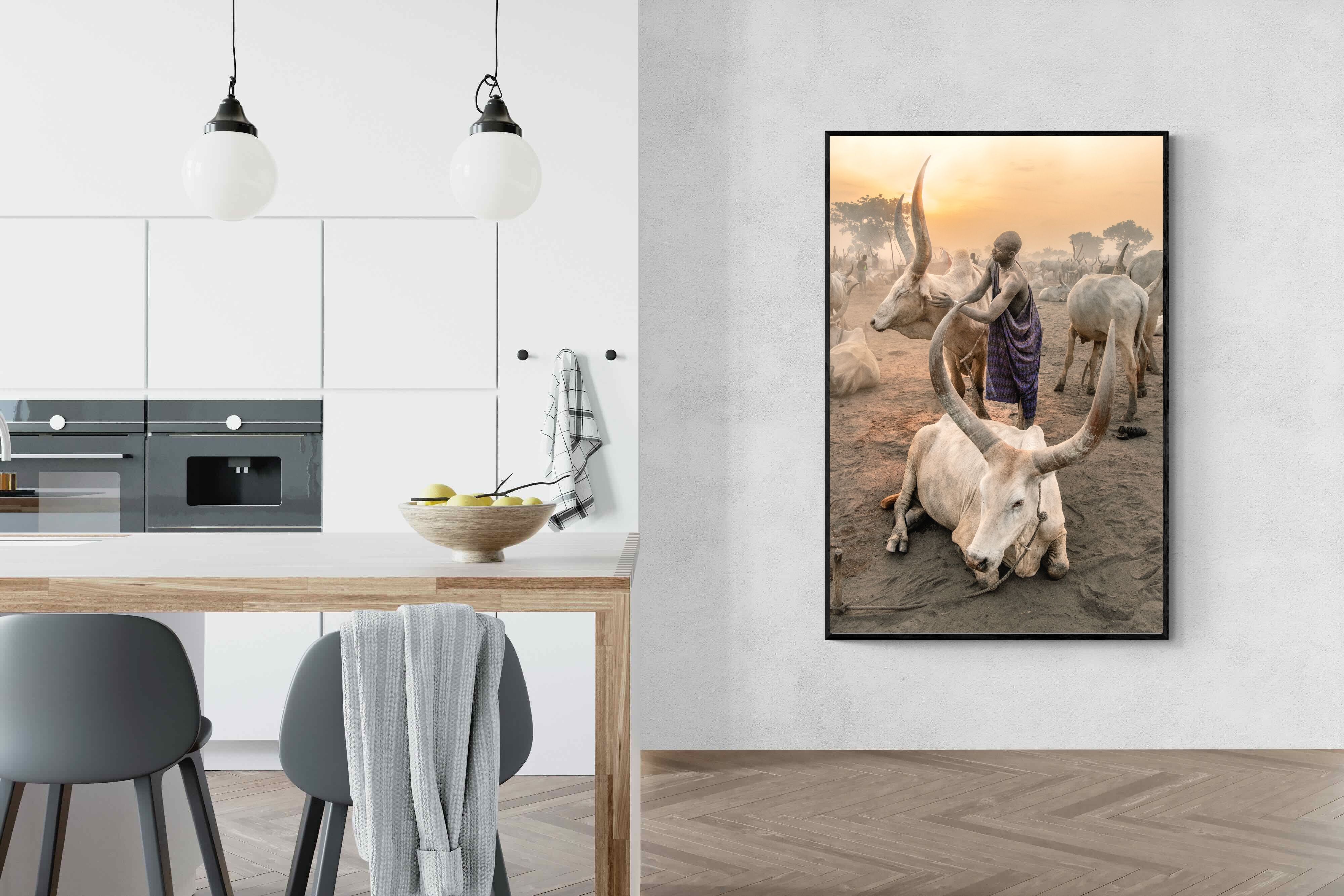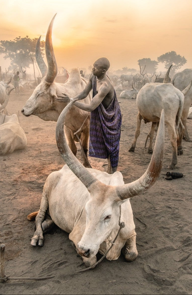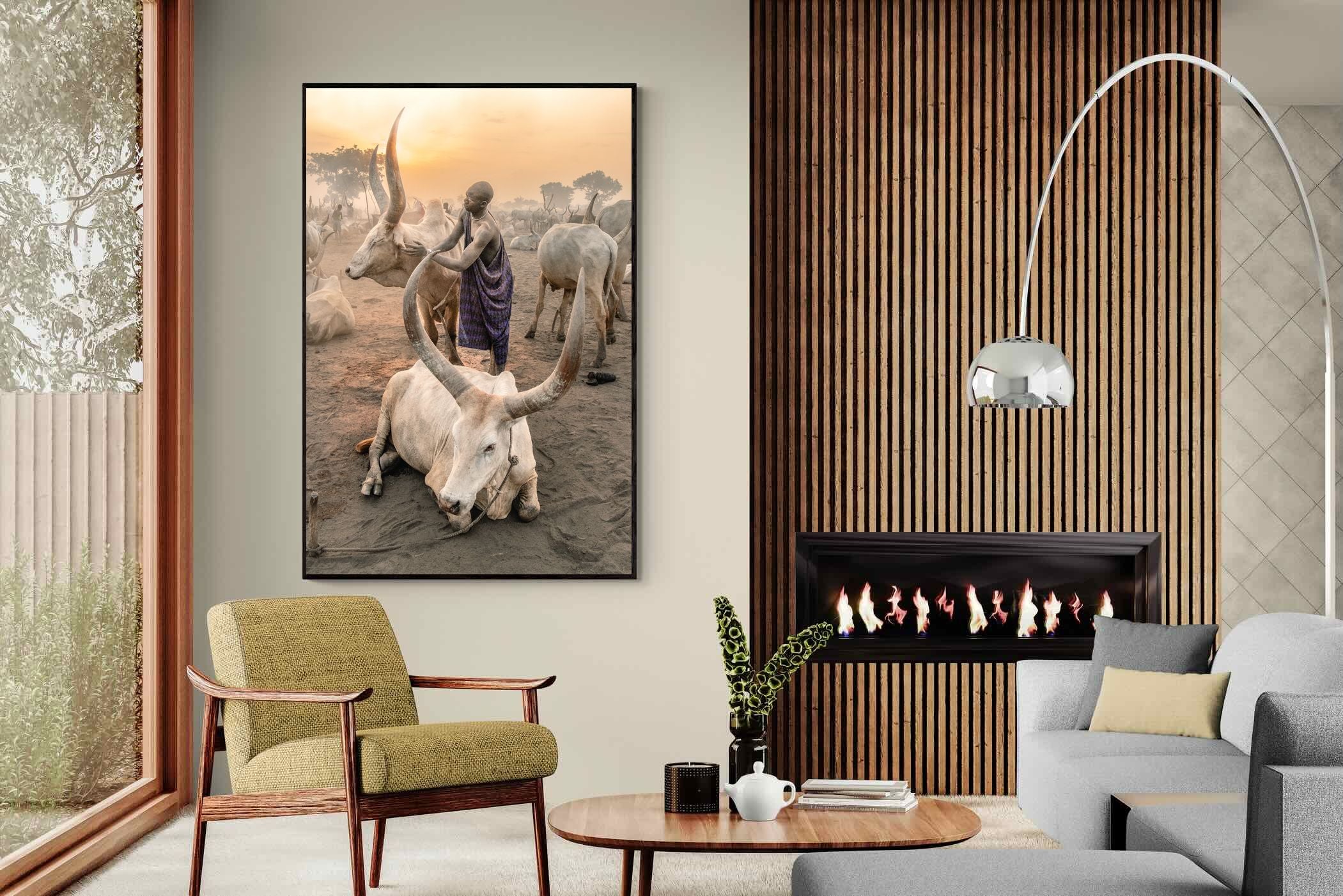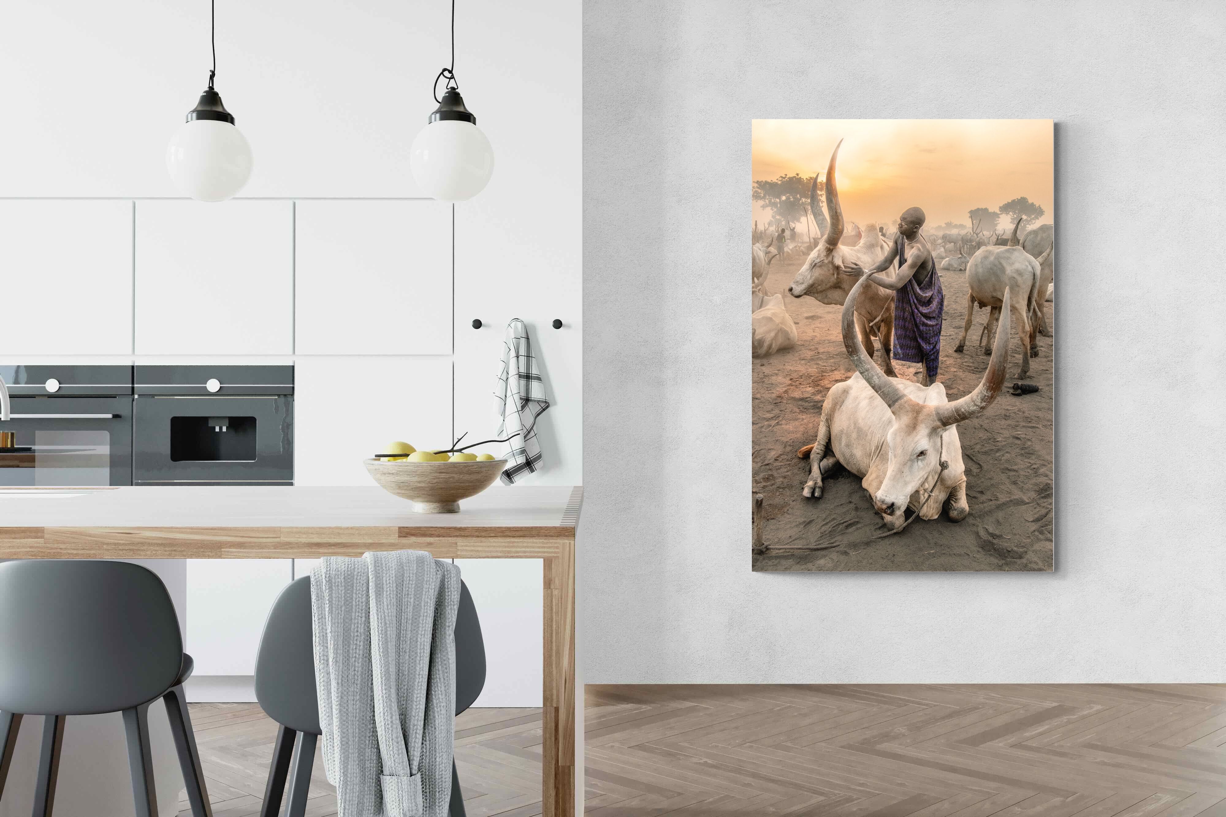 This powerful image captures a tranquil sunrise at a Mundari cattle camp in South Sudan, where a tribesman gently tends his prized Ankole-Watusi cattle. The soft morning light and dusty atmosphere create a cinematic sense of place and ritual. A compelling choice for contemporary homes or cultural spaces, this artwork honours tradition, dignity, and the profound bond between people and land. Rich in soul and photographic storytelling.