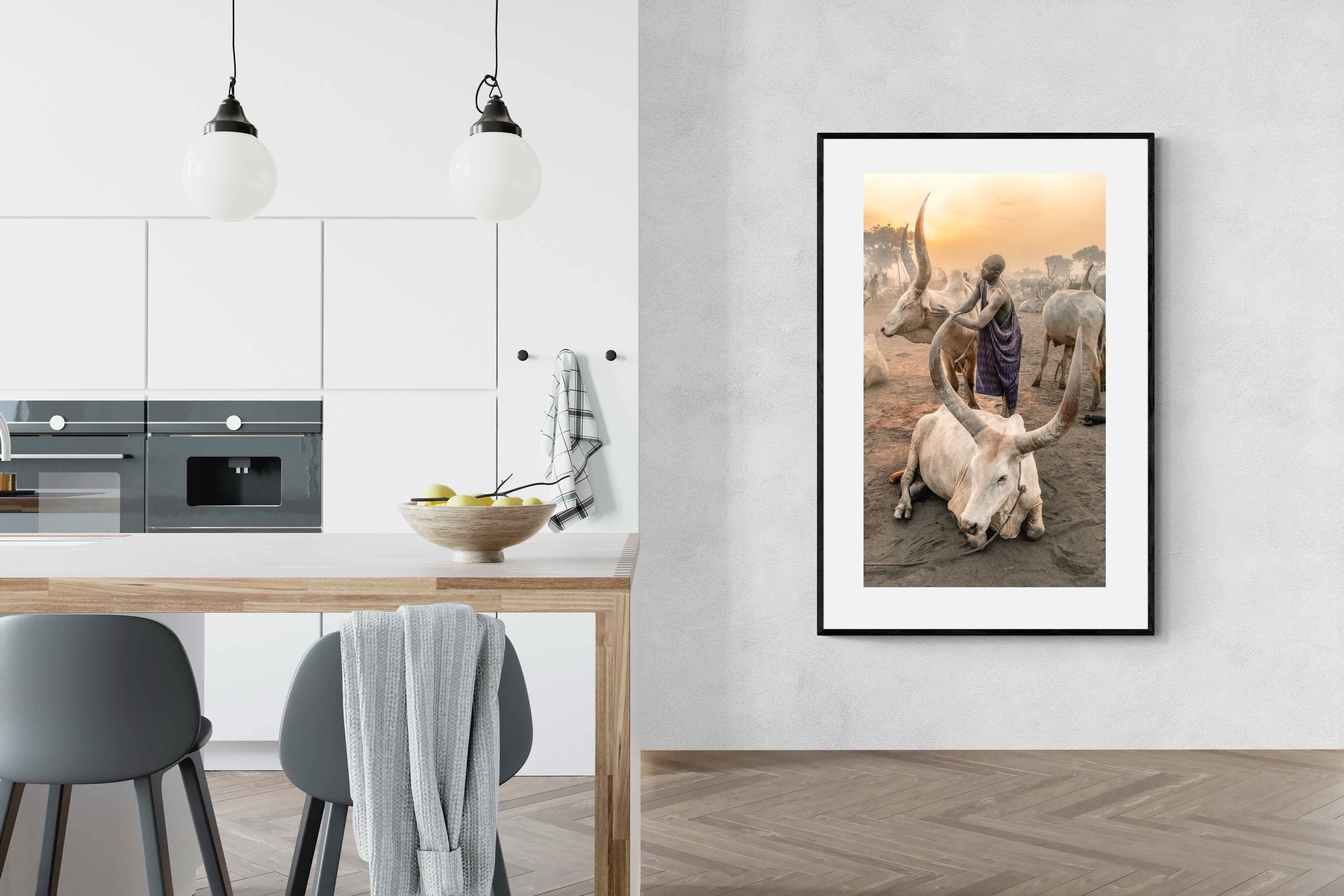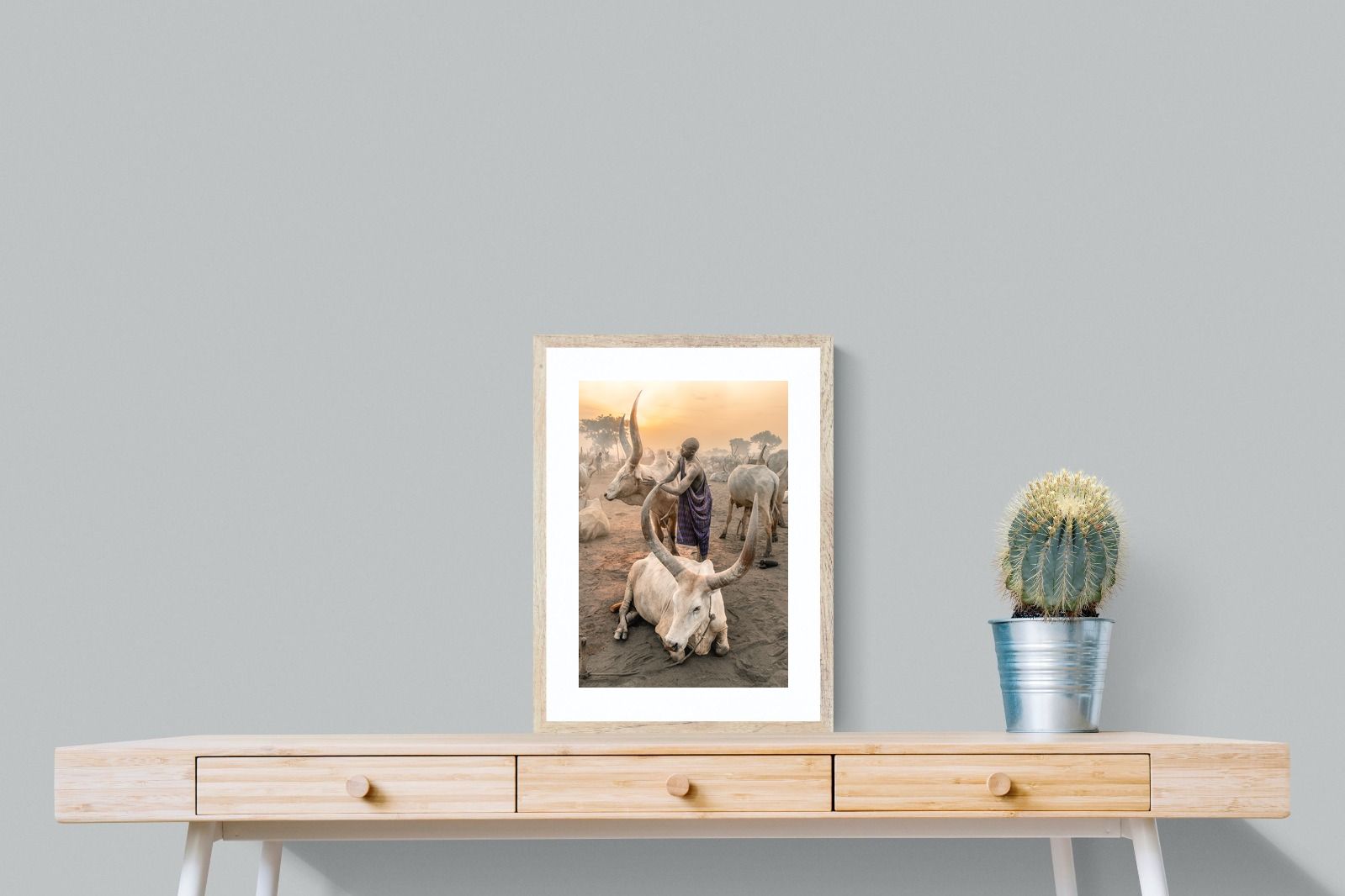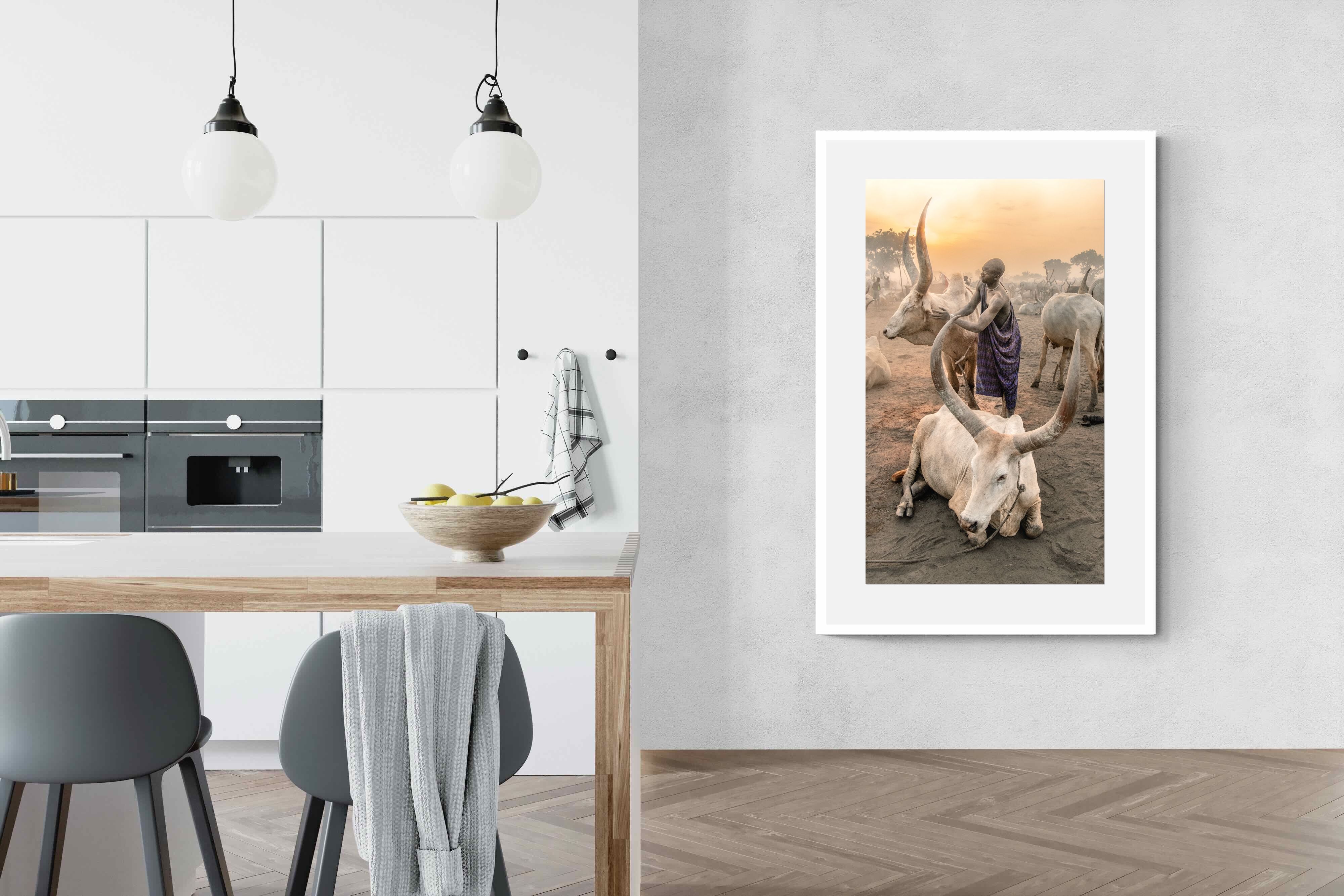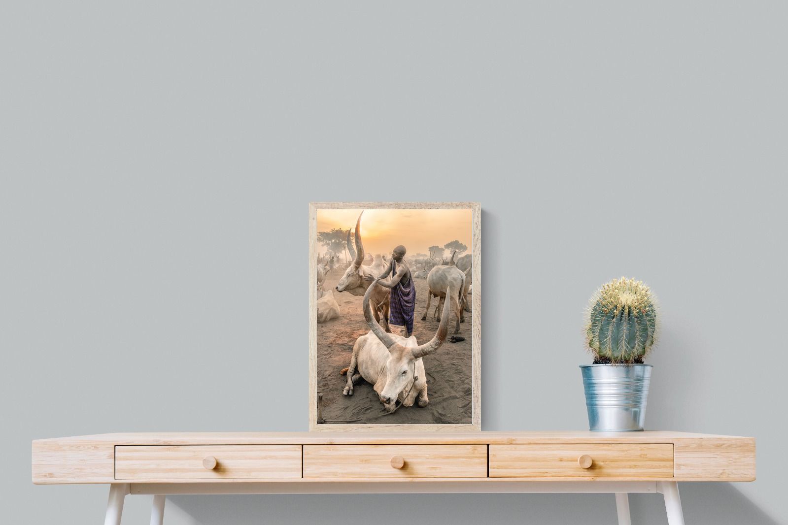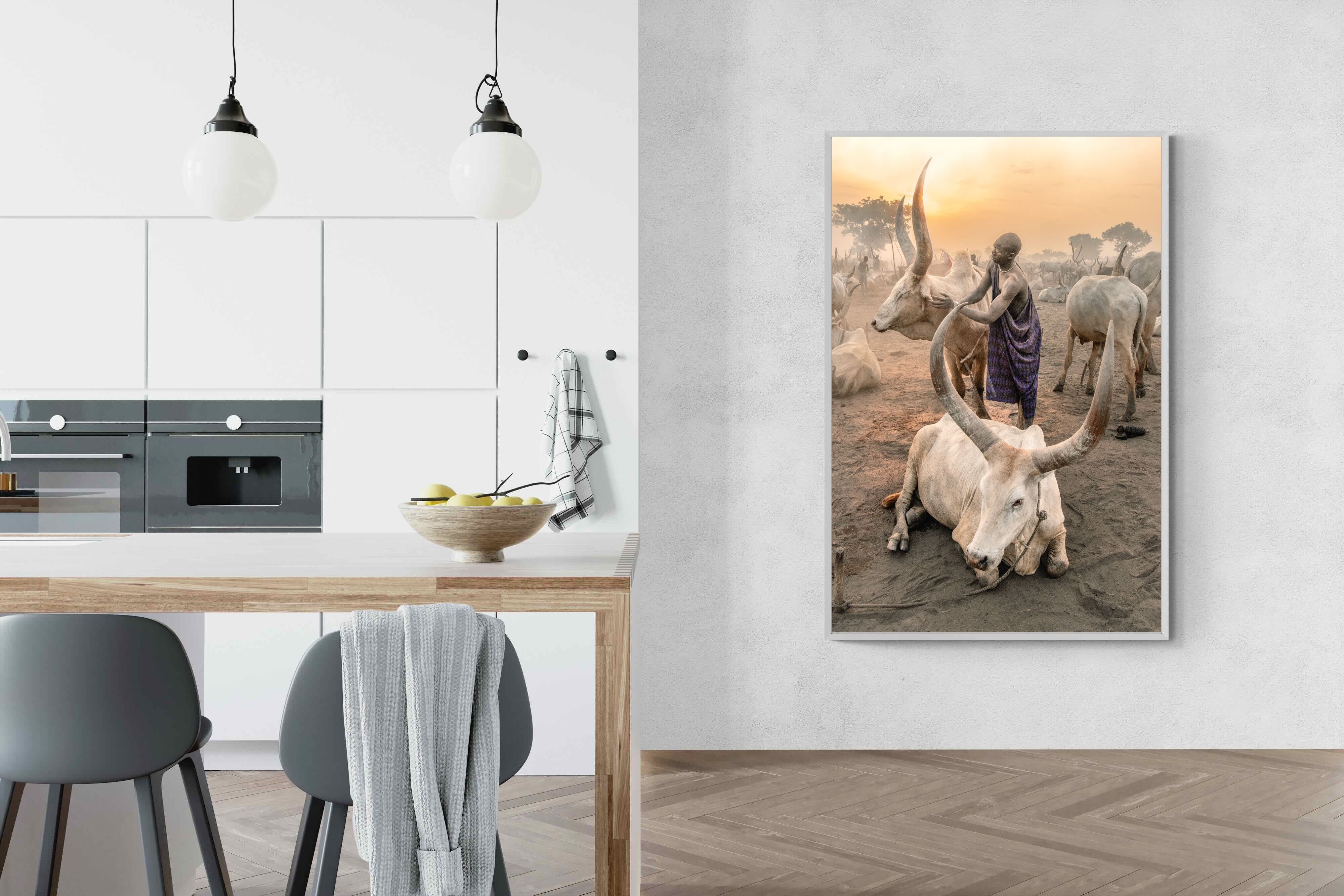 This powerful image captures a tranquil sunrise at a Mundari cattle camp in South Sudan, where a tribesman gently tends his prized Ankole-Watusi cattle. The soft morning light and dusty atmosphere create a cinematic sense of place and ritual. A compelling choice for contemporary homes or cultural spaces, this artwork honours tradition, dignity, and the profound bond between people and land. Rich in soul and photographic storytelling.