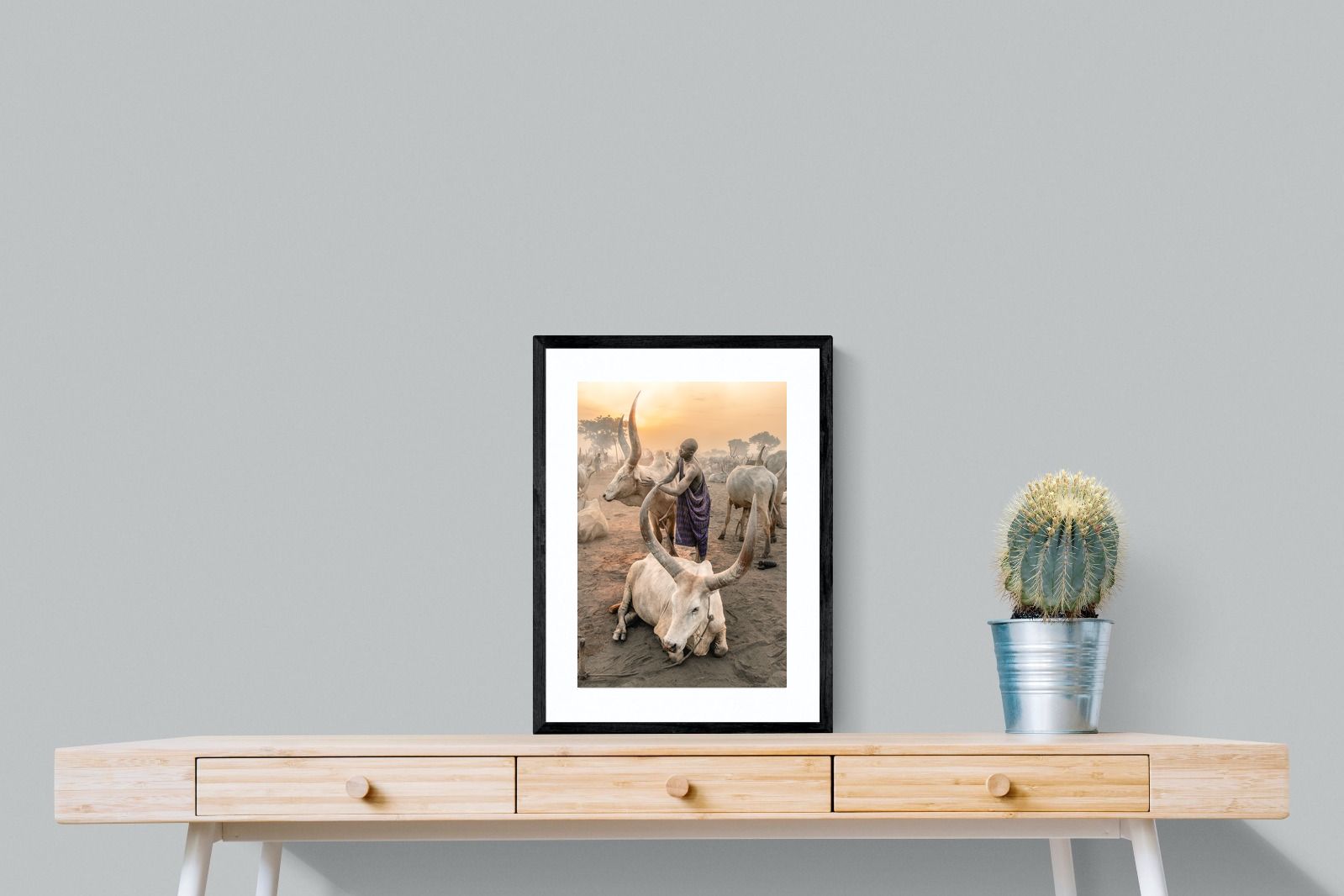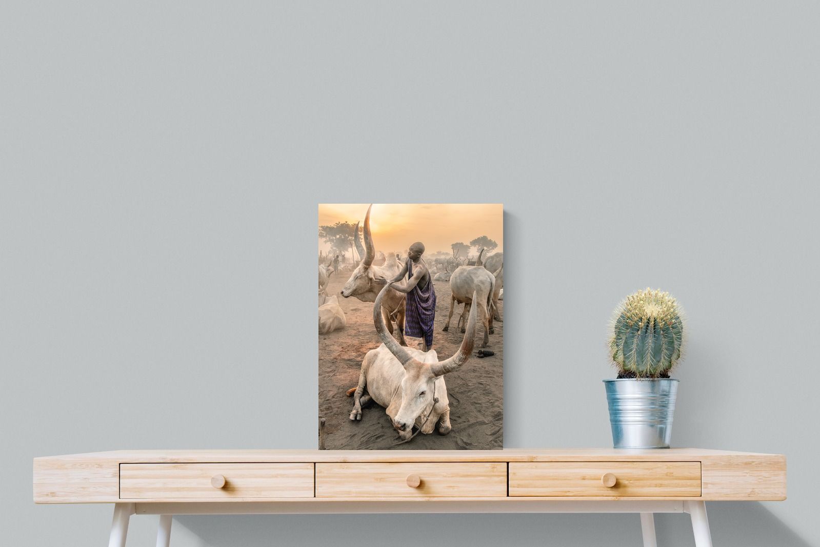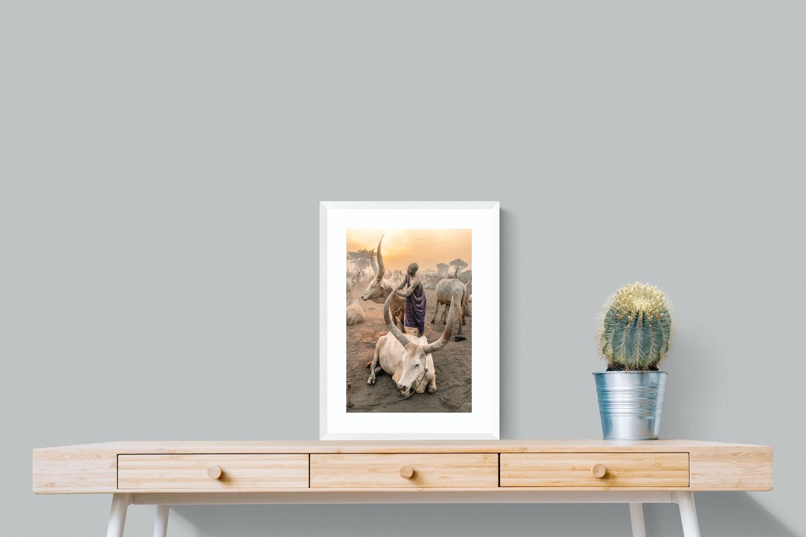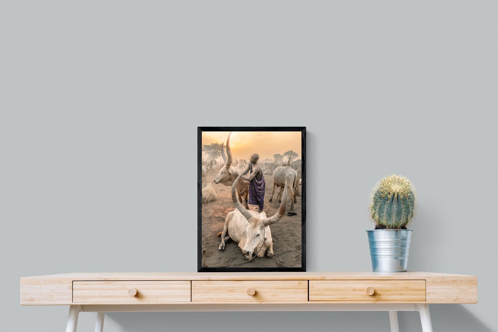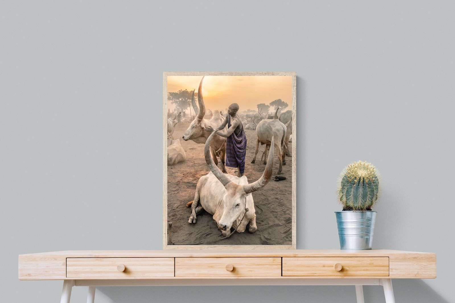 This powerful image captures a tranquil sunrise at a Mundari cattle camp in South Sudan, where a tribesman gently tends his prized Ankole-Watusi cattle. The soft morning light and dusty atmosphere create a cinematic sense of place and ritual. A compelling choice for contemporary homes or cultural spaces, this artwork honours tradition, dignity, and the profound bond between people and land. Rich in soul and photographic storytelling.