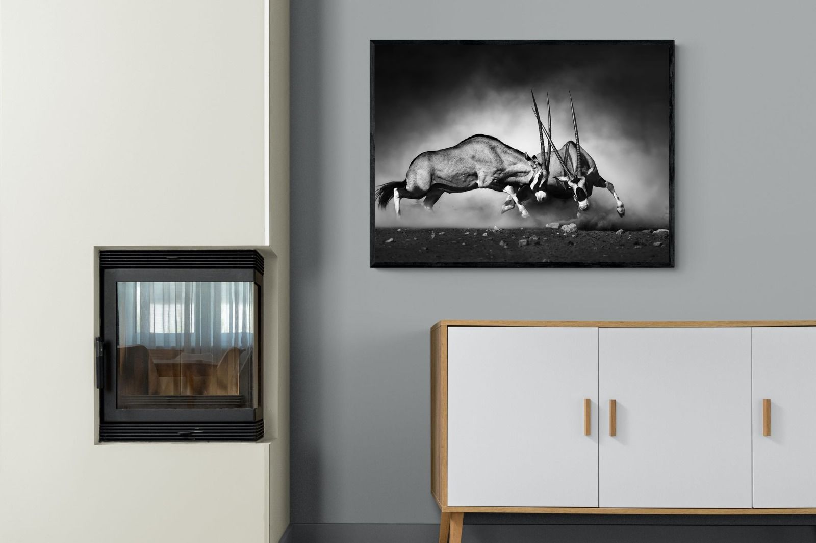 Dramatic Black & White Photograph of Two Oryx Sparring - Wall Art for Contemporary African Homes