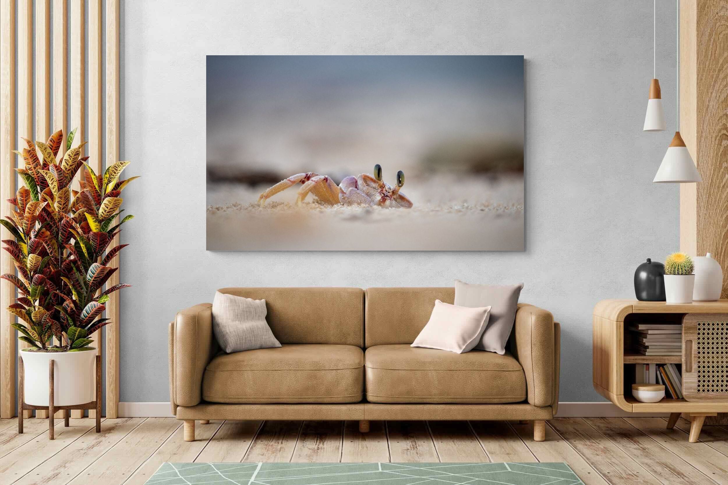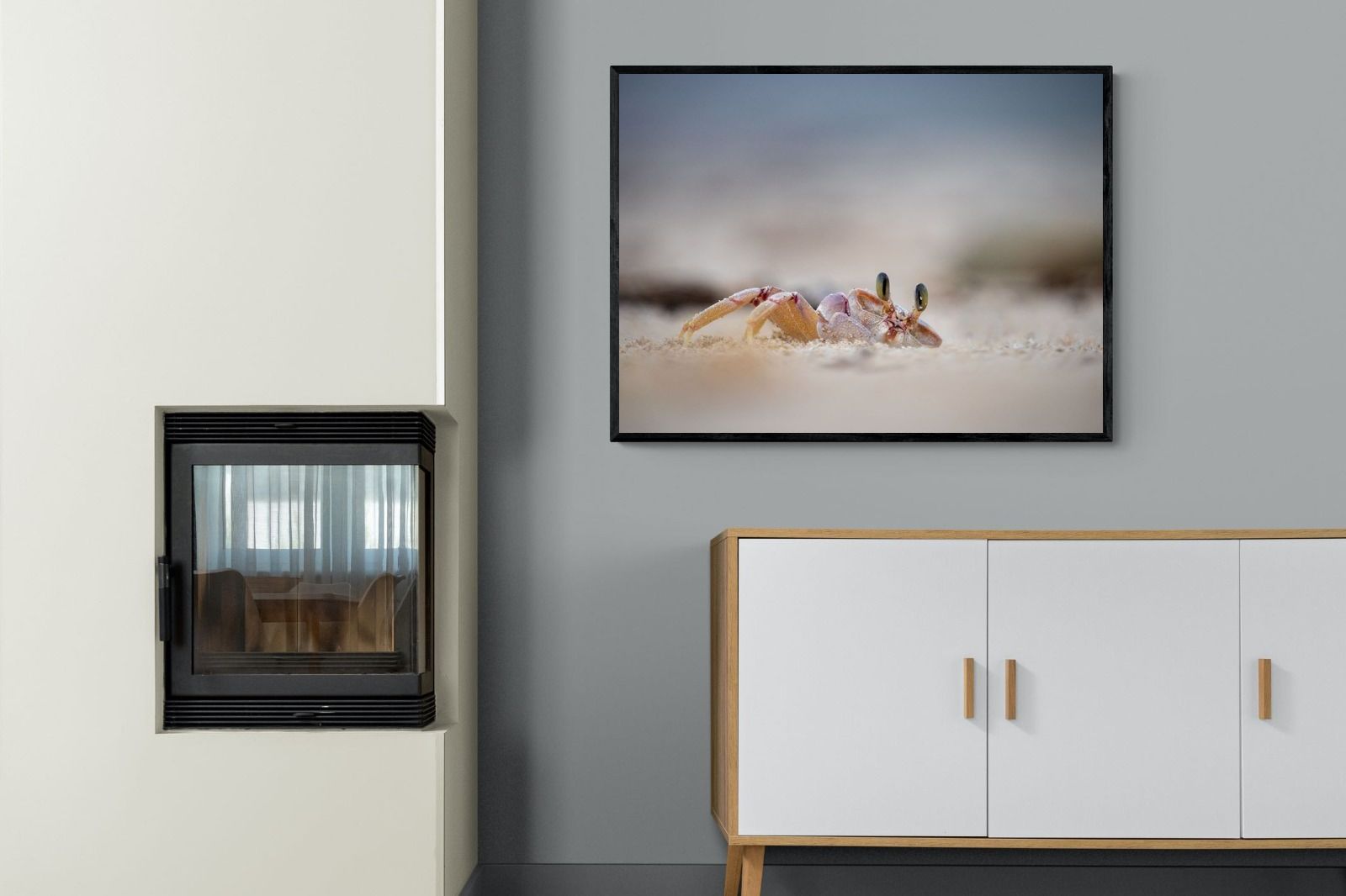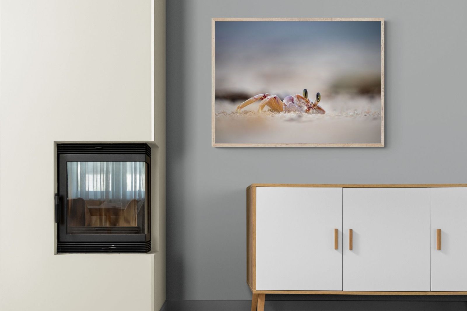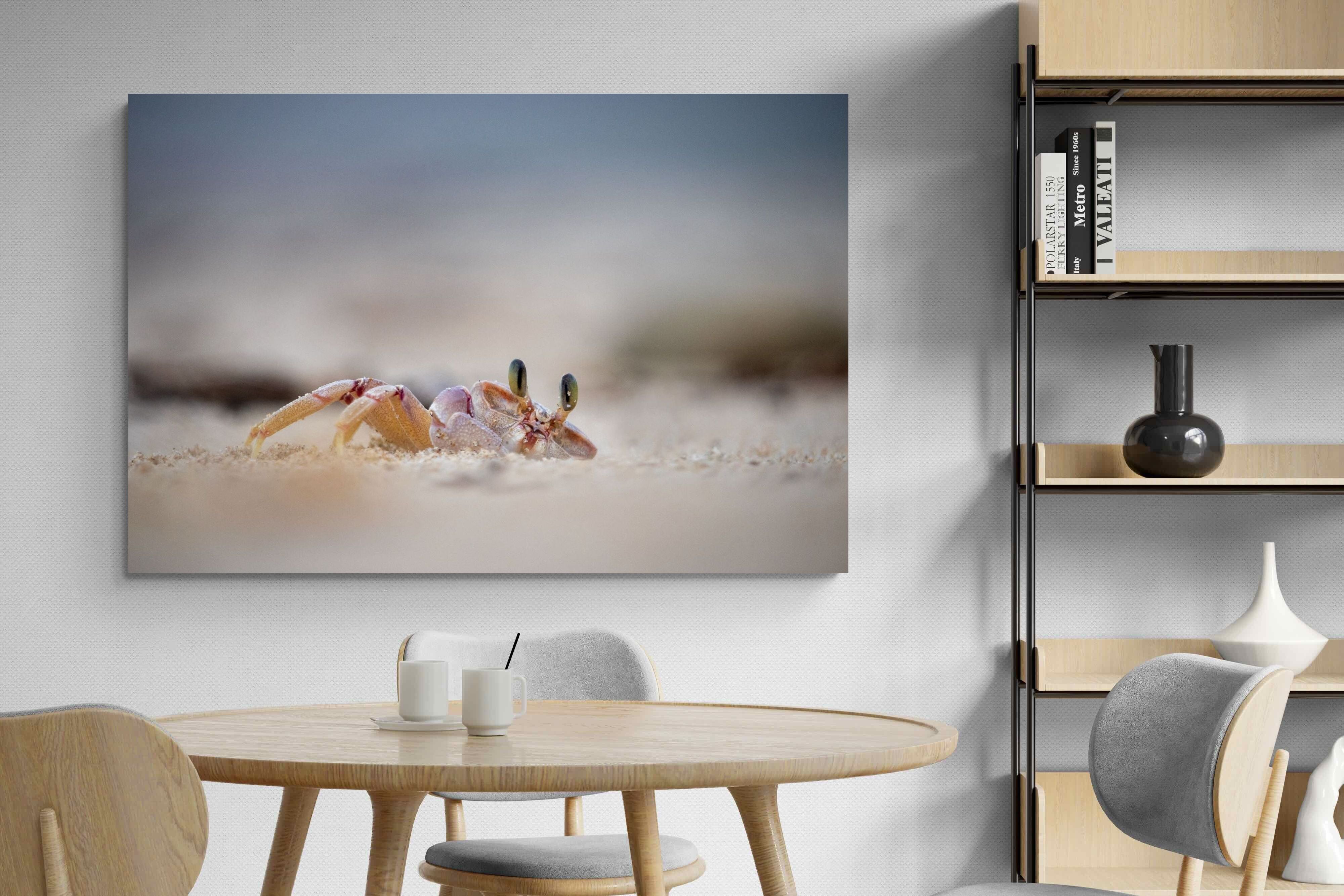 A tiny sand crab peeks from the beach with curious raised eyes, captured in soft pastel light and shallow focus. Its delicate detail and muted tones offer a charming, intimate look at seaside life. Perfect for kids’ rooms, relaxed beach houses, light contemporary spaces or any interior wanting a playful yet refined coastal accent.