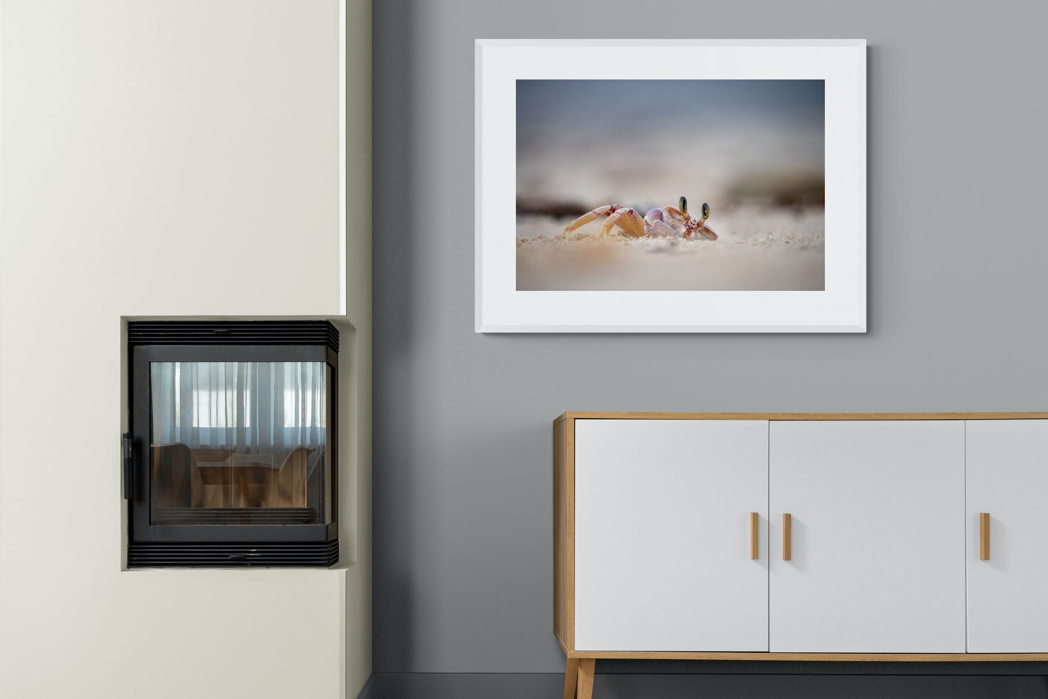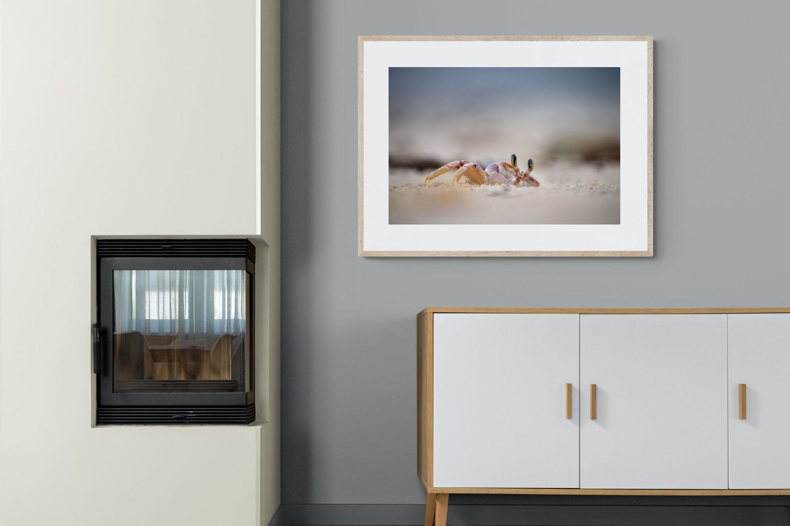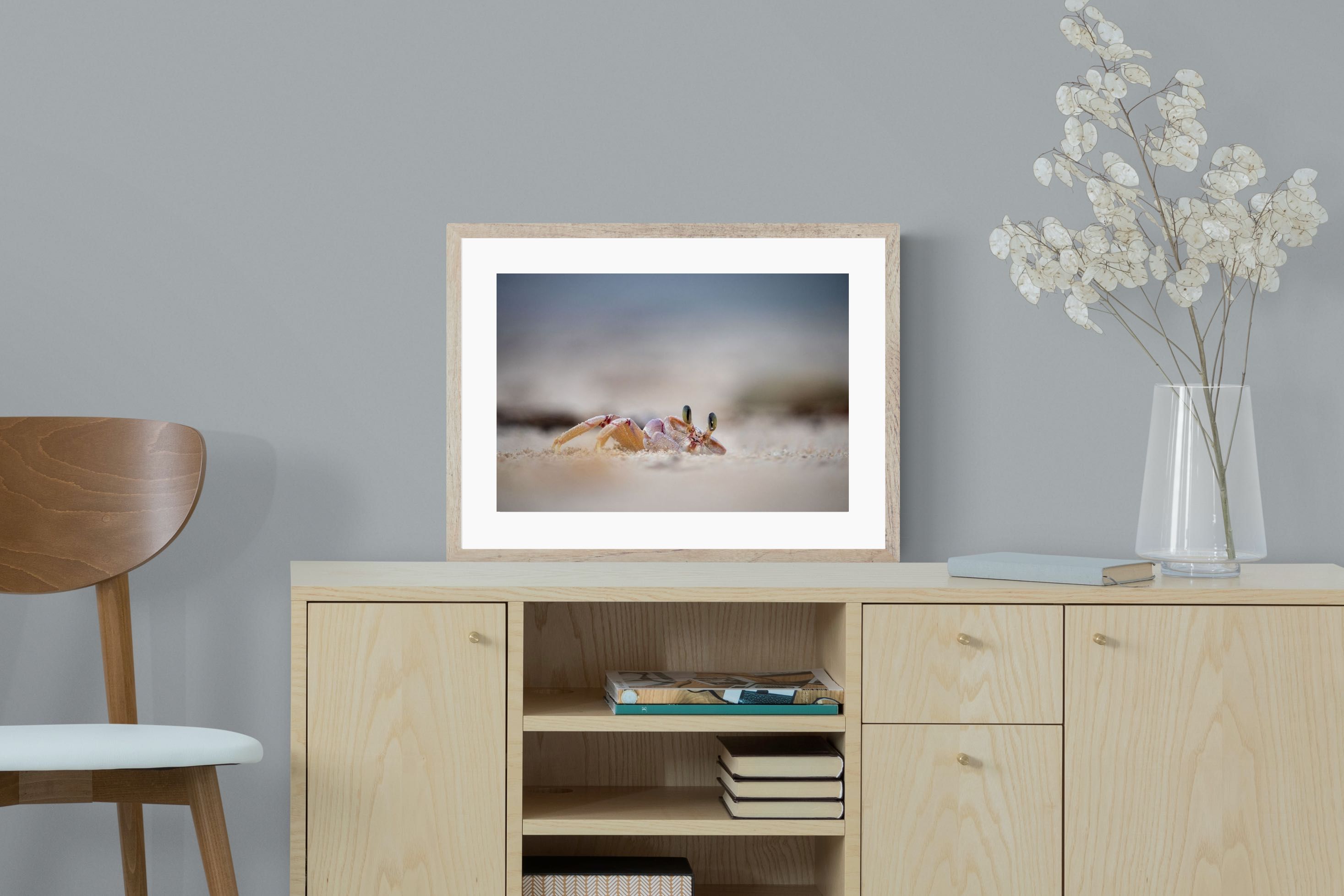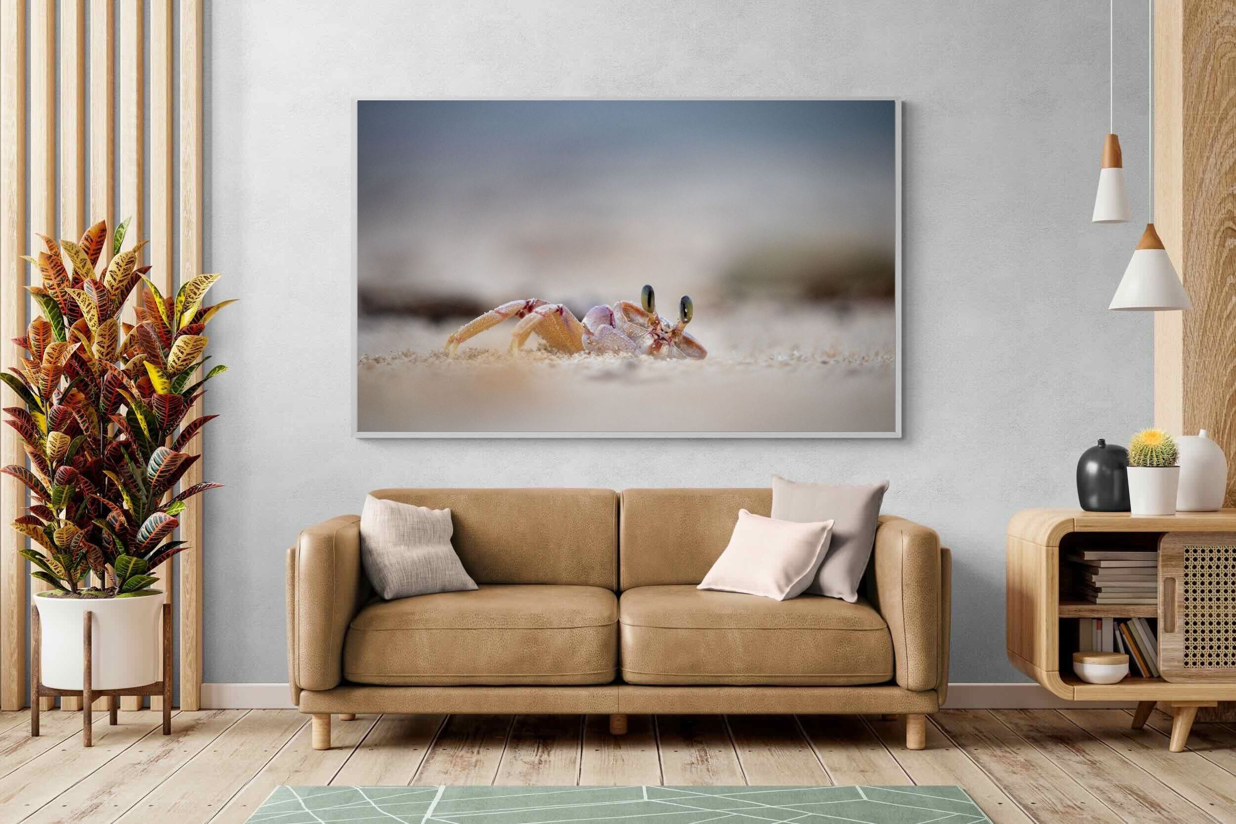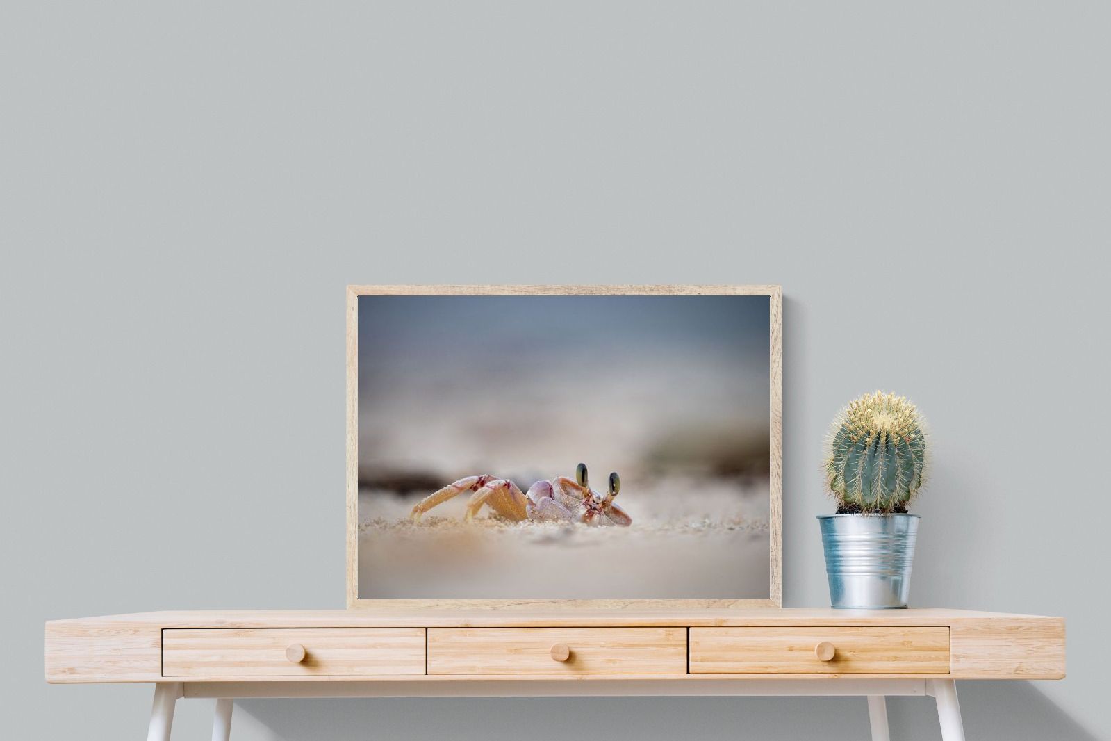 A tiny sand crab peeks from the beach with curious raised eyes, captured in soft pastel light and shallow focus. Its delicate detail and muted tones offer a charming, intimate look at seaside life. Perfect for kids’ rooms, relaxed beach houses, light contemporary spaces or any interior wanting a playful yet refined coastal accent.