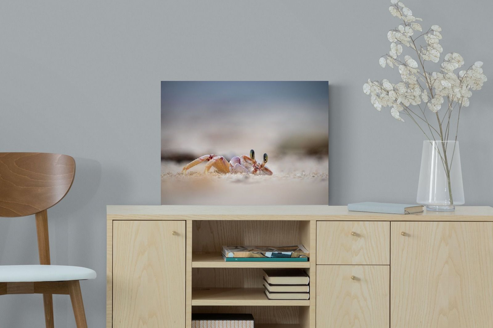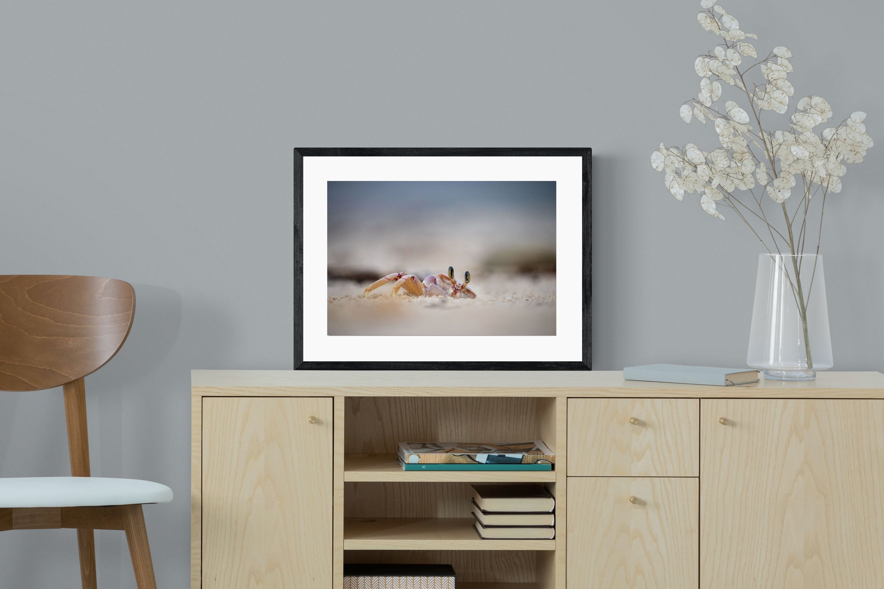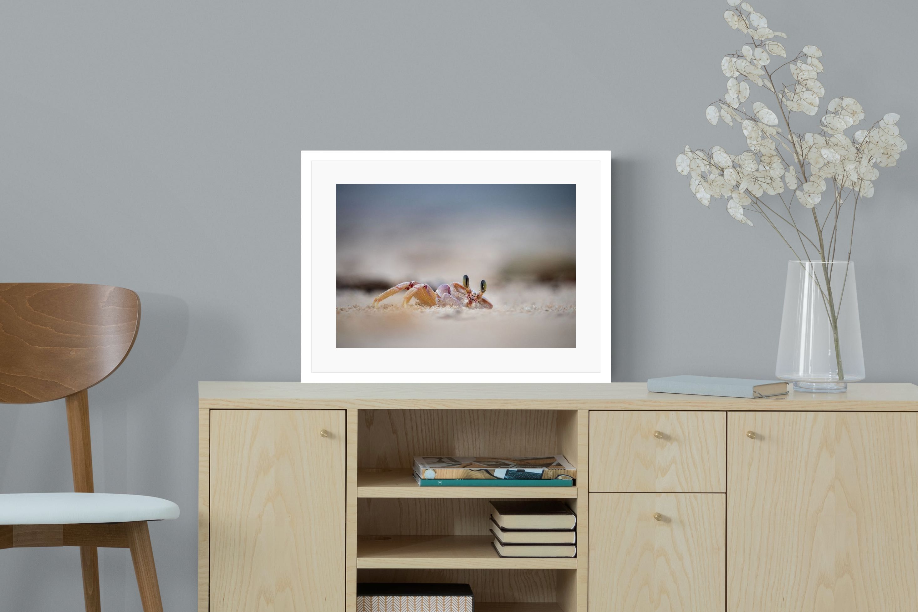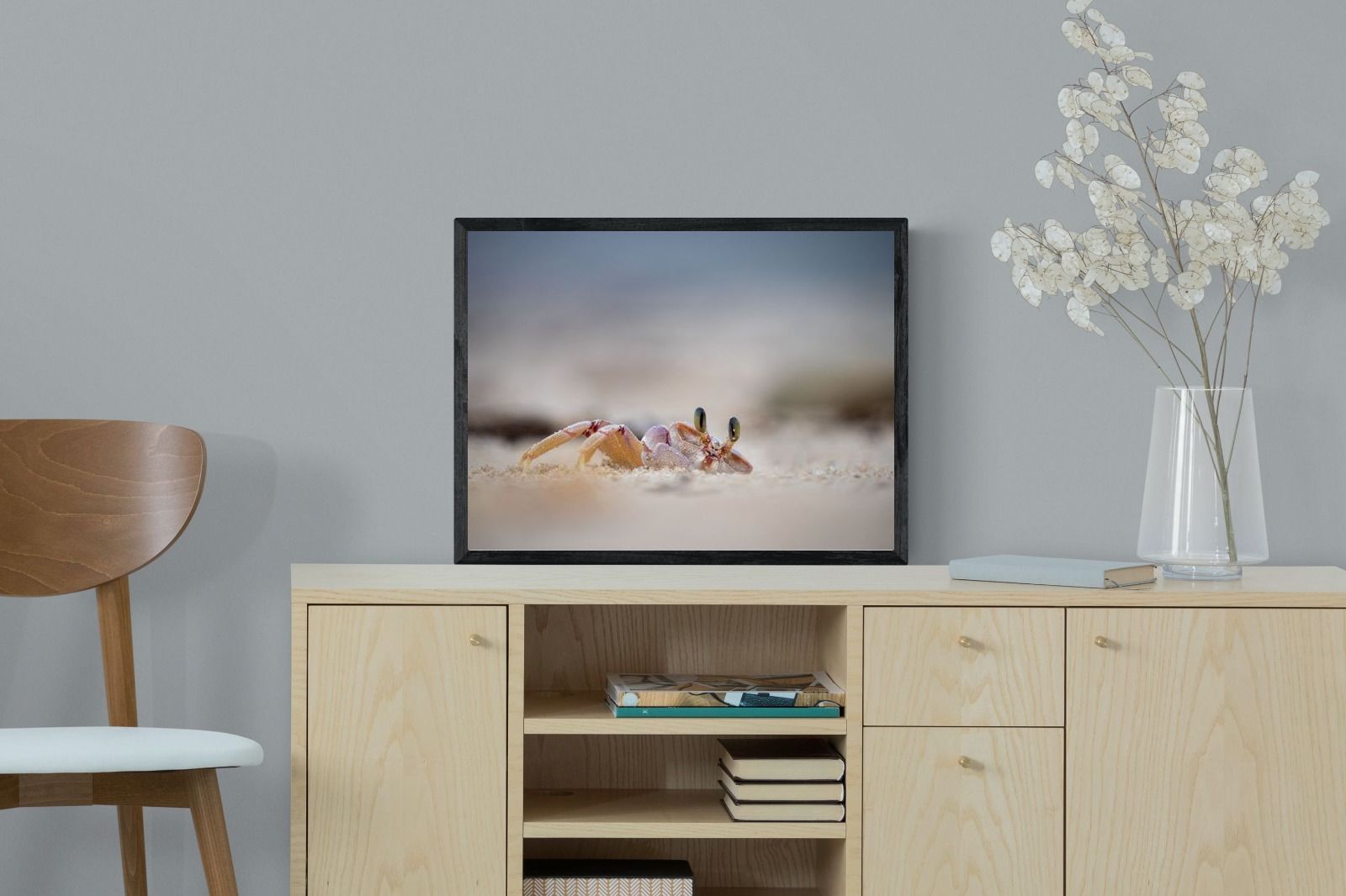 A tiny sand crab peeks from the beach with curious raised eyes, captured in soft pastel light and shallow focus. Its delicate detail and muted tones offer a charming, intimate look at seaside life. Perfect for kids’ rooms, relaxed beach houses, light contemporary spaces or any interior wanting a playful yet refined coastal accent.