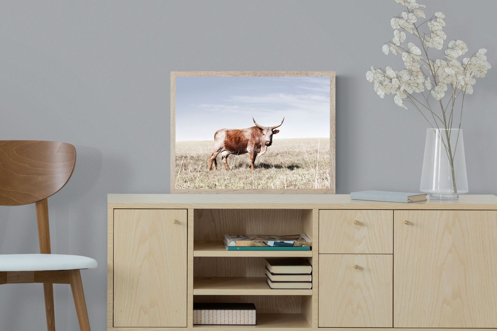 We make-to-order in our studio in Cape Town, using the highest quality materials and most skilled local craftsmen. We use only the finest wood frames (in black, white, oak, walnut) canvas, mounting card and glass available, and whereas most retailers use 25mm subframes, we stretch the canvas over 50mm subframes, which gives it gravitas on the wall.