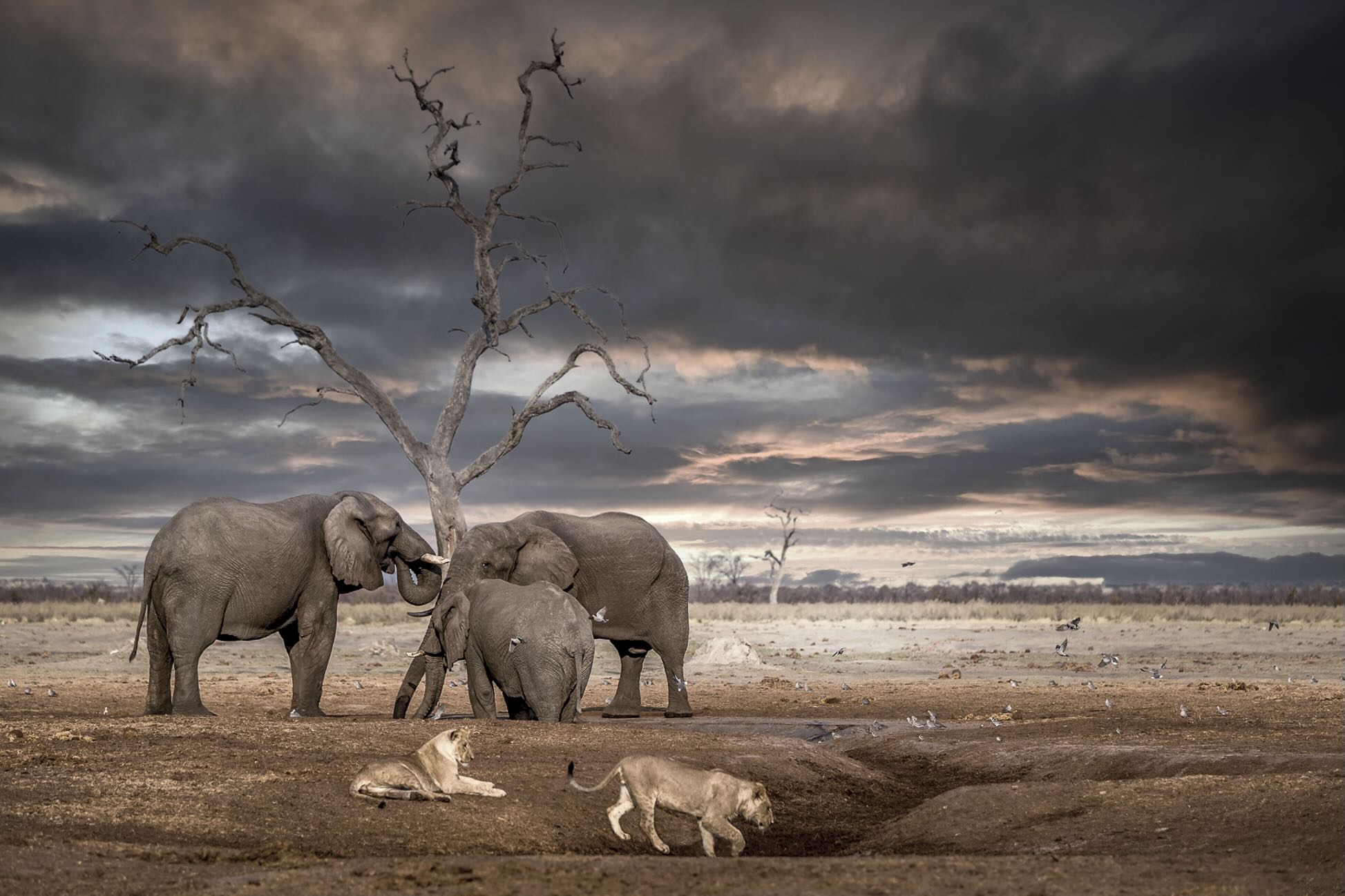 Captured beneath a brooding African sky, this powerful image frames elephants and lions in a moment of quiet tension at a dry waterhole. The stark tree silhouette and sweeping clouds add cinematic drama. A compelling centrepiece, it brings raw wilderness, storytelling, and moody elegance to contemporary interiors—perfect for statement walls with a neutral or earthy palette.