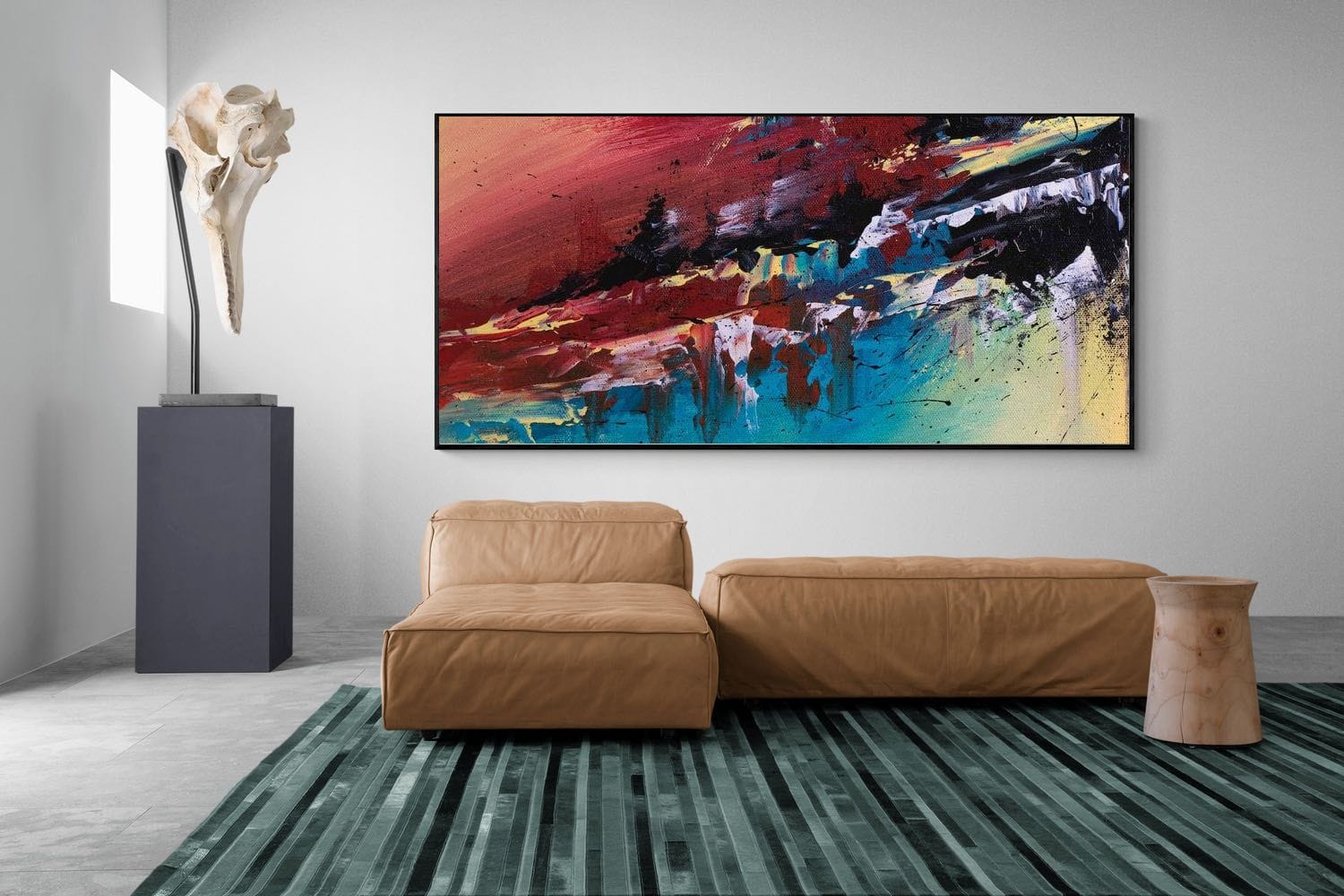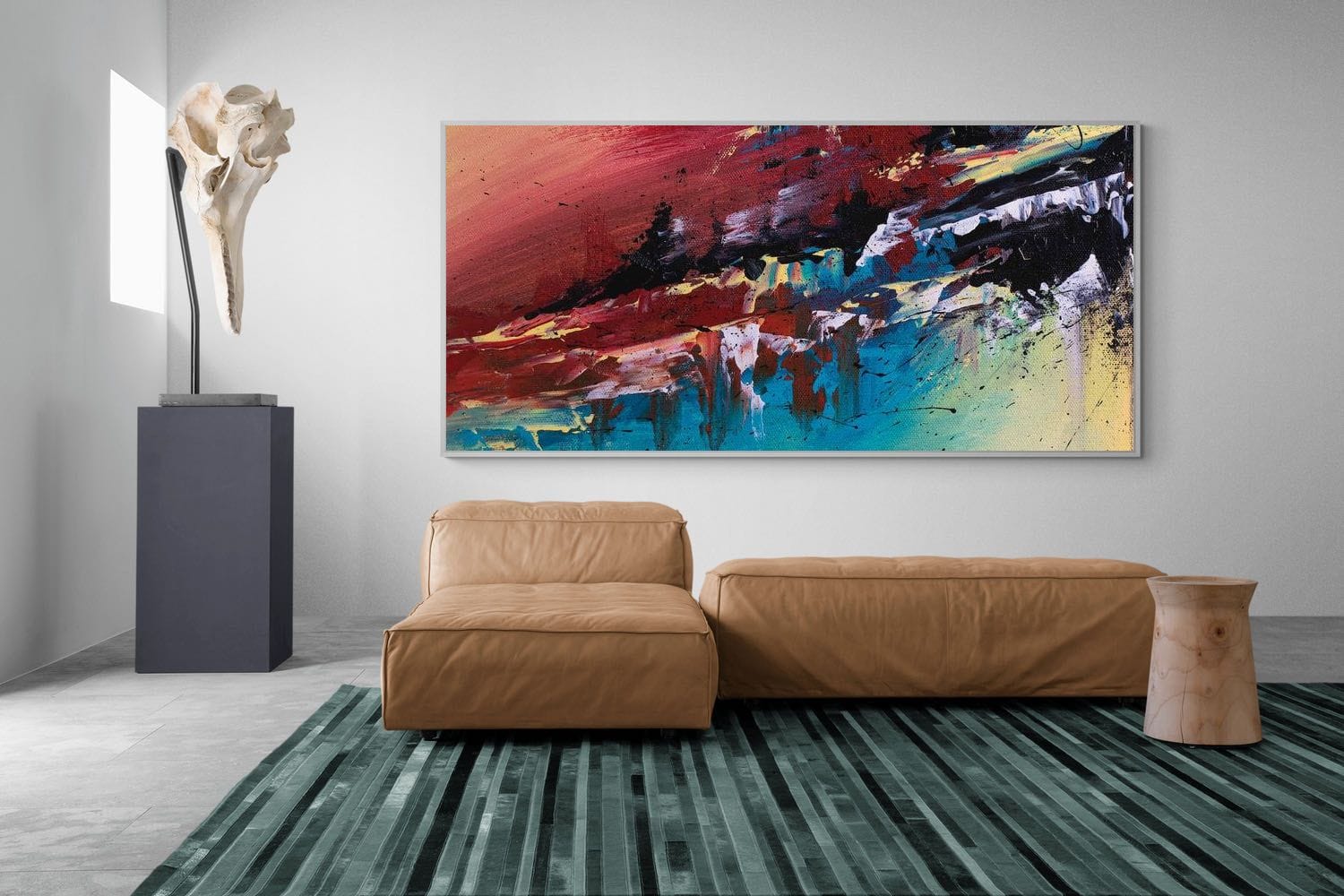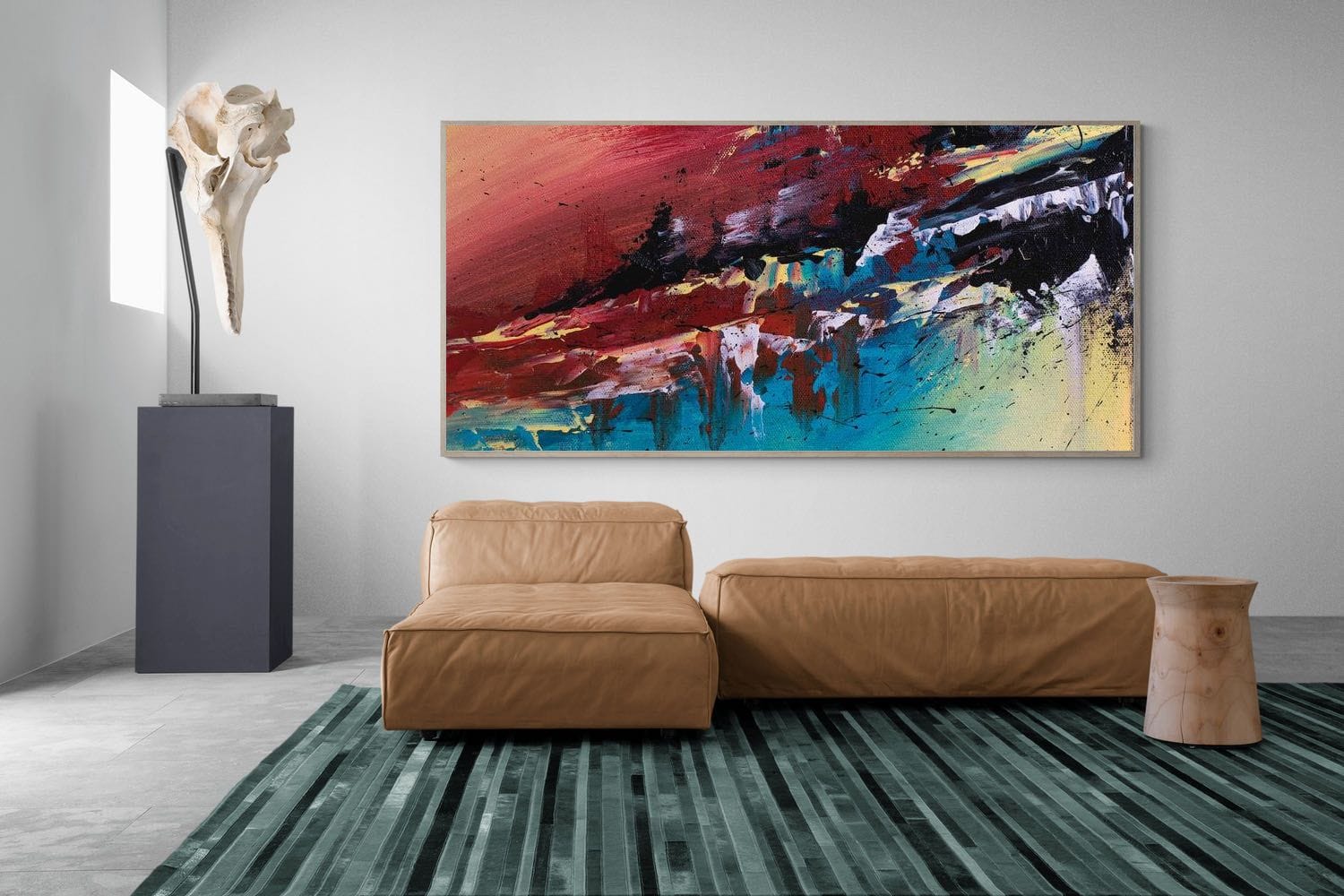 Dynamic strokes of red, black, and blue collide across the canvas, creating a raw and energetic abstract composition. The layered textures and sweeping movements suggest a rugged landscape or shifting horizon, open to interpretation. Perfect for modern lounges, offices, or creative spaces, this artwork brings intensity and visual impact. Its bold colour palette and expressive form make it an ideal statement piece for interiors seeking contrast, energy, and a contemporary artistic edge.