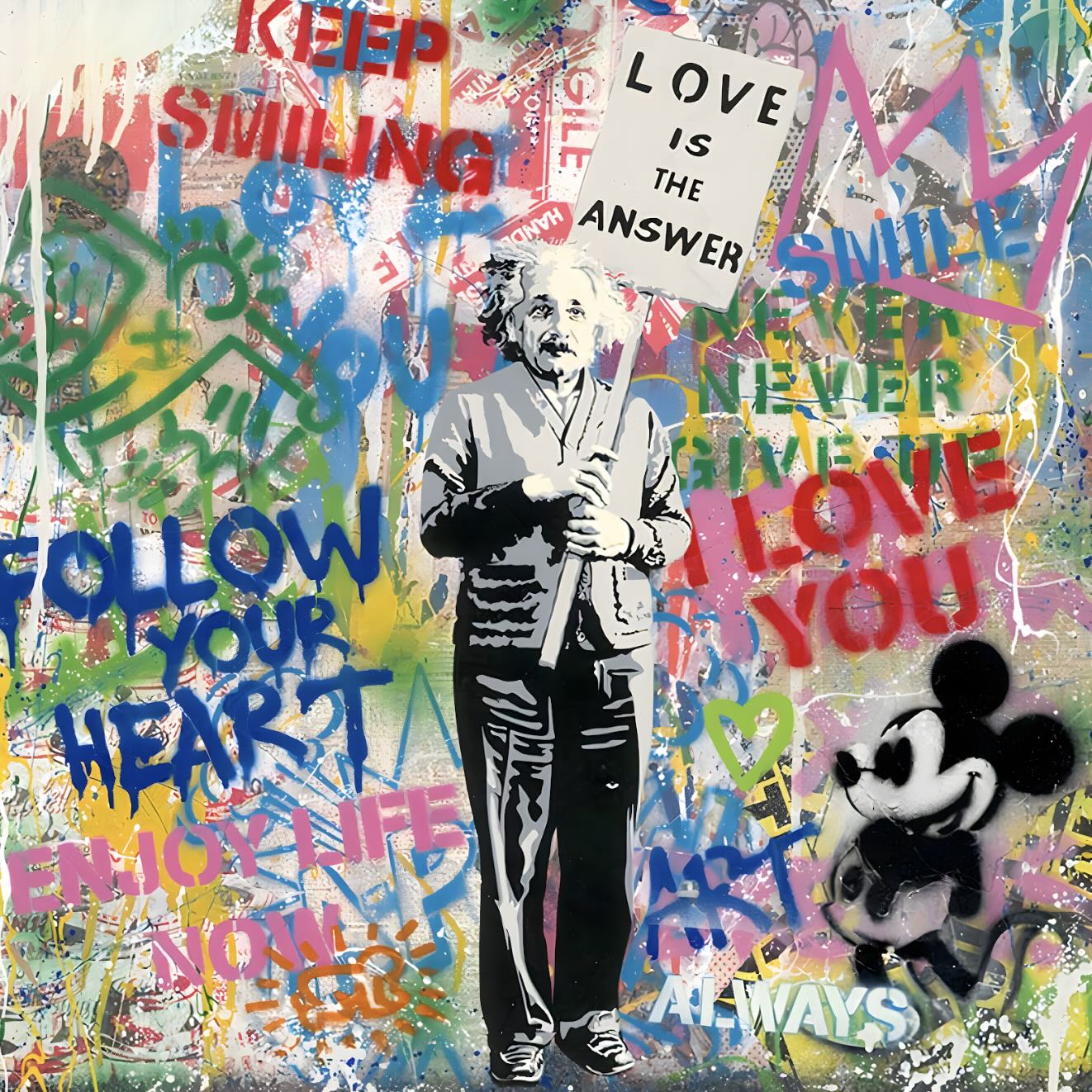 "Love is the Answer" is a vibrant street art piece featuring Albert Einstein holding a sign with the titular message, surrounded by graffiti and cartoon imagery. The artwork's bold colors and playful elements create a joyful and thought-provoking atmosphere. This piece would be an excellent addition to a modern home, providing a striking visual impact that encourages positivity and reflection, making it an inspiring focal point in any contemporary space.