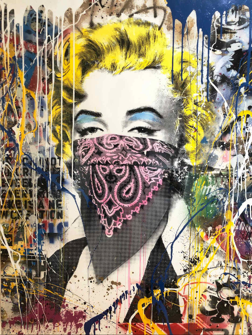 "Marilyn Monroe Street Art" merges iconic pop art with urban graffiti, depicting Marilyn Monroe with a vibrant pink bandana over her face. The juxtaposition of her classic image with contemporary street art styles and vivid splashes of paint creates a striking visual. This piece would make an excellent choice for modern home decor, offering a bold statement that blends historical pop culture with modern artistic expressions, perfect for creating a lively and stylish environment.