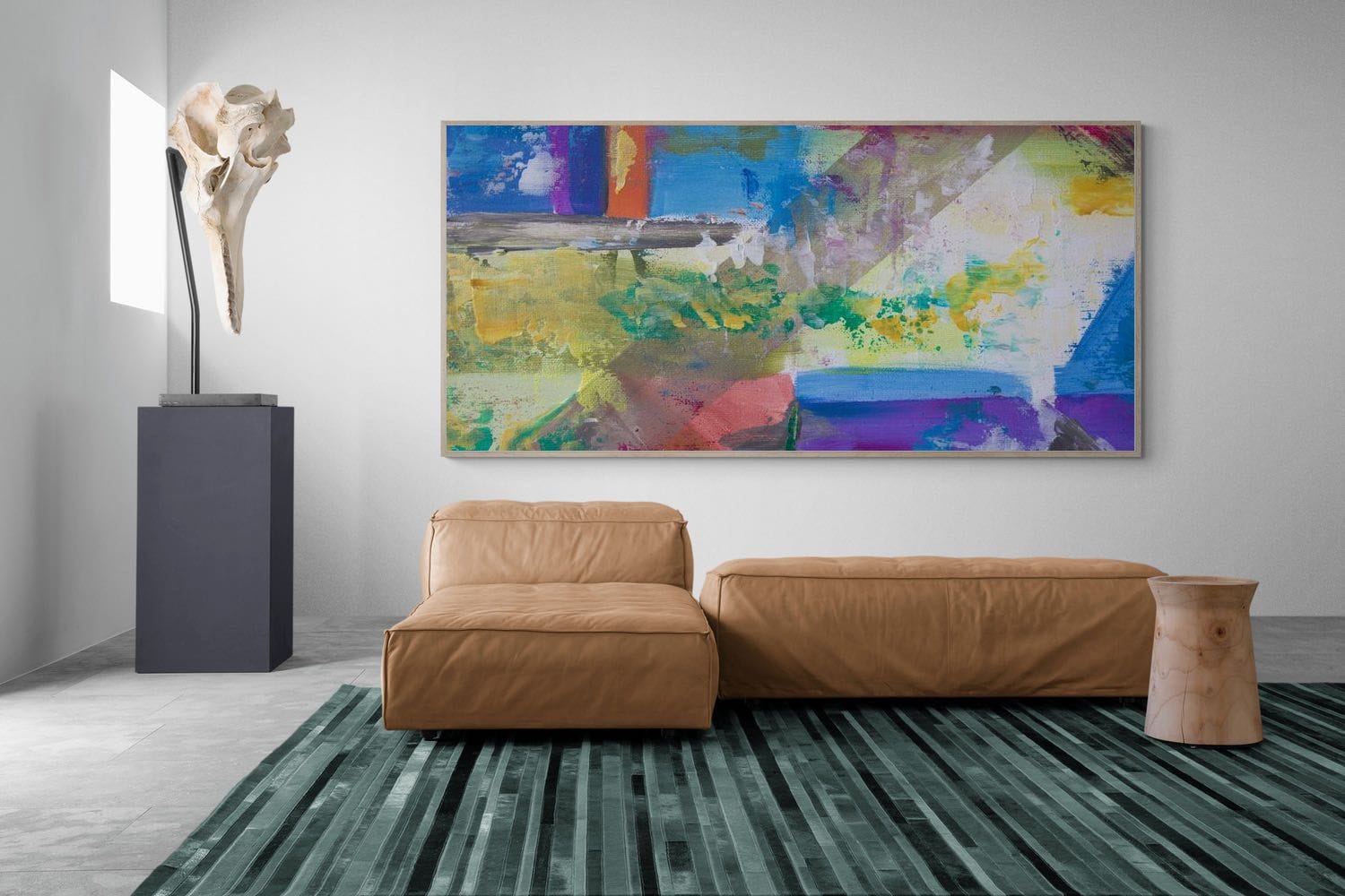 This structured abstract artwork combines layered colour blocks and textured brushwork to create a balanced yet expressive composition. The interplay between geometric shapes and organic paint application adds visual interest and depth. Ideal for modern interiors or design-led spaces, it offers a clean yet vibrant aesthetic. This piece works well as a focal point, bringing colour, structure and a contemporary edge to any room.