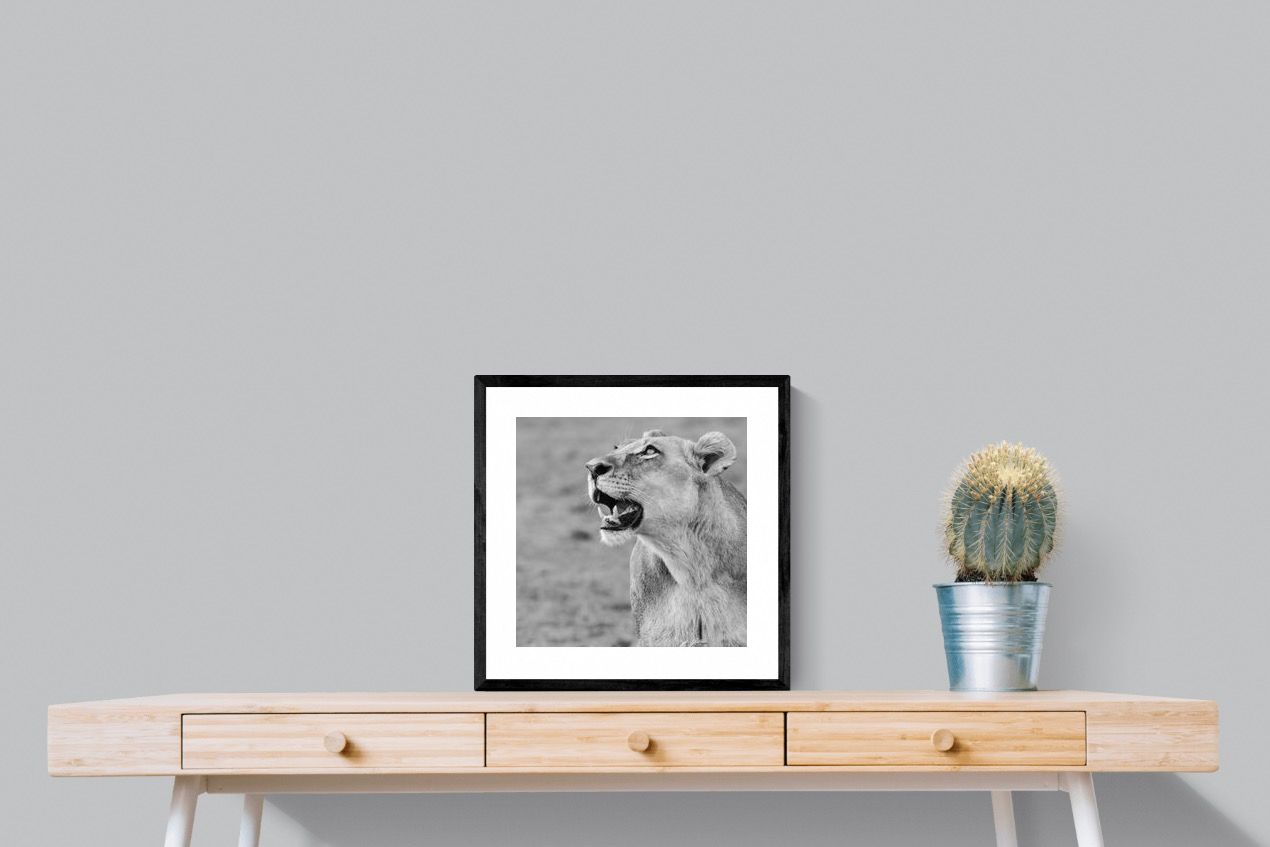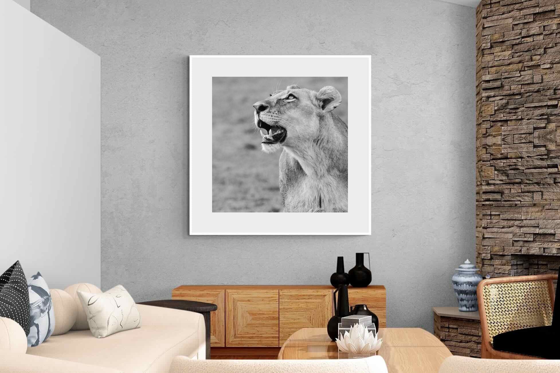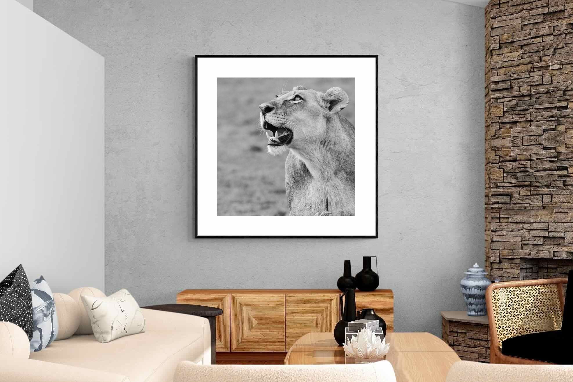 "Lioness Glance" freezes a fleeting moment of grace and alertness, as a lioness looks skyward with quiet strength. Captured in crisp black and white, this fine art wildlife photograph exudes power, poise, and untamed beauty. Ideal for contemporary homes, it pairs beautifully with minimalist or neutral décor, adding a focal point that is both elegant and expressive. The portrait’s clean composition and tonal depth make it a timeless piece, evoking wonder and admiration for the wild world beyond our walls.