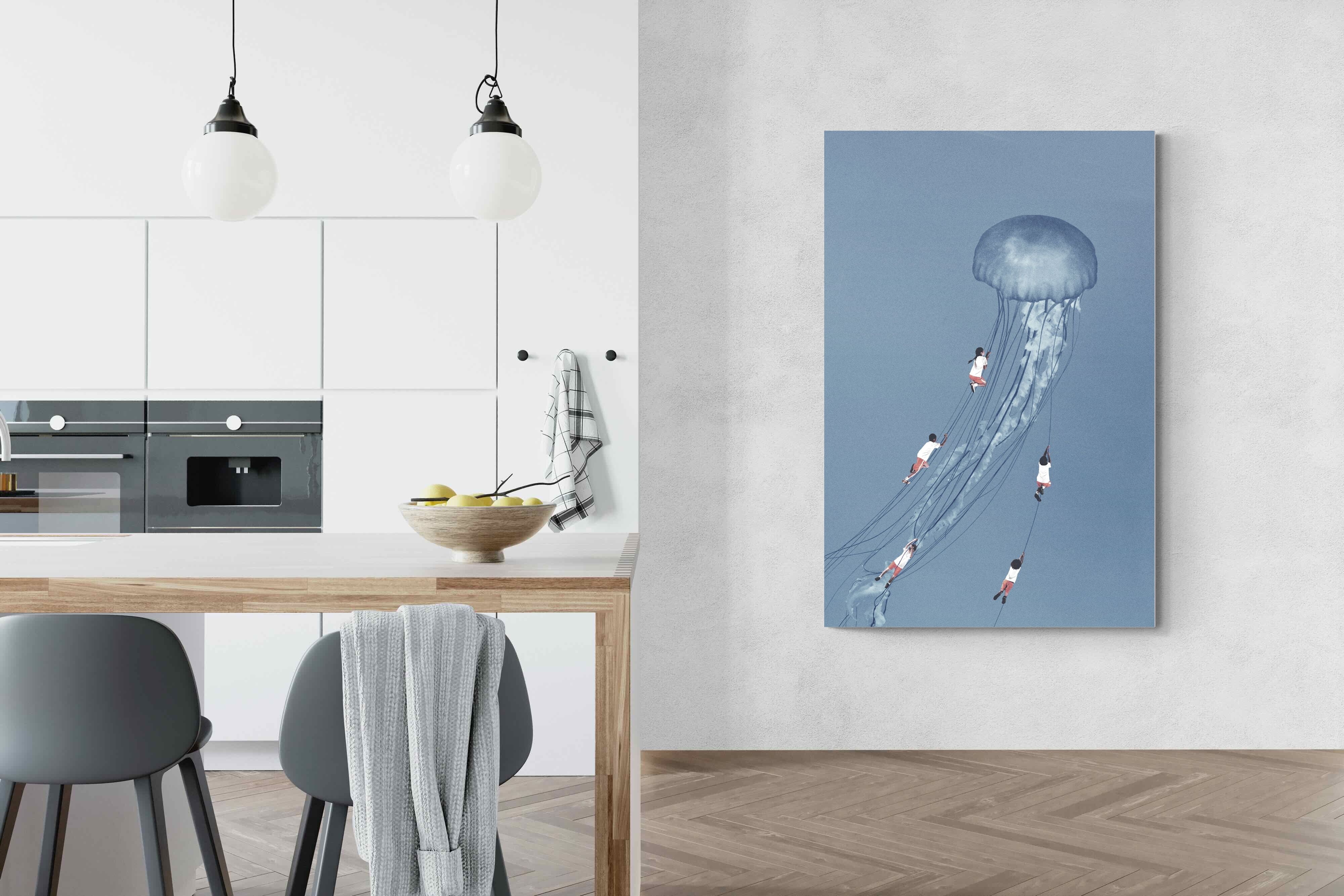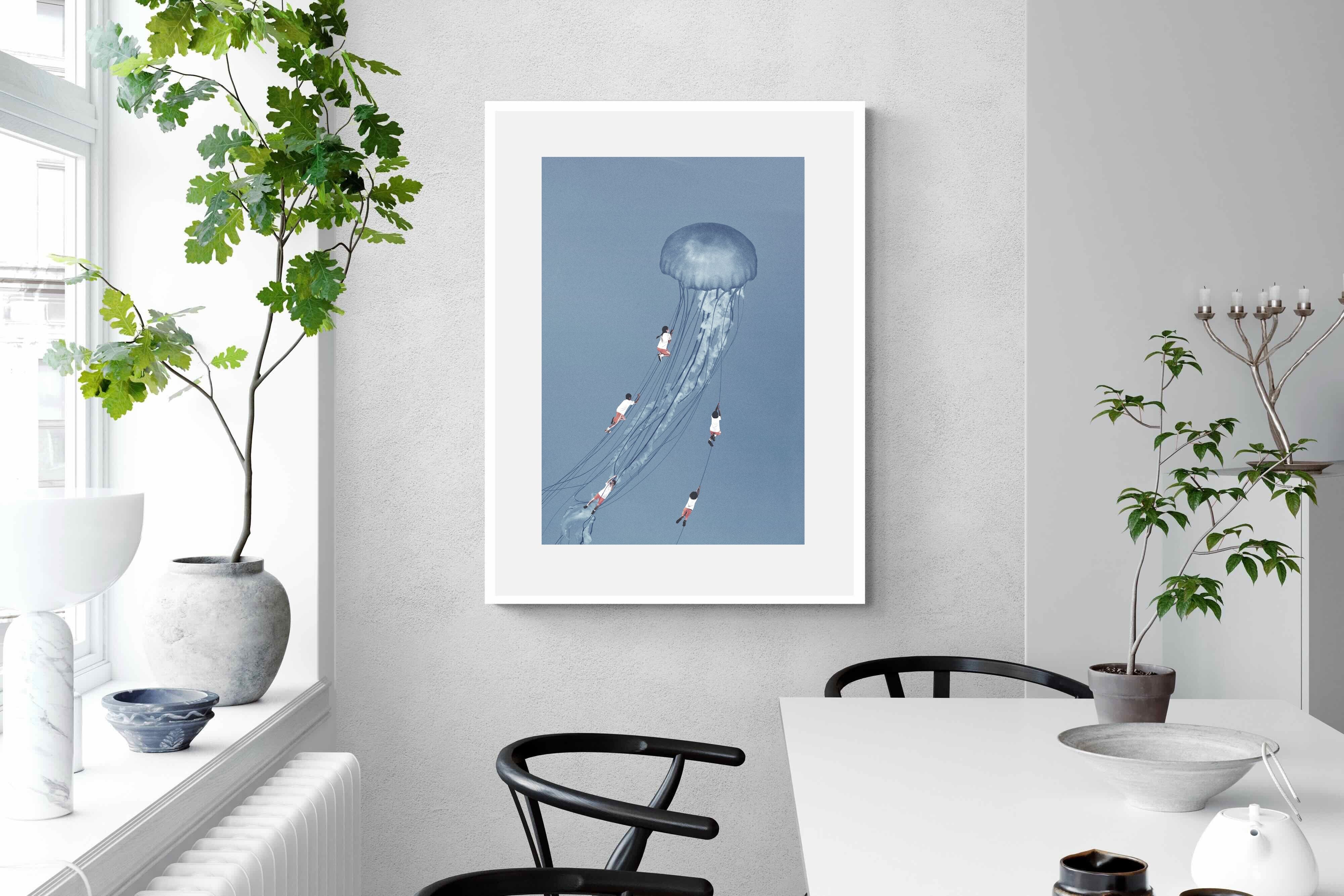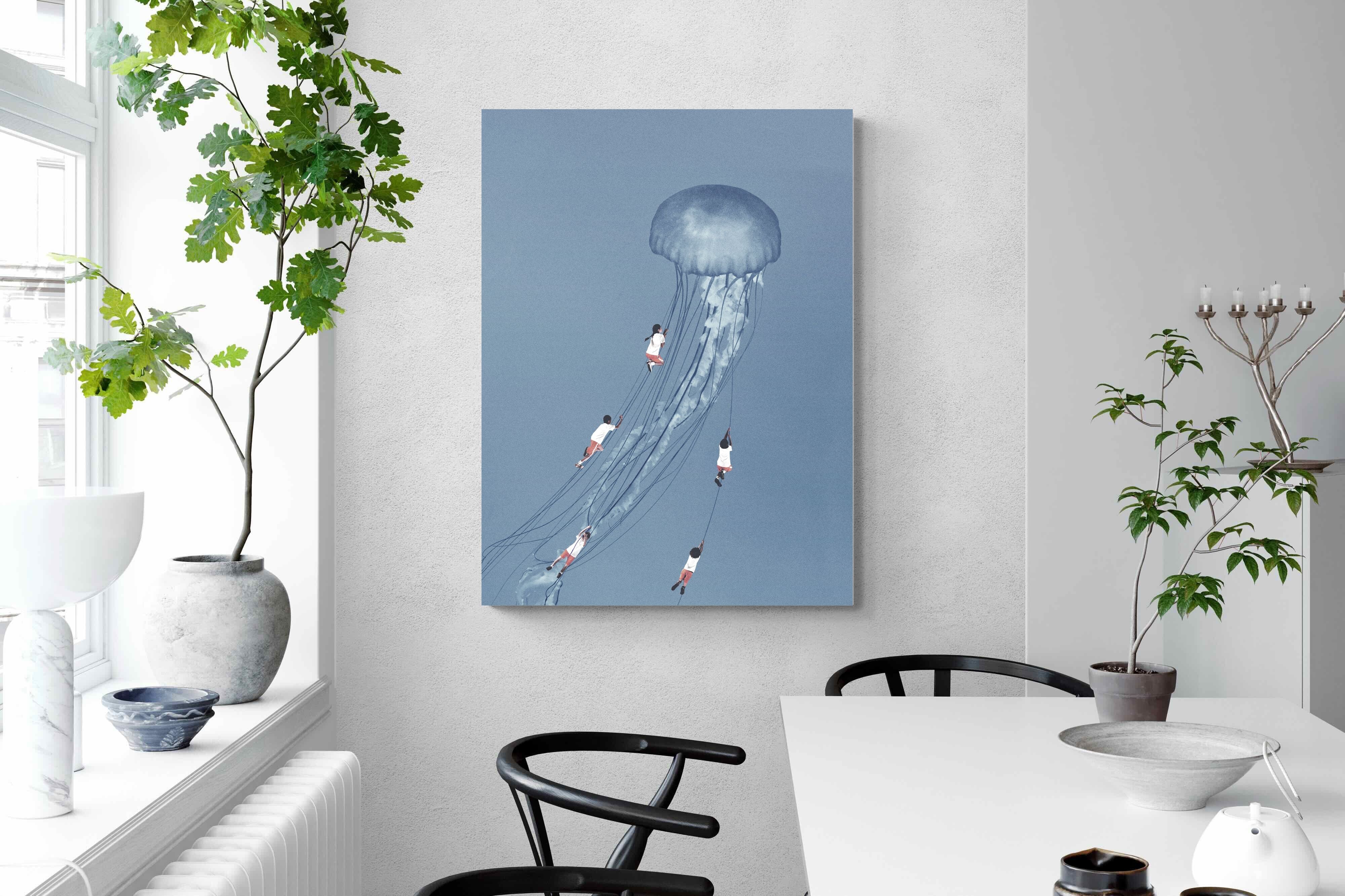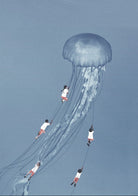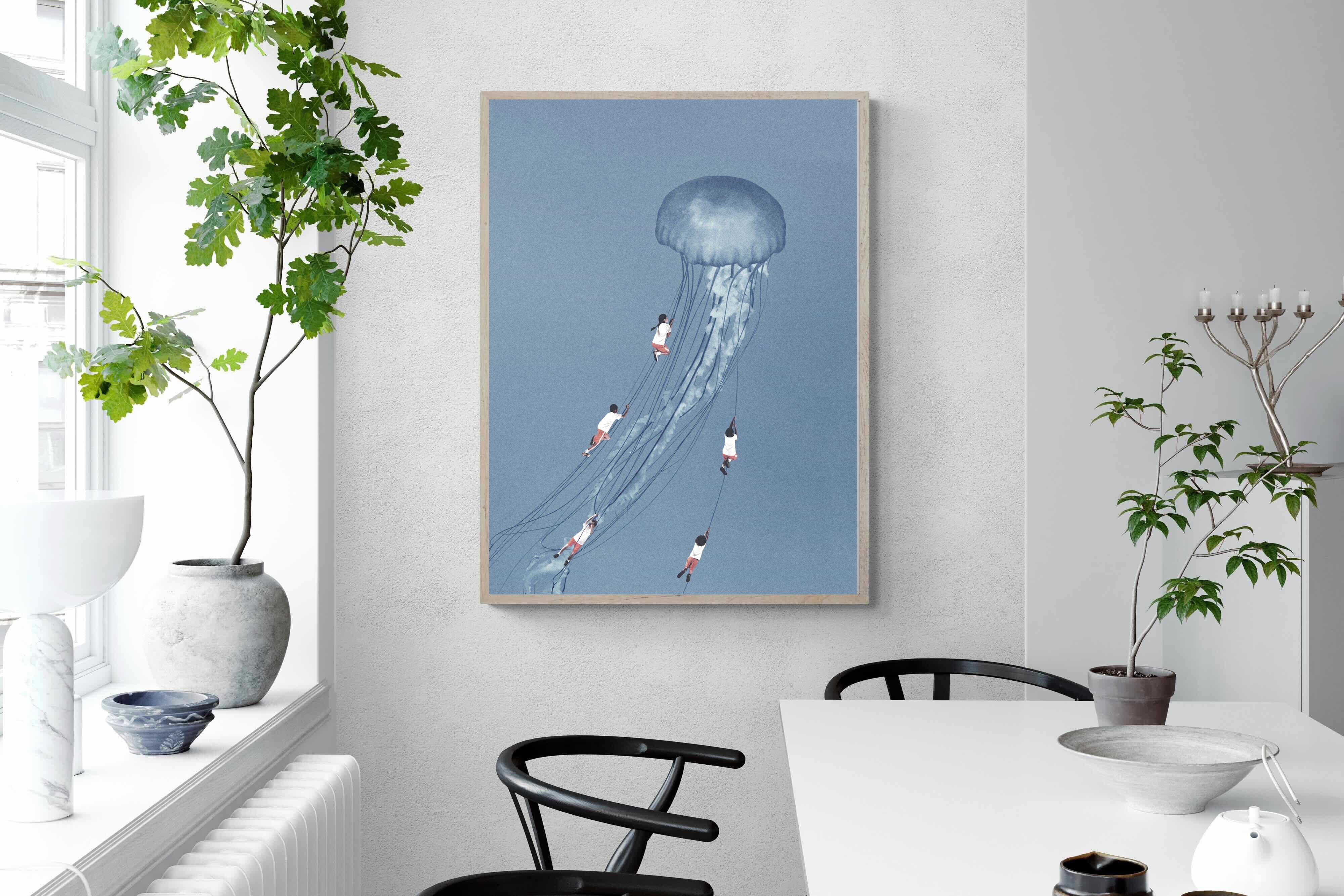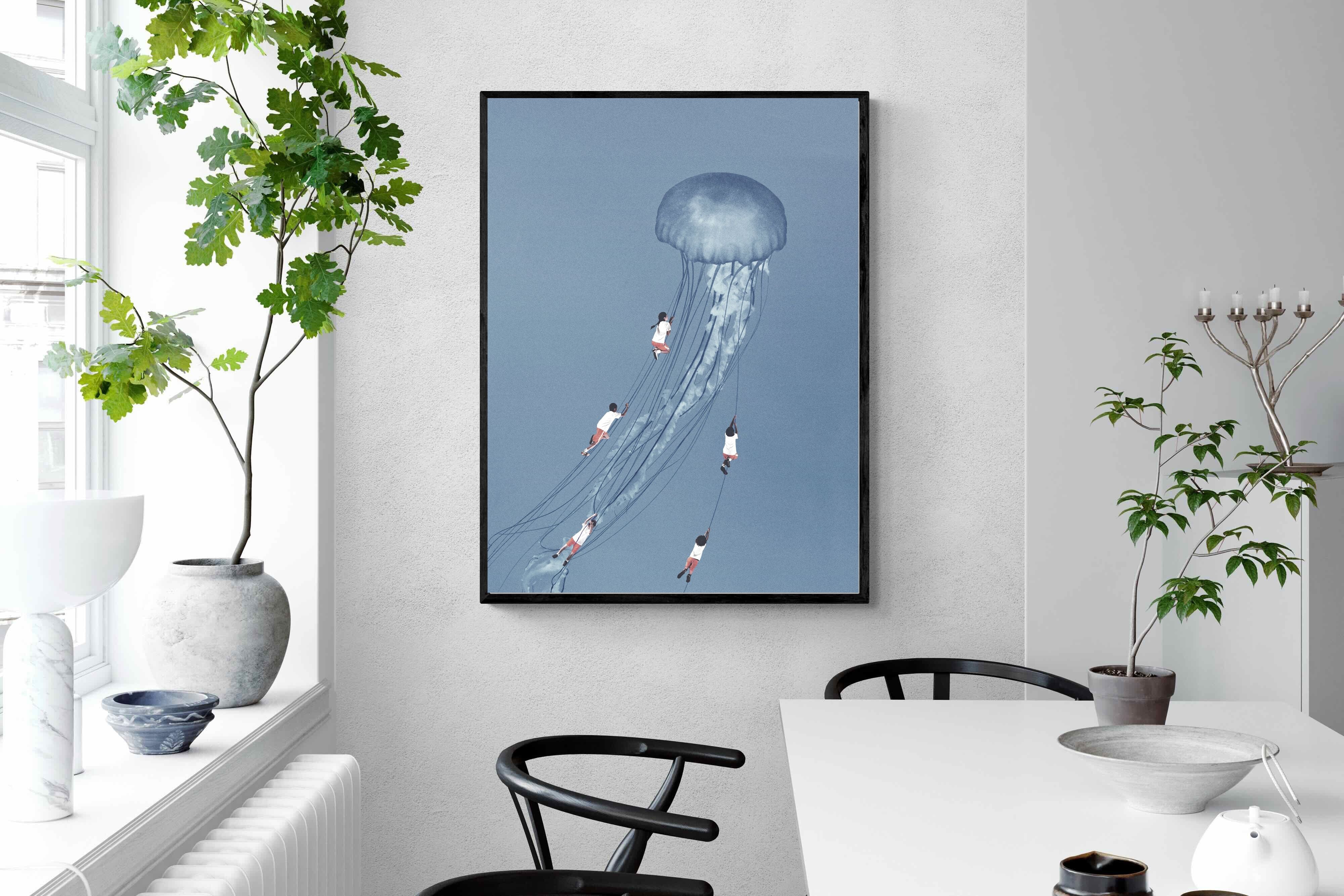 "Drifting Dreams" is a mesmerising surreal artwork where children, suspended in midair, climb the delicate tendrils of a giant jellyfish. Set against a soft blue backdrop, this ethereal scene evokes a sense of adventure, escapism, and the boundless imagination of youth. The juxtaposition of human playfulness with the otherworldly form of the jellyfish creates a visually poetic narrative, ideal for those who appreciate dreamlike and whimsical art.