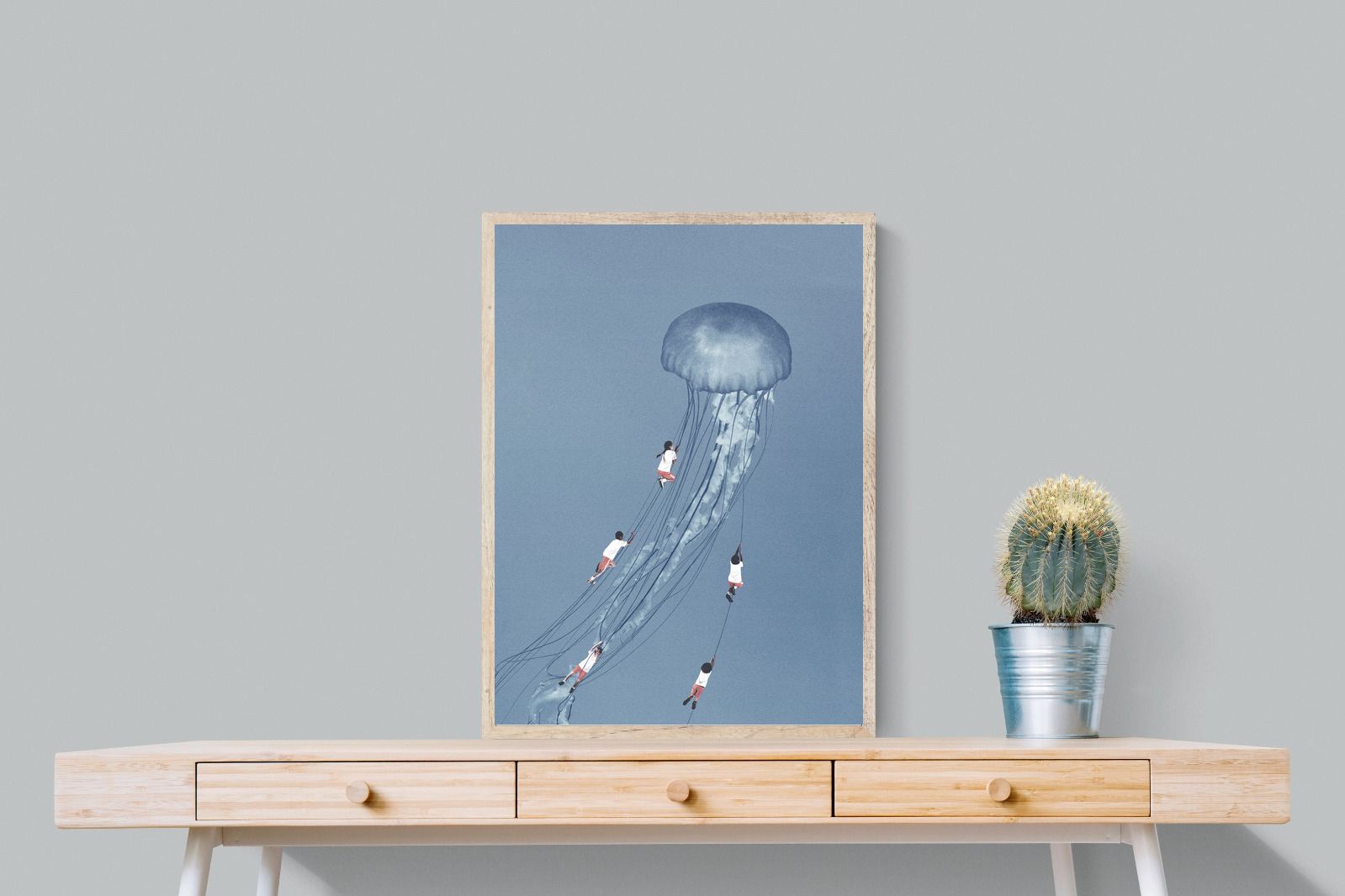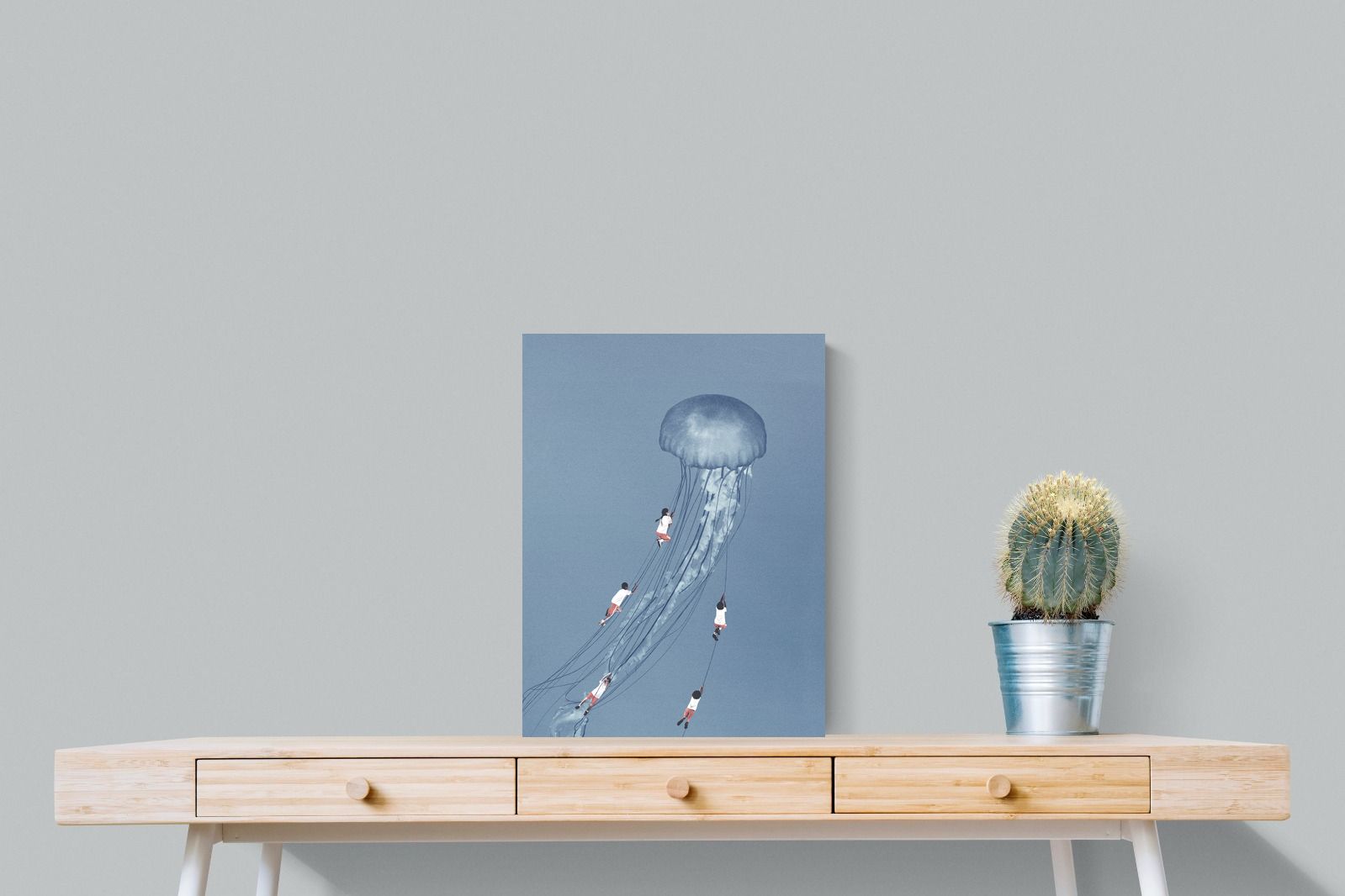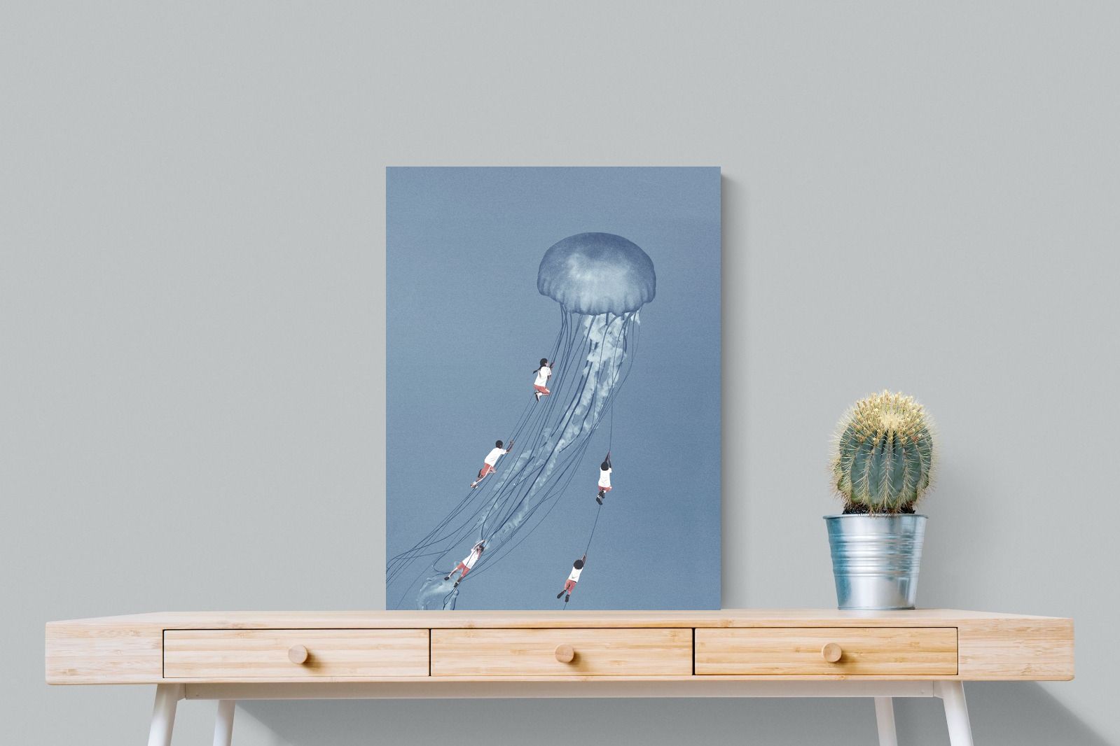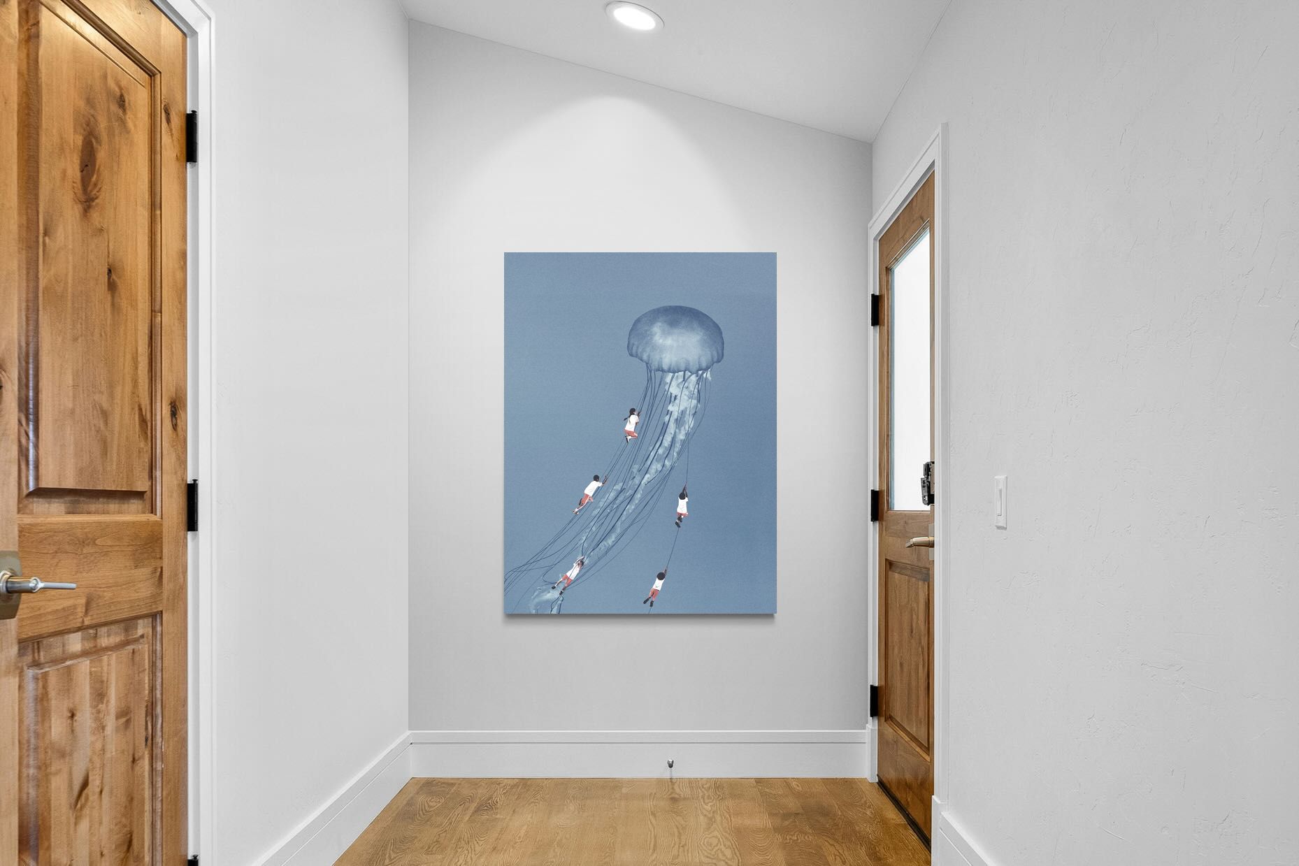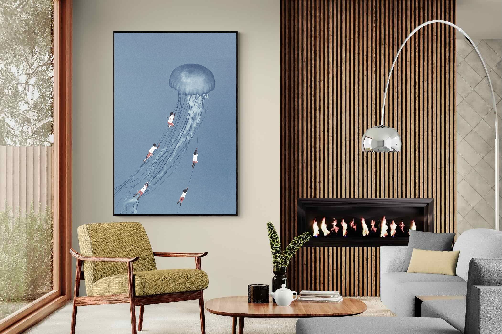 "Drifting Dreams" is a mesmerising surreal artwork where children, suspended in midair, climb the delicate tendrils of a giant jellyfish. Set against a soft blue backdrop, this ethereal scene evokes a sense of adventure, escapism, and the boundless imagination of youth. The juxtaposition of human playfulness with the otherworldly form of the jellyfish creates a visually poetic narrative, ideal for those who appreciate dreamlike and whimsical art.