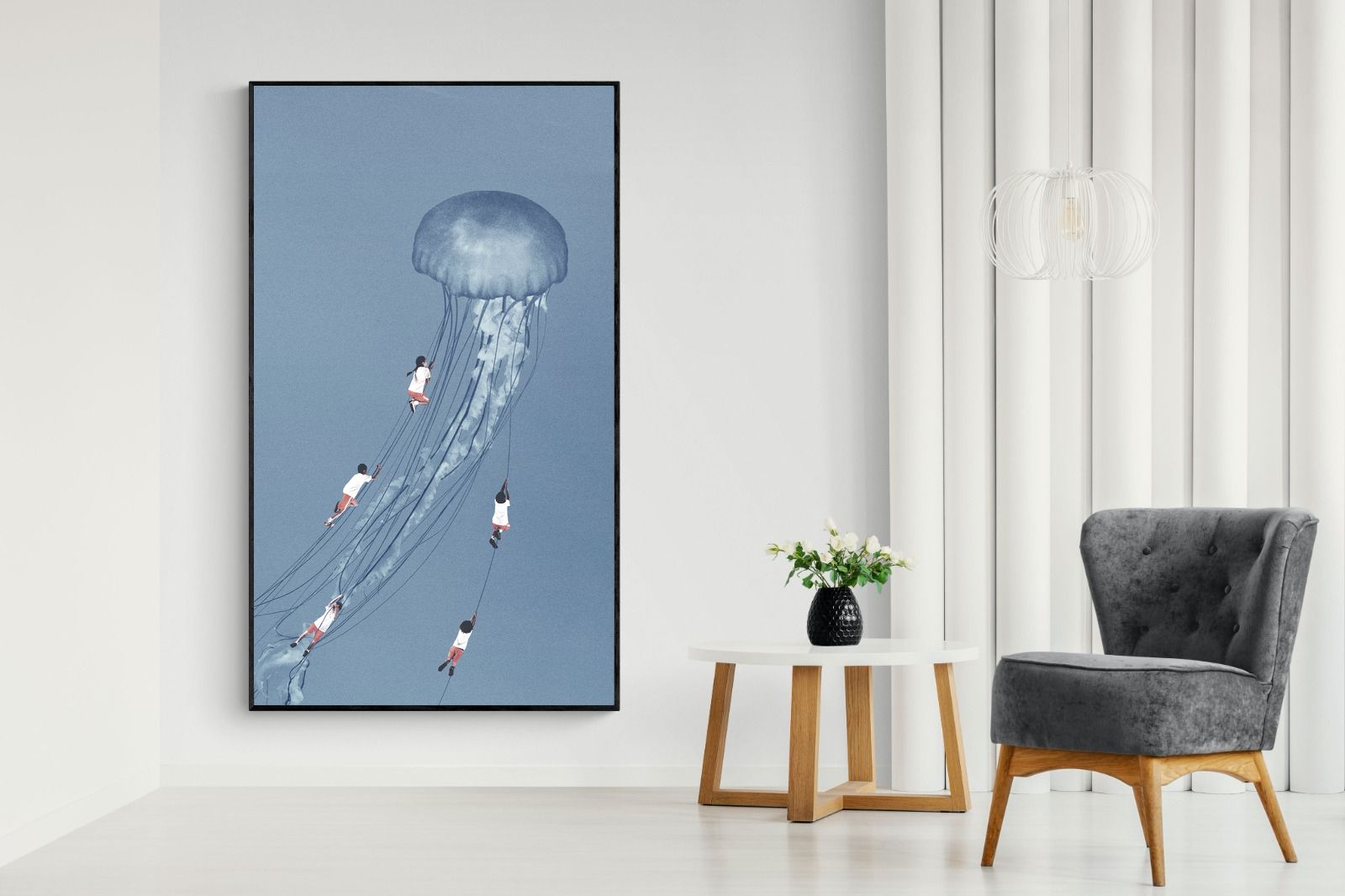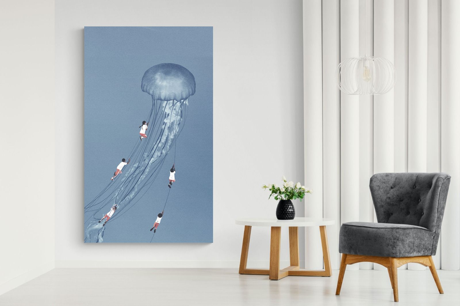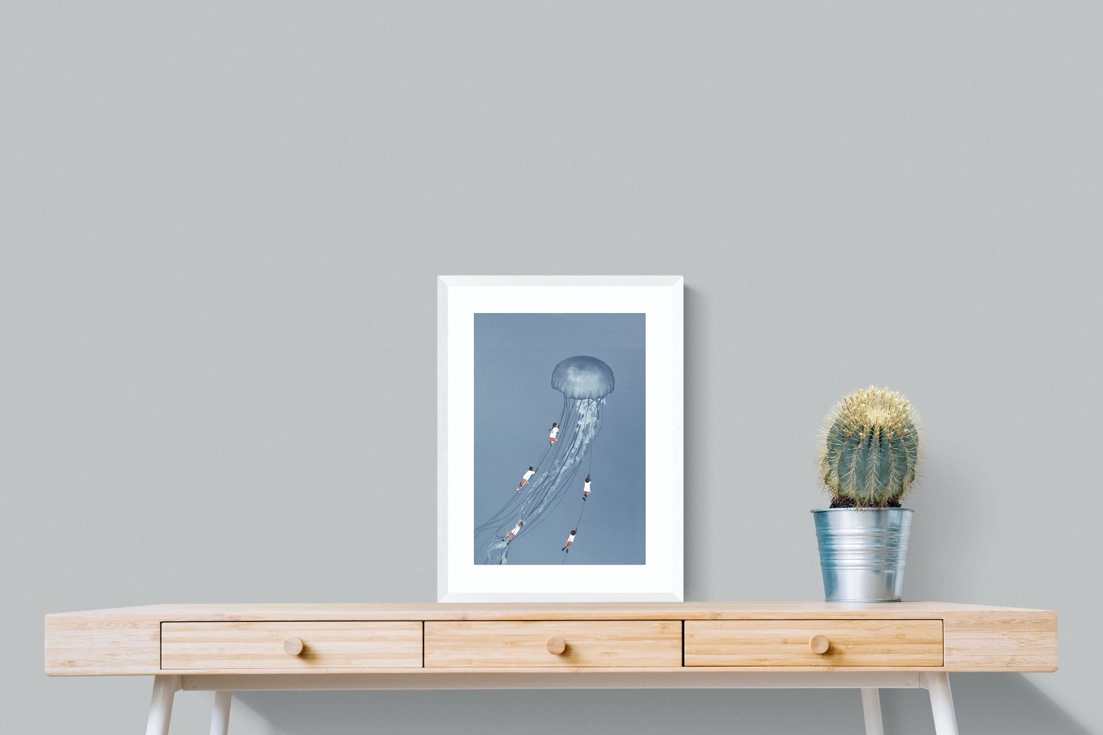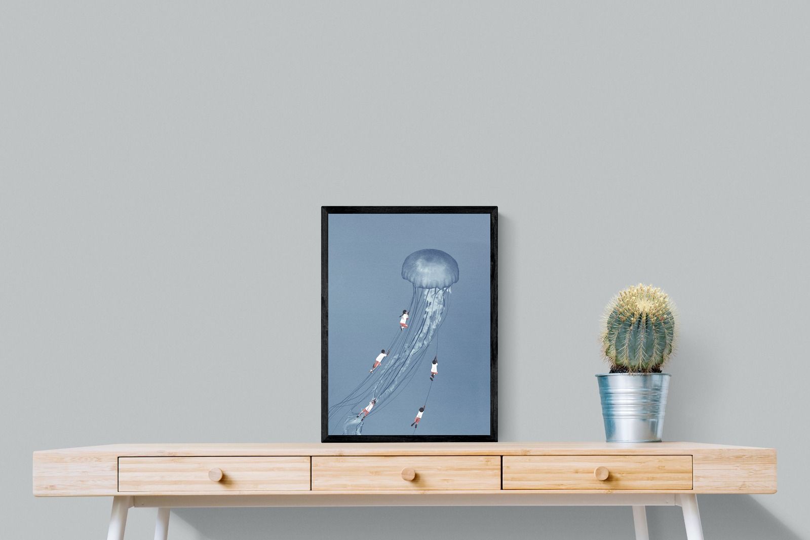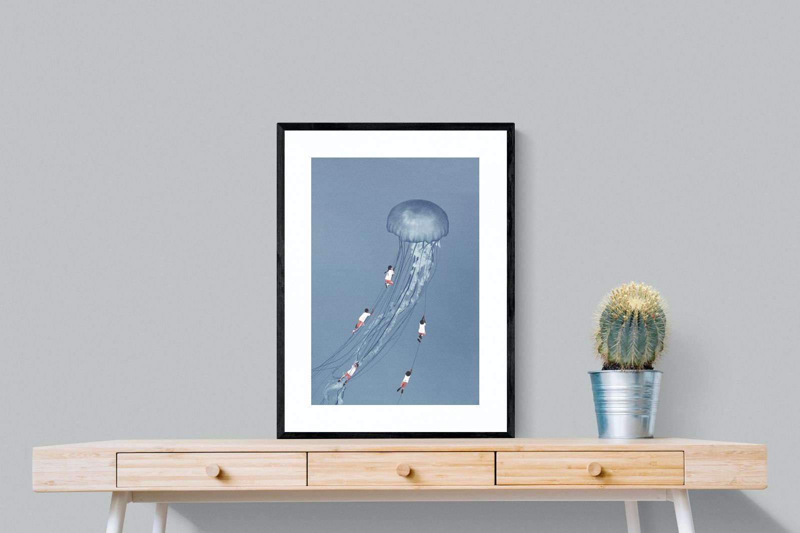 "Drifting Dreams" is a mesmerising surreal artwork where children, suspended in midair, climb the delicate tendrils of a giant jellyfish. Set against a soft blue backdrop, this ethereal scene evokes a sense of adventure, escapism, and the boundless imagination of youth. The juxtaposition of human playfulness with the otherworldly form of the jellyfish creates a visually poetic narrative, ideal for those who appreciate dreamlike and whimsical art.