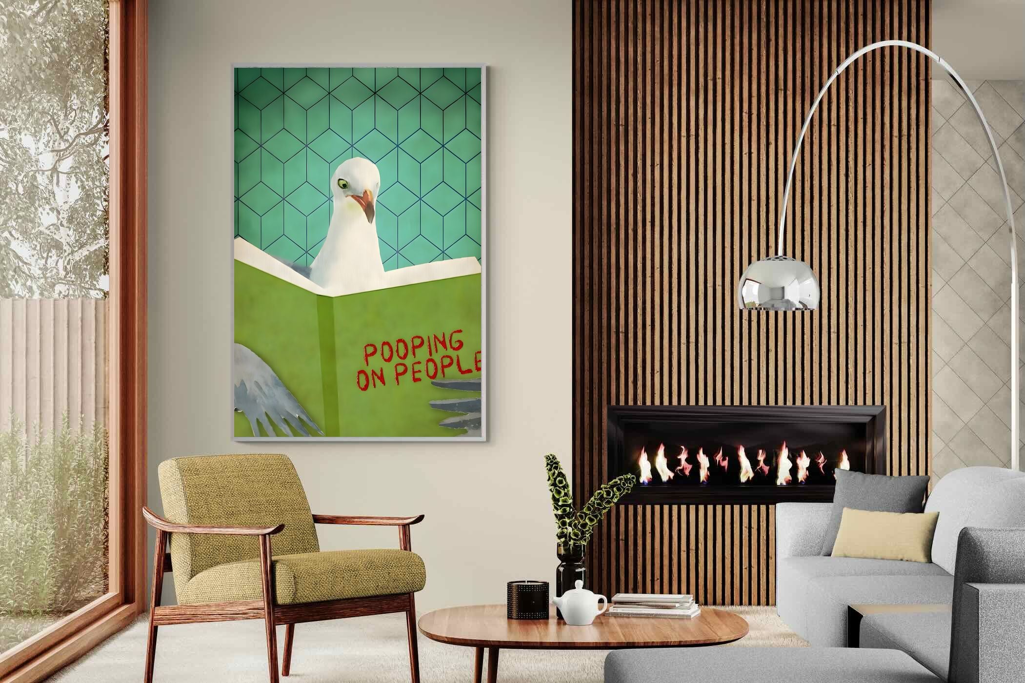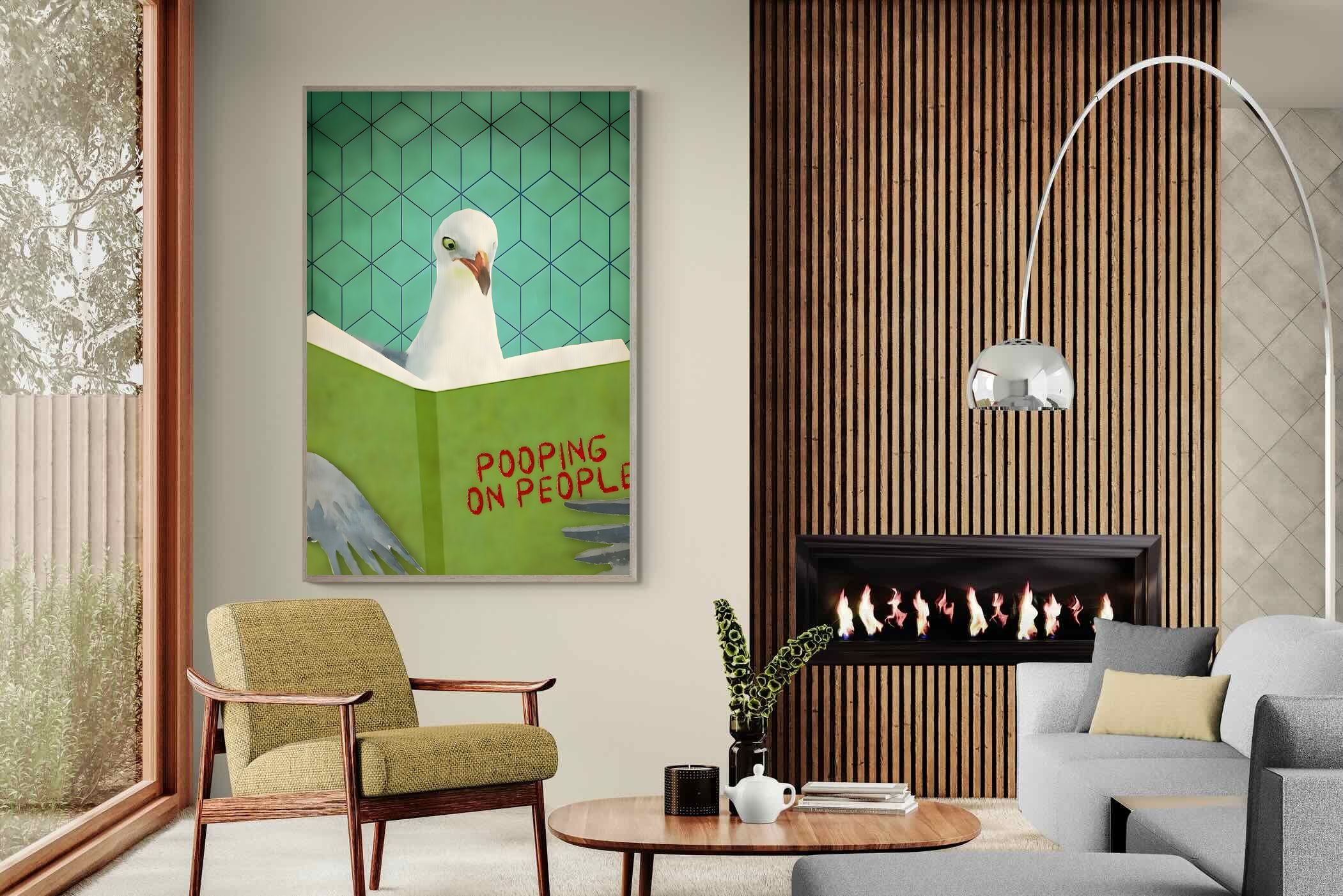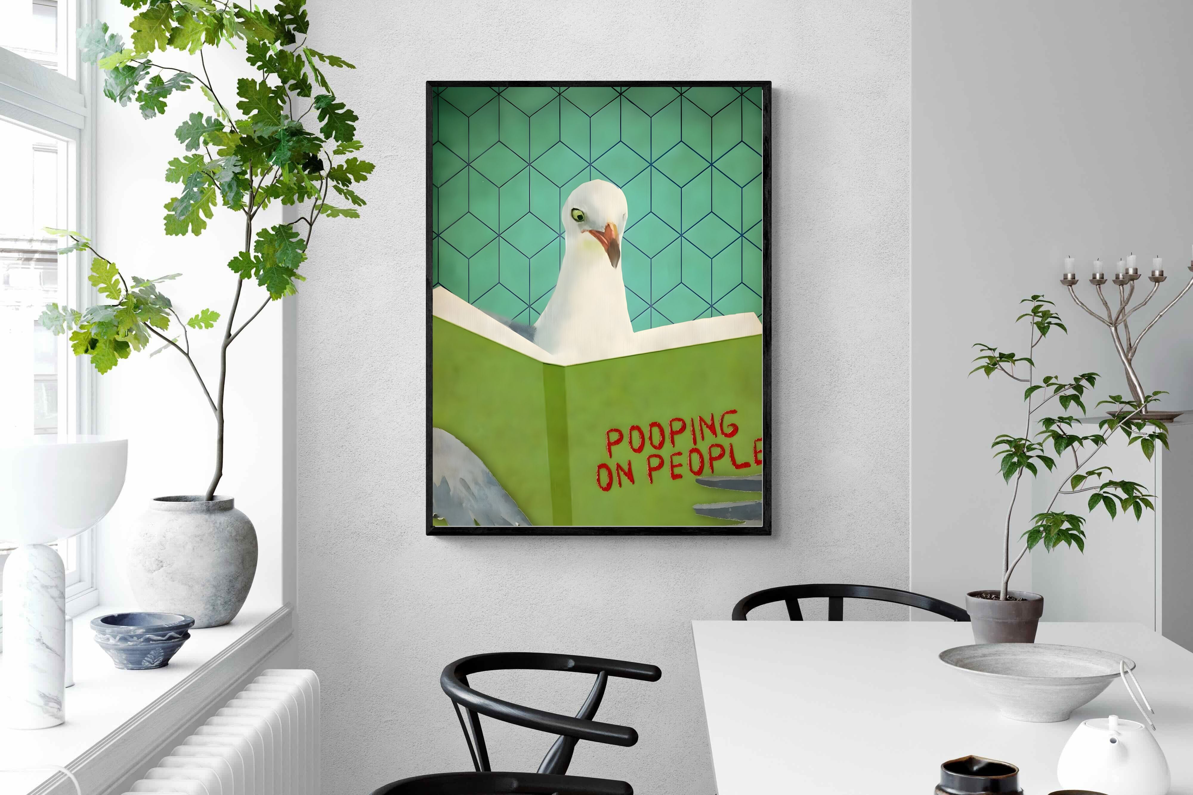 Inject some cheeky humour into your home with this quirky art print featuring a seagull engrossed in a book titled "Pooping on People." Bold and playful, this piece brings a fun, tongue-in-beak twist to coastal or contemporary spaces. Perfect for bathrooms, guest loos, beach houses, or anywhere that could use a light-hearted talking point. Its retro-style background adds visual charm while the unexpected subject matter guarantees a smile. A perfect blend of wit and whimsy for casual interiors.