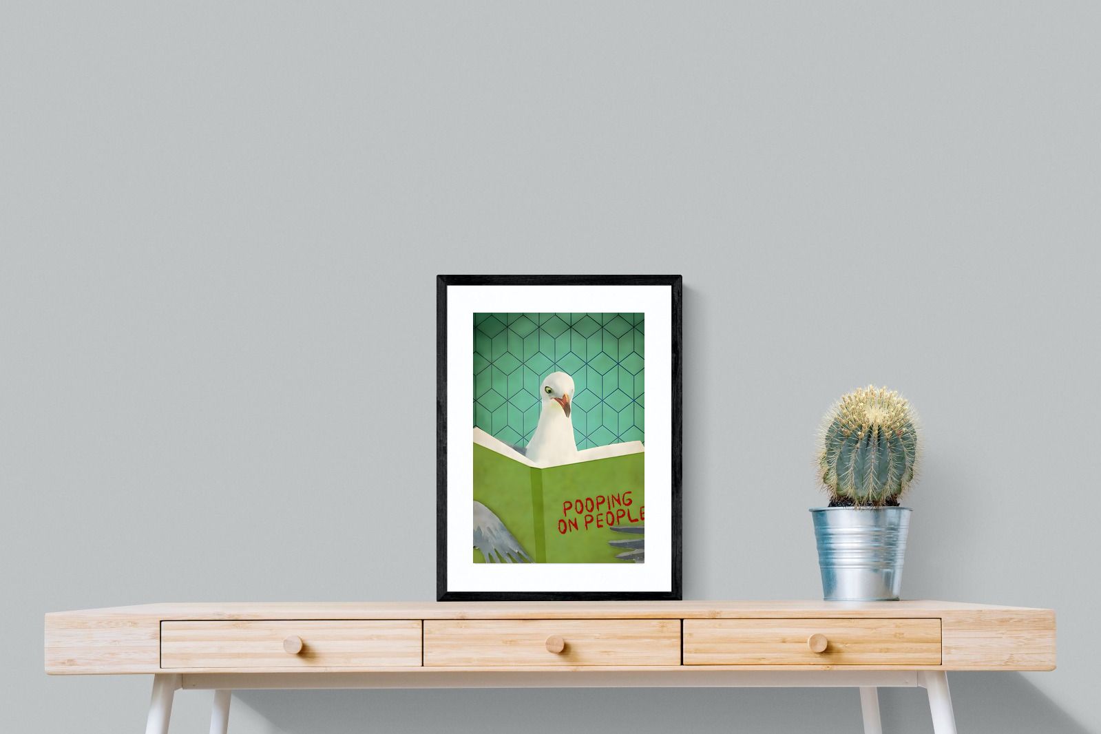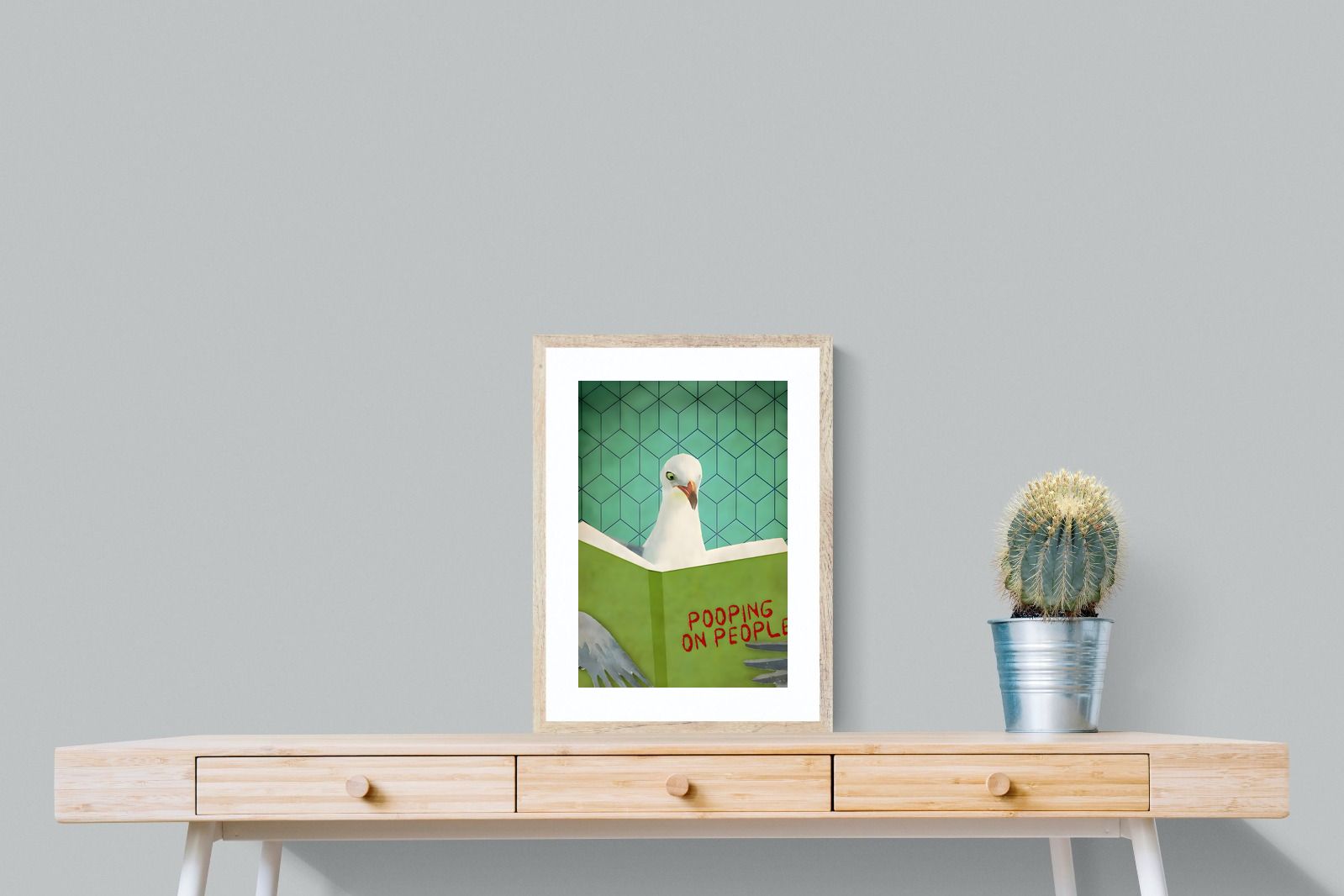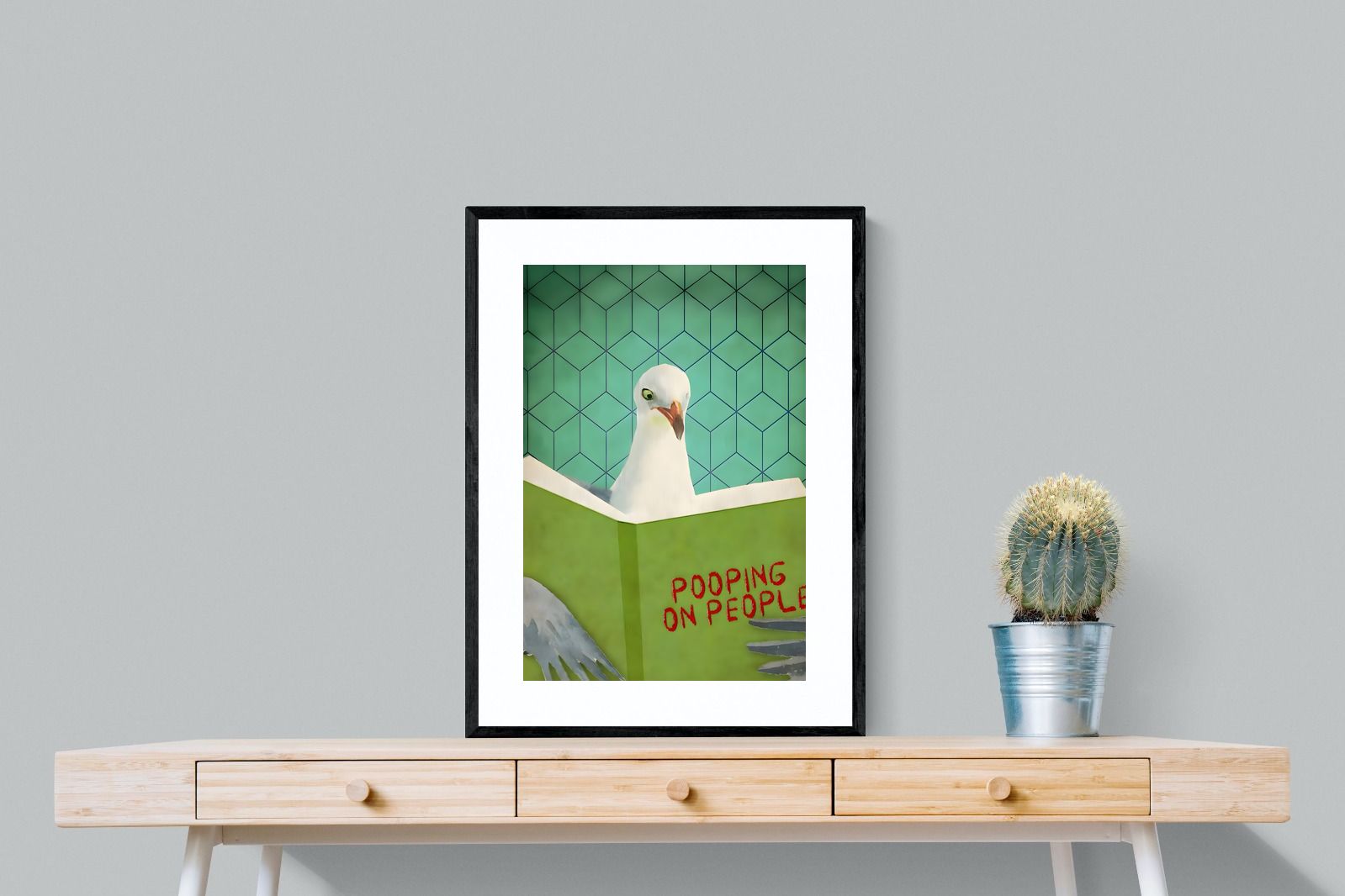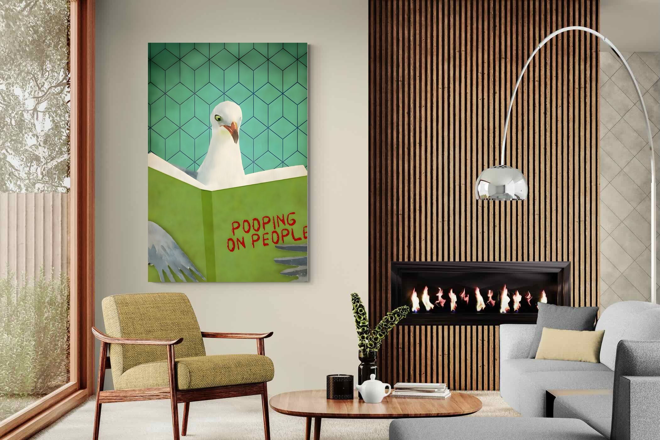 Inject some cheeky humour into your home with this quirky art print featuring a seagull engrossed in a book titled "Pooping on People." Bold and playful, this piece brings a fun, tongue-in-beak twist to coastal or contemporary spaces. Perfect for bathrooms, guest loos, beach houses, or anywhere that could use a light-hearted talking point. Its retro-style background adds visual charm while the unexpected subject matter guarantees a smile. A perfect blend of wit and whimsy for casual interiors.