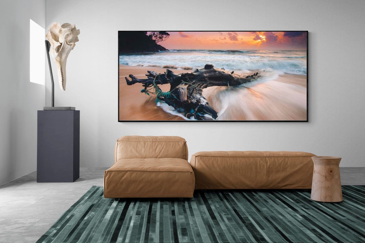 A dynamic coastal scene capturing waves rushing around weathered driftwood under a vivid sunset sky. The motion of the water contrasts beautifully with the stillness of the shoreline, creating a powerful and immersive composition. Warm tones of orange and pink blend with deep blues, adding depth and atmosphere. Ideal for coastal or modern interiors, this artwork brings energy and natural drama into any space while maintaining a refined, photographic aesthetic.