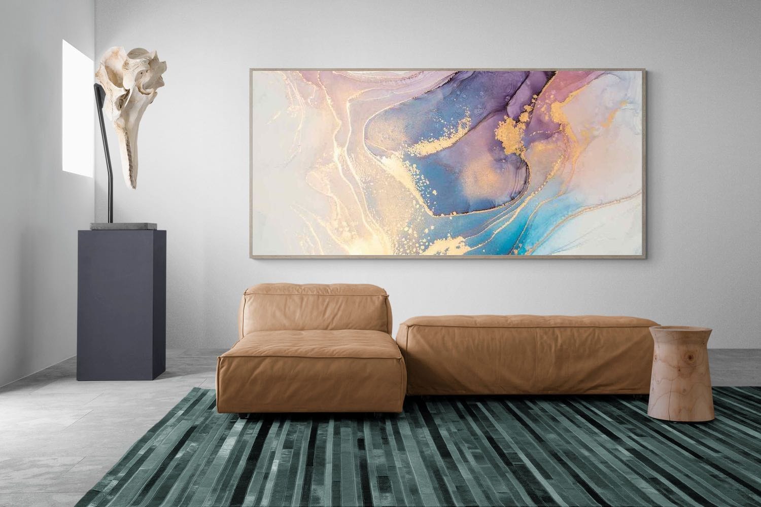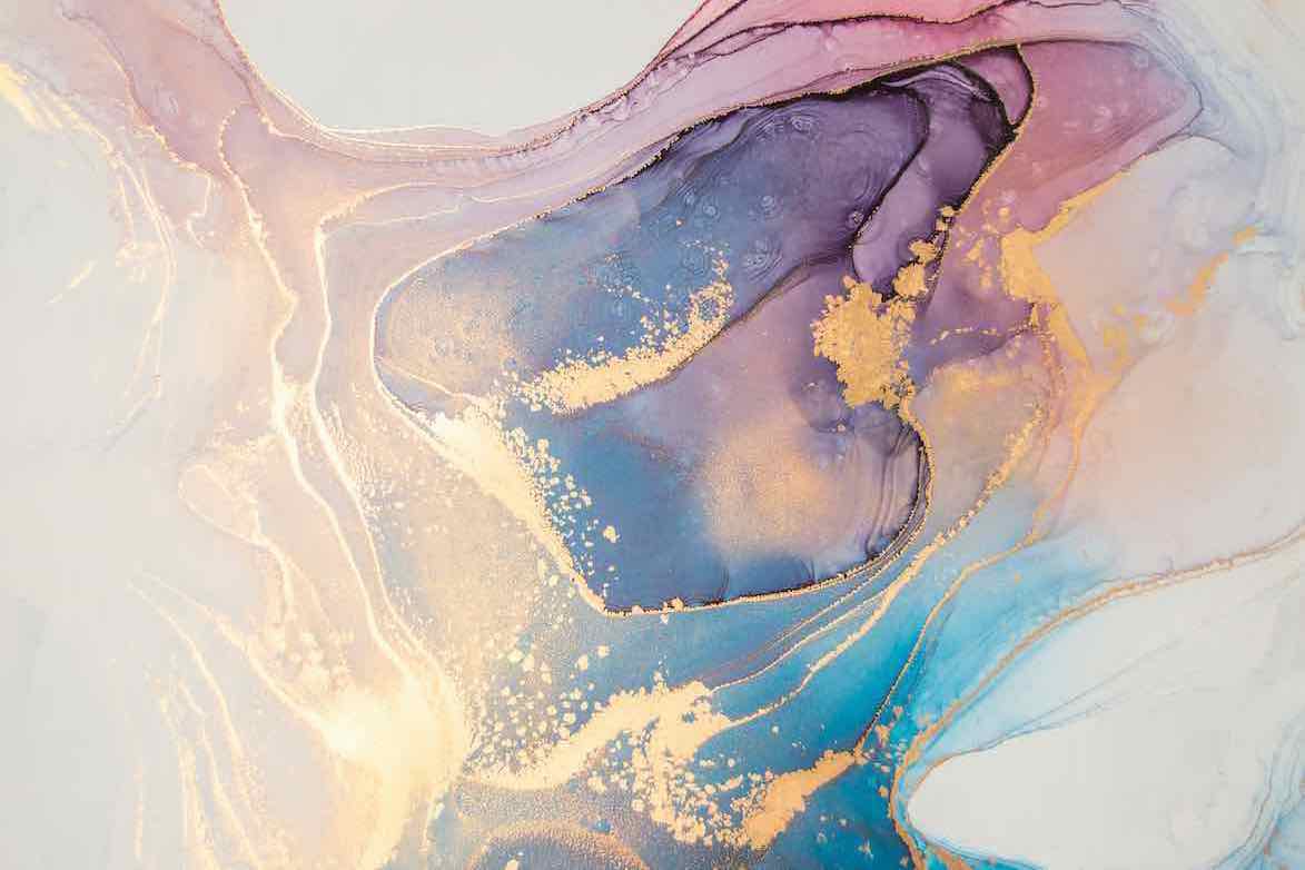 Fluid art painting using an alcohol & ink technique. A mixture of soft blues, pinks and purples paints with glowing golden veins.