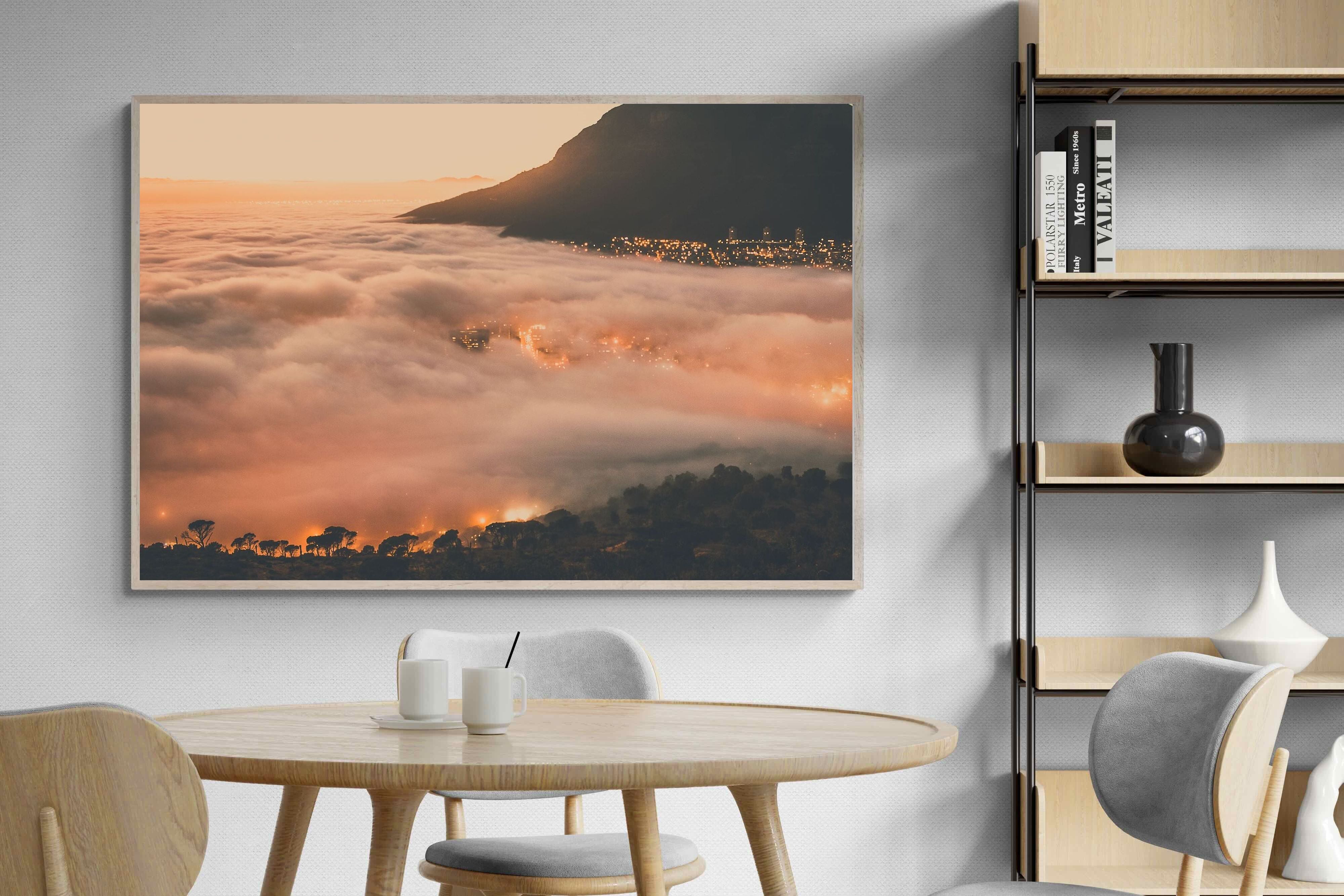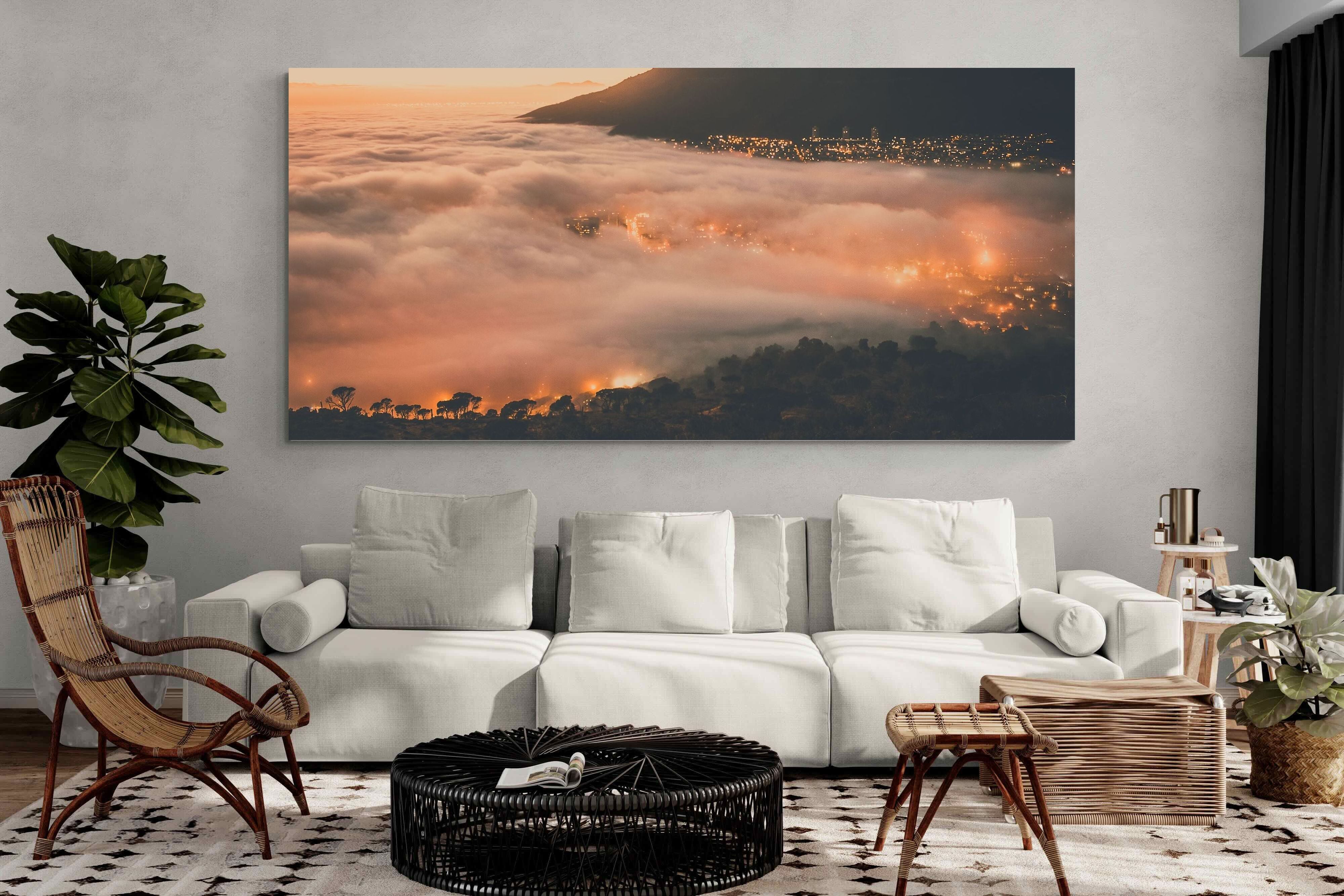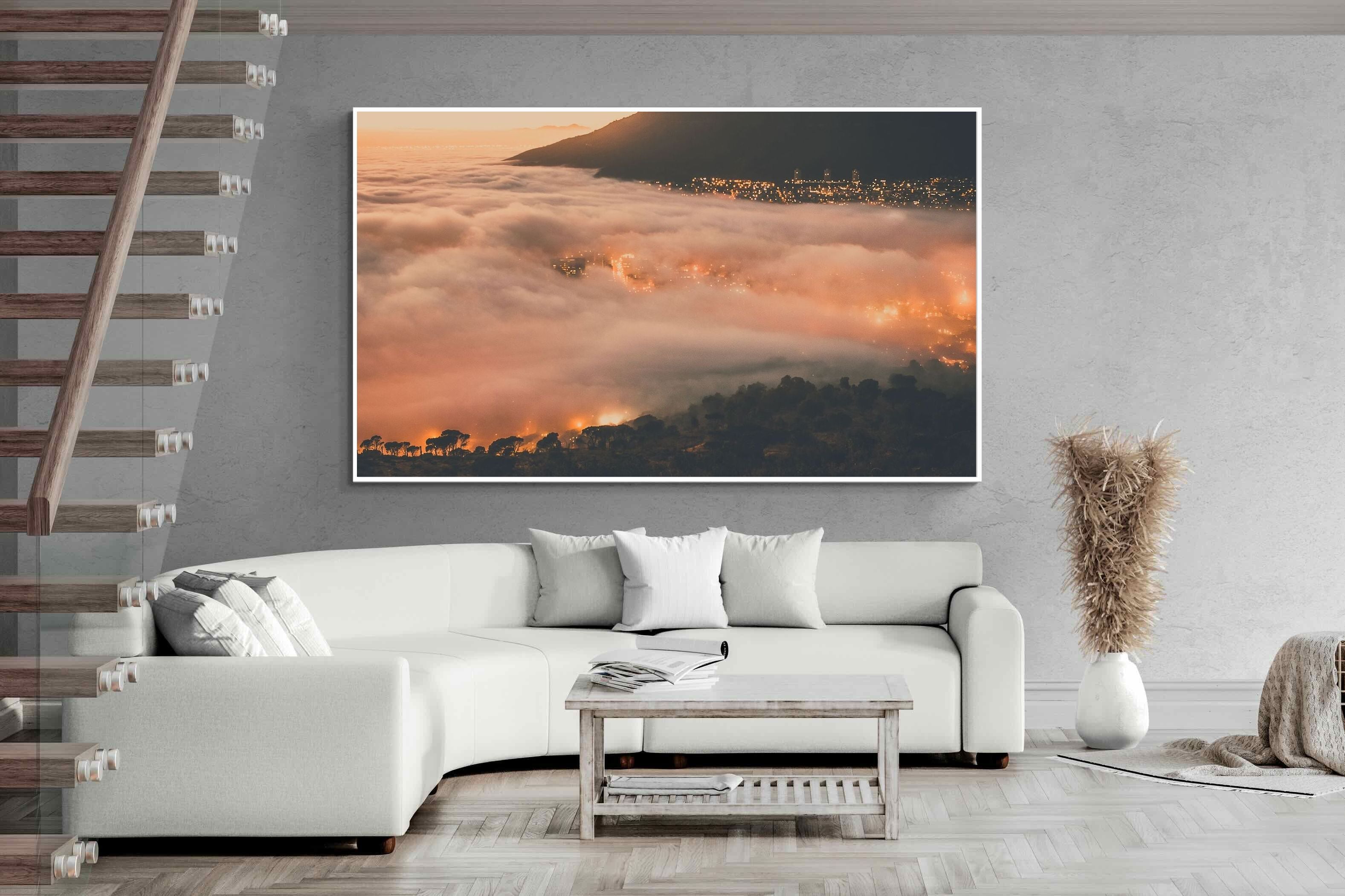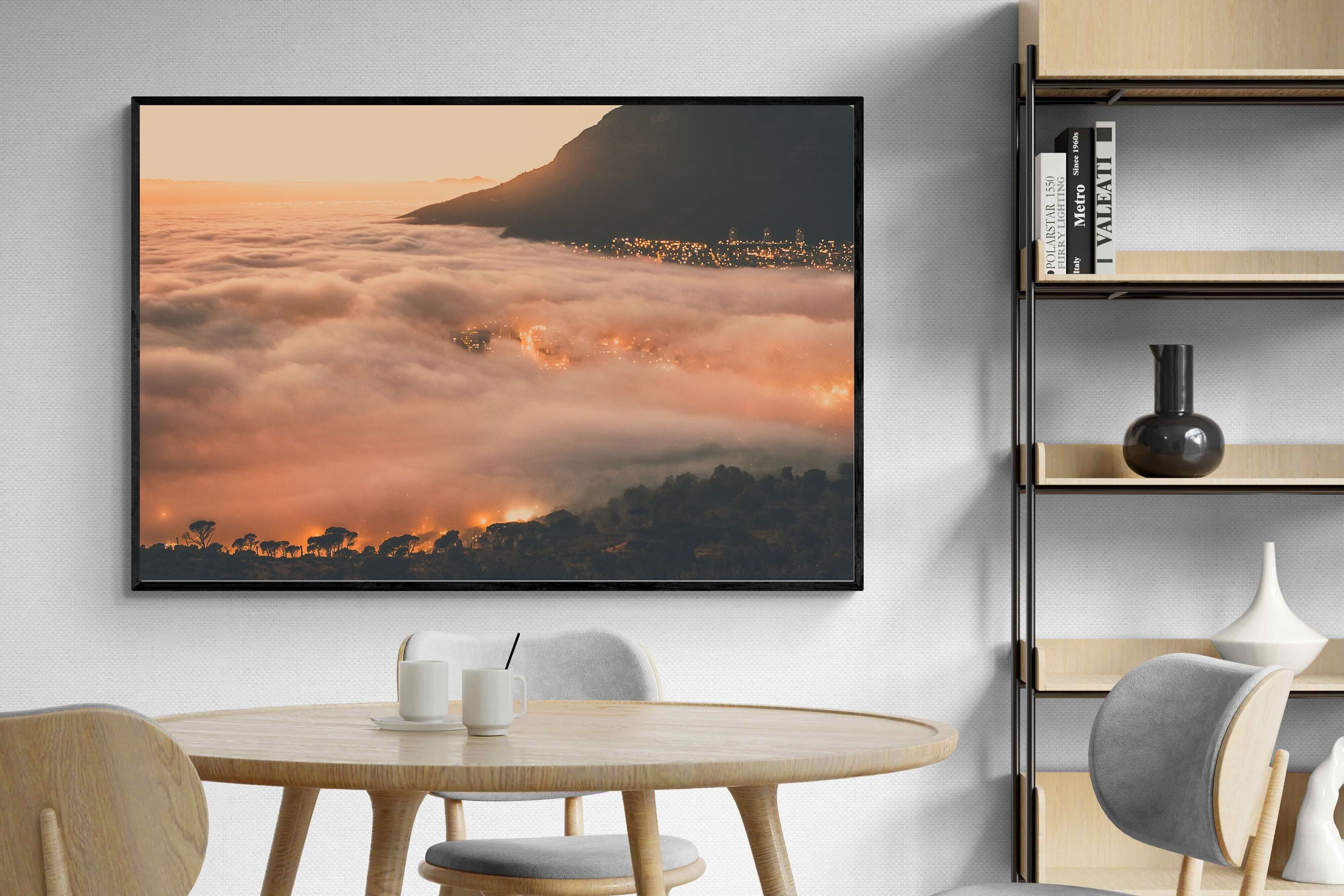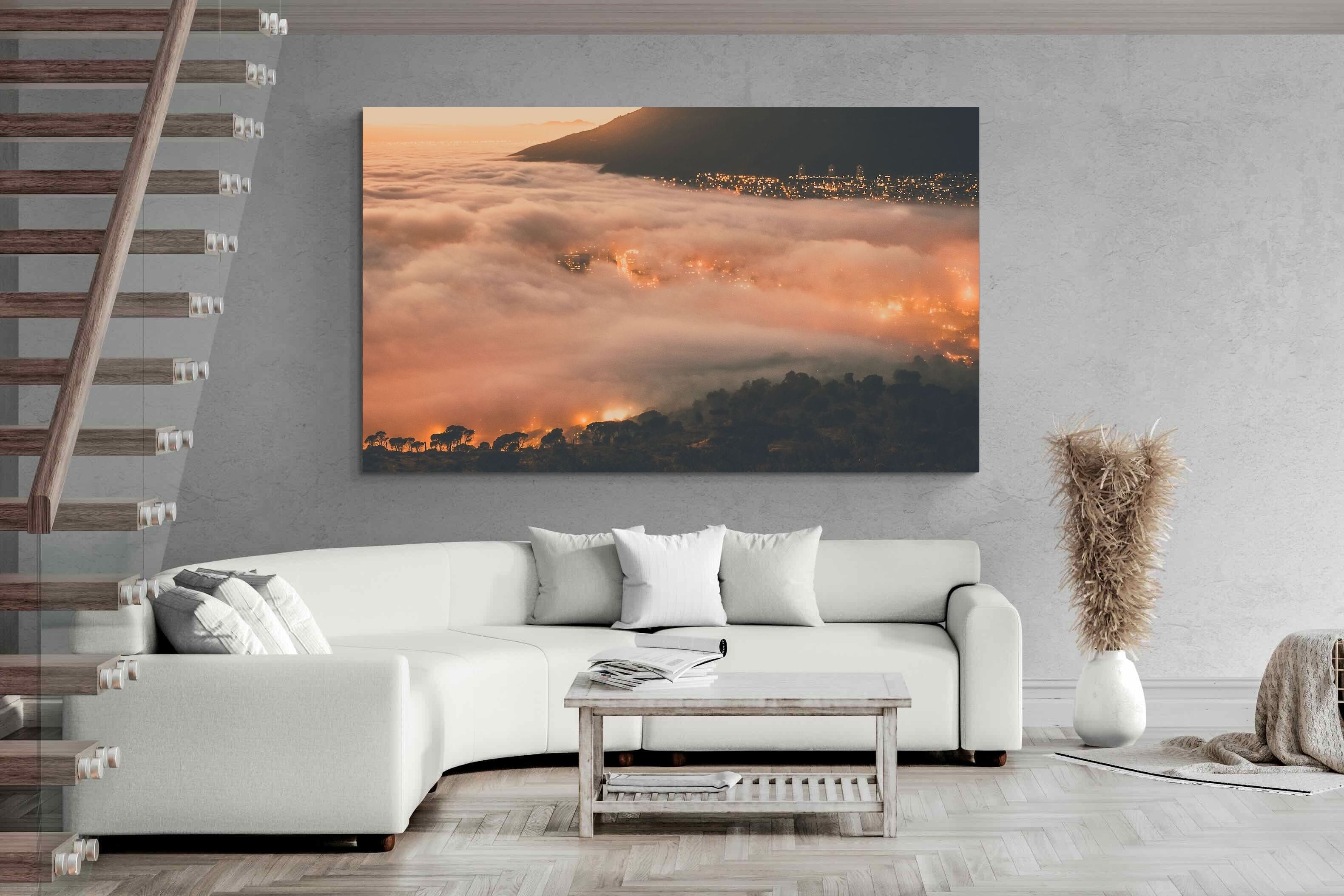 An extraordinary view of Cape Town blanketed by thick clouds with city lights glowing beneath creates a dreamlike urban scene. This photograph captures the mystery and allure of nature meeting city life. Best suited for modern apartments or creative workspaces, it adds ambience and a soft, cinematic touch. A moody, mesmerising piece that speaks of elevation—both in location and spirit.