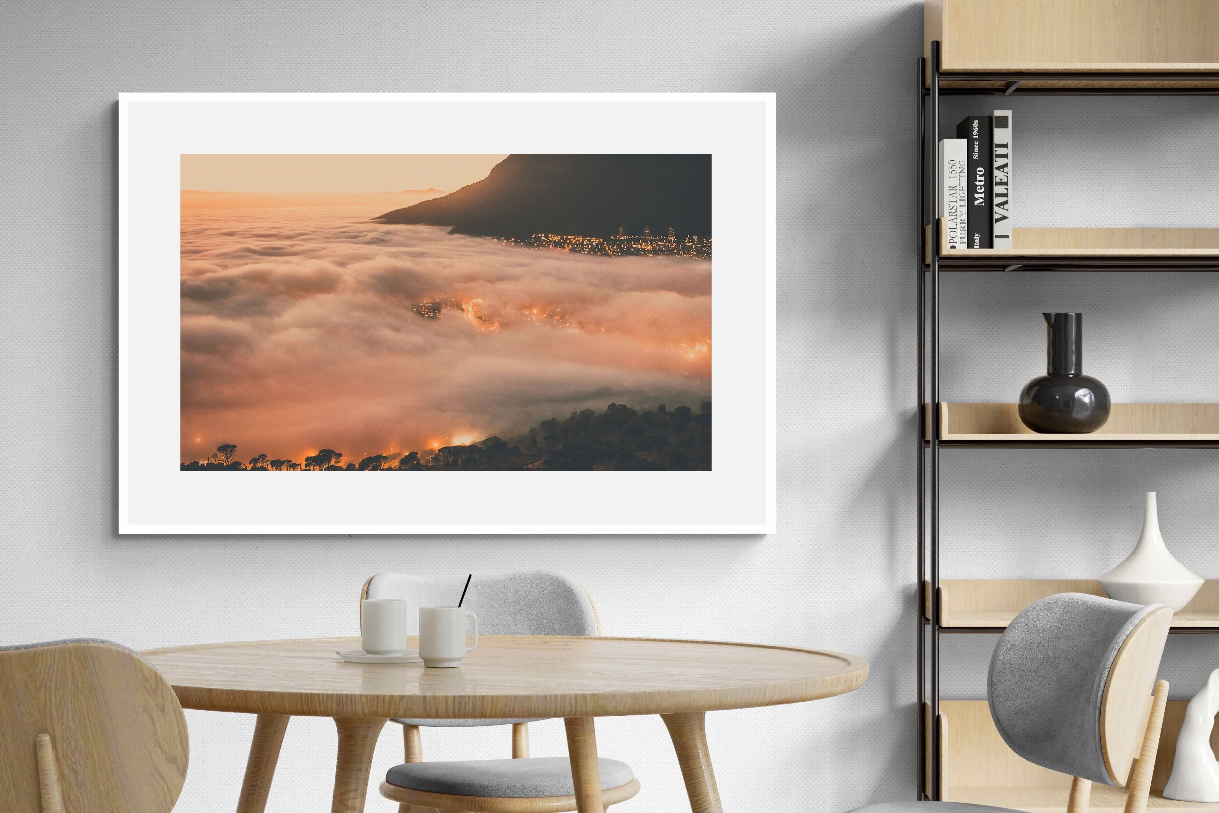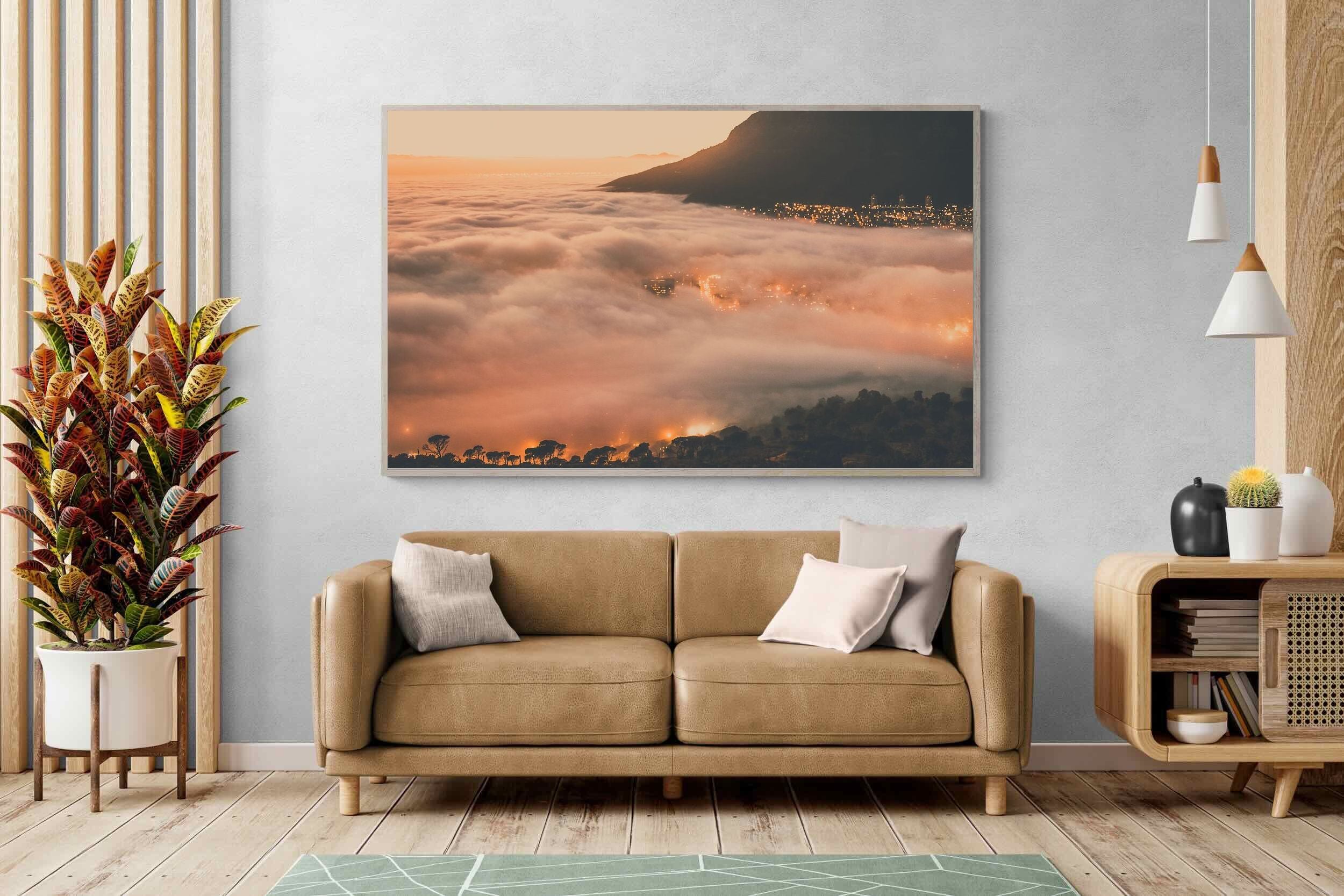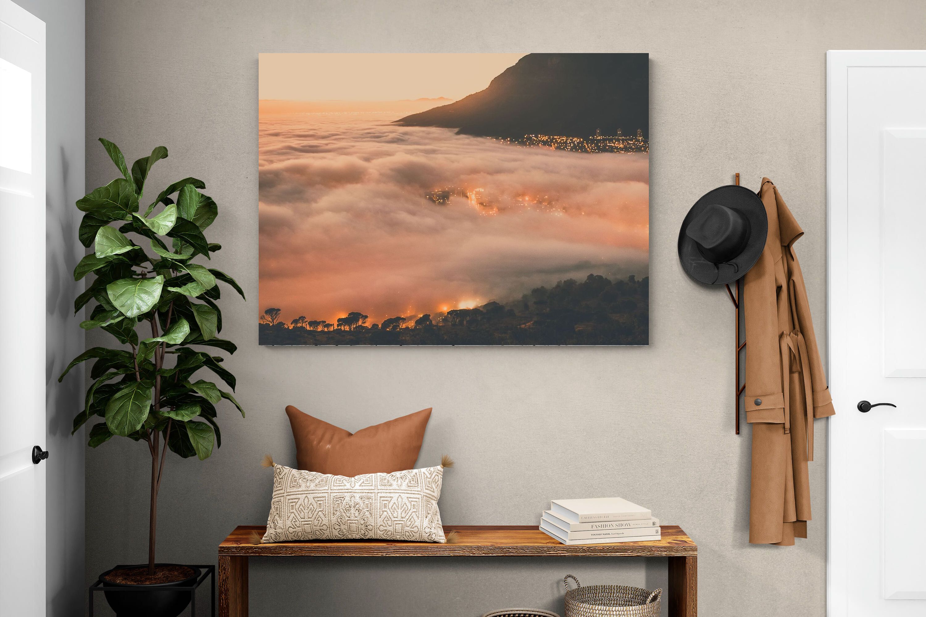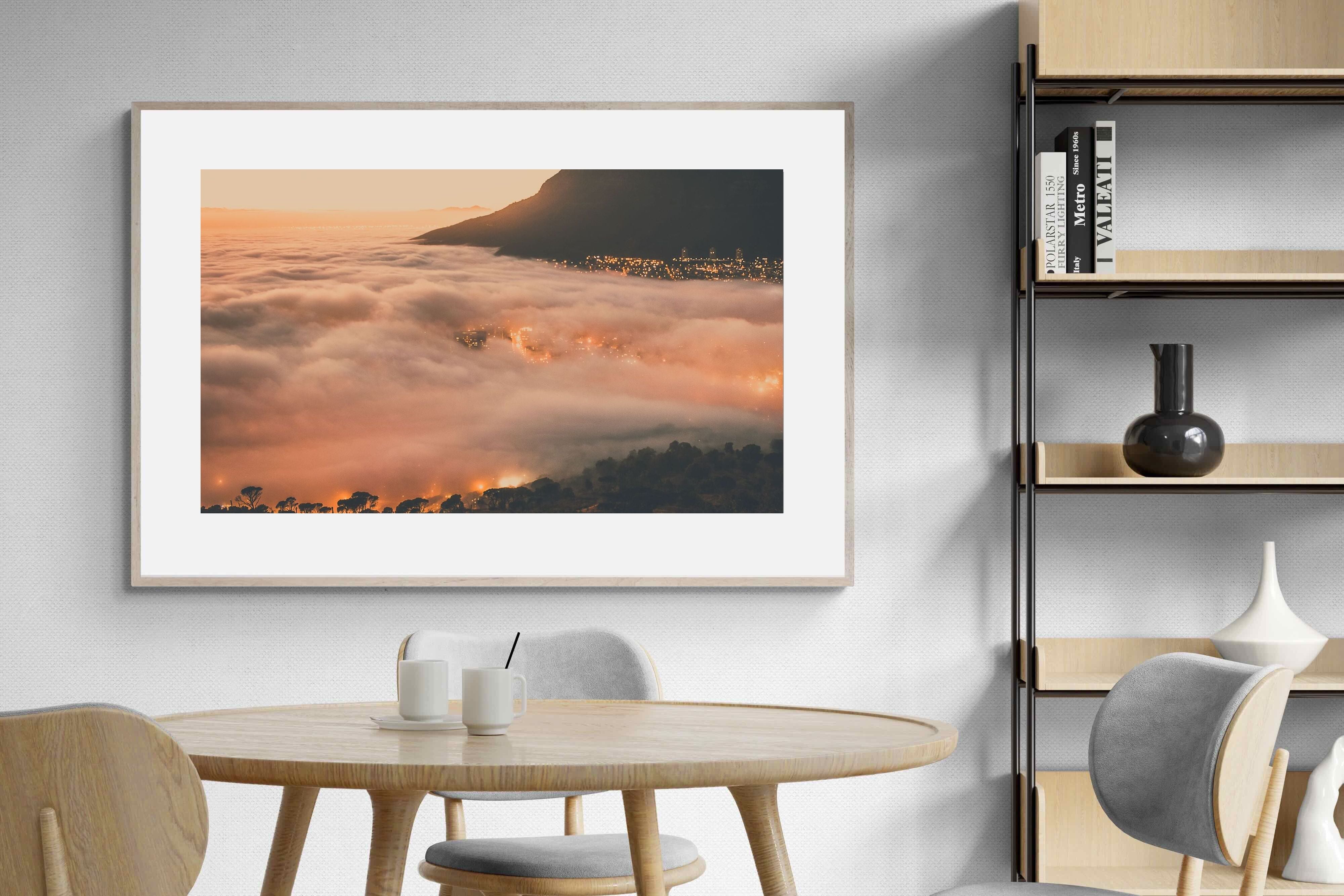 An extraordinary view of Cape Town blanketed by thick clouds with city lights glowing beneath creates a dreamlike urban scene. This photograph captures the mystery and allure of nature meeting city life. Best suited for modern apartments or creative workspaces, it adds ambience and a soft, cinematic touch. A moody, mesmerising piece that speaks of elevation—both in location and spirit.