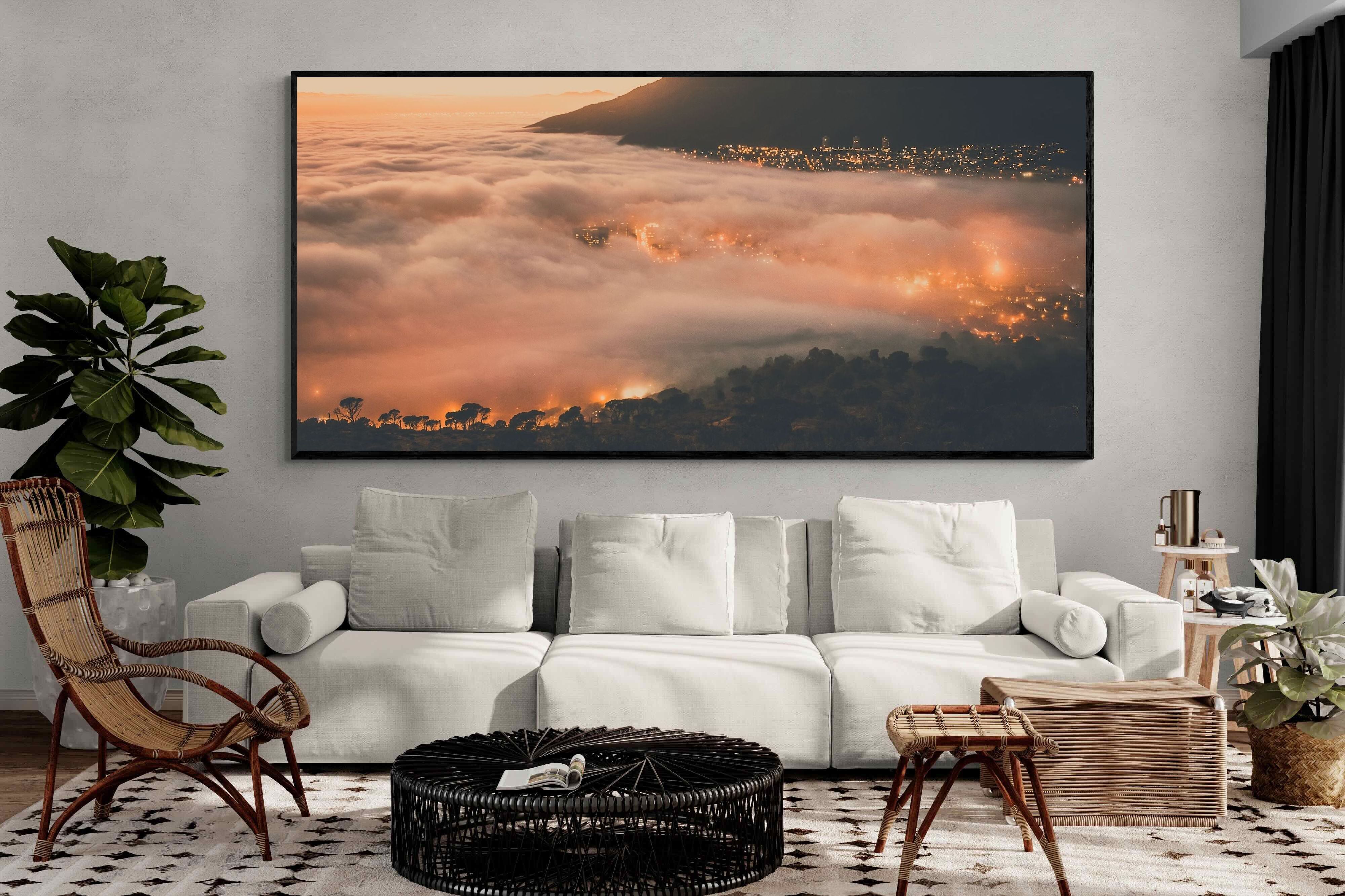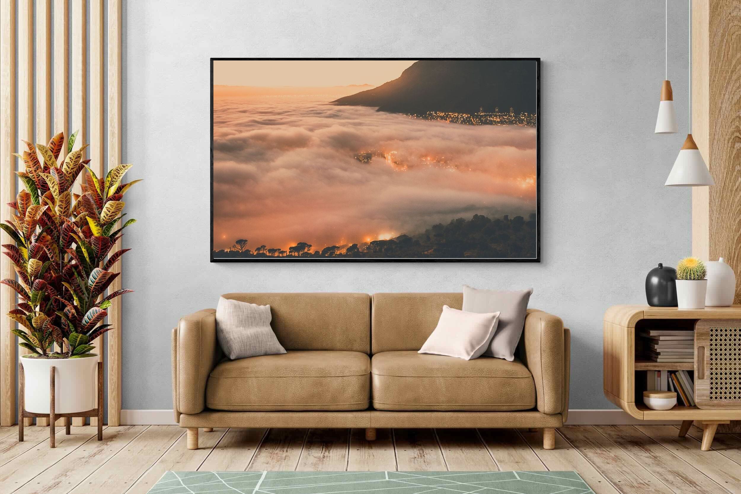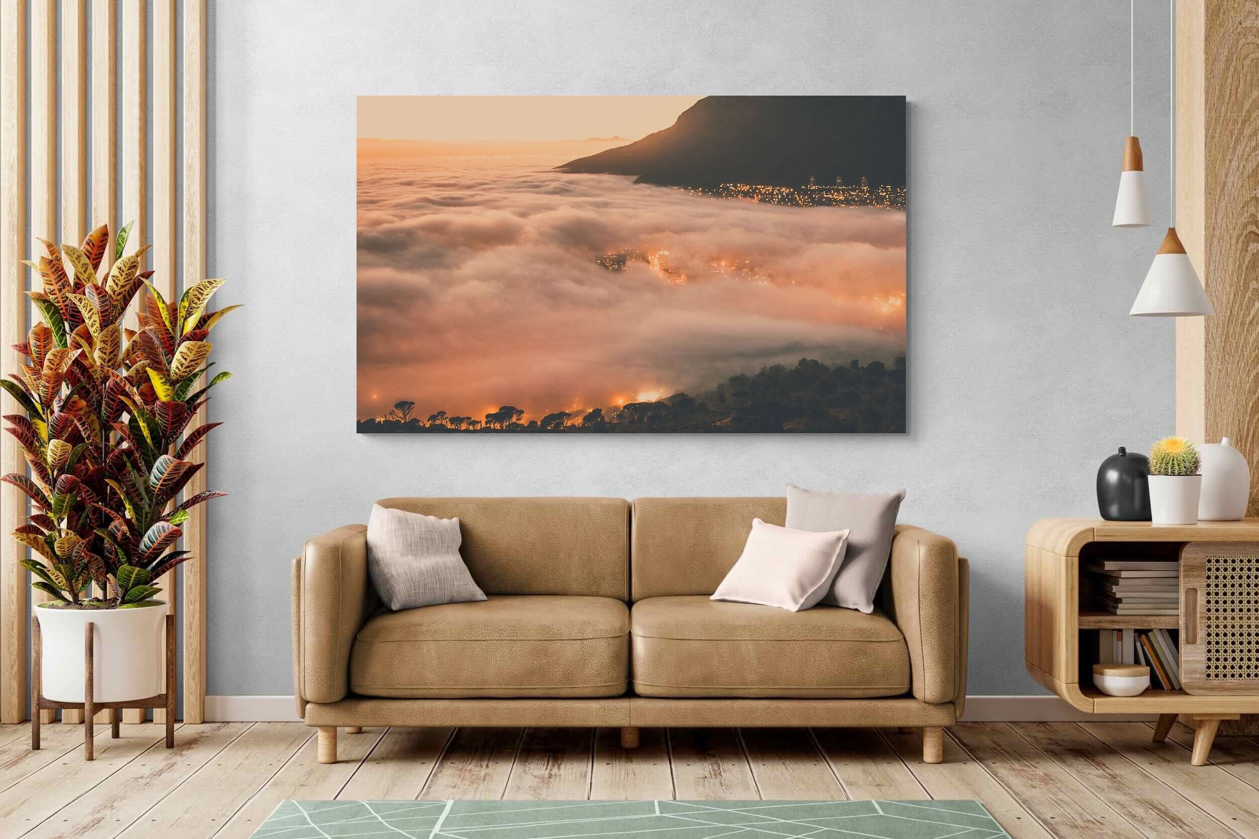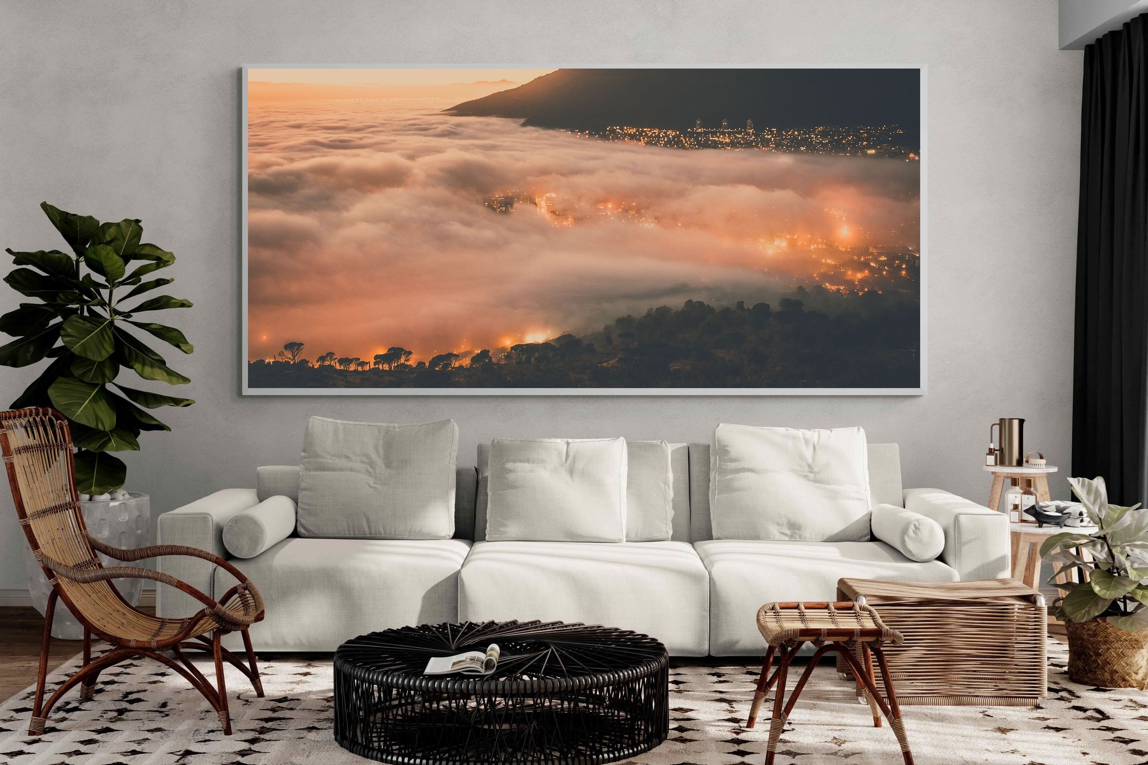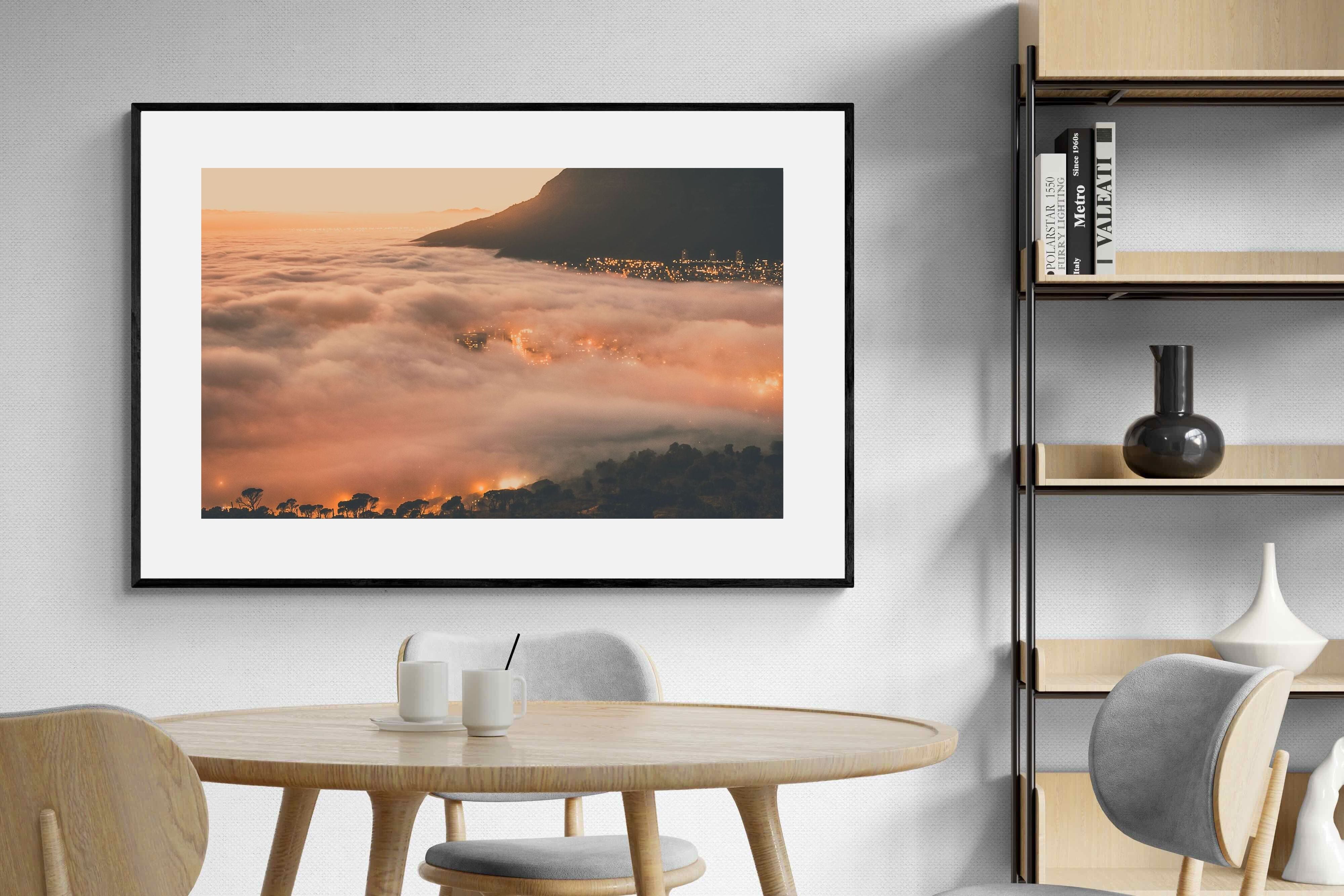 An extraordinary view of Cape Town blanketed by thick clouds with city lights glowing beneath creates a dreamlike urban scene. This photograph captures the mystery and allure of nature meeting city life. Best suited for modern apartments or creative workspaces, it adds ambience and a soft, cinematic touch. A moody, mesmerising piece that speaks of elevation—both in location and spirit.