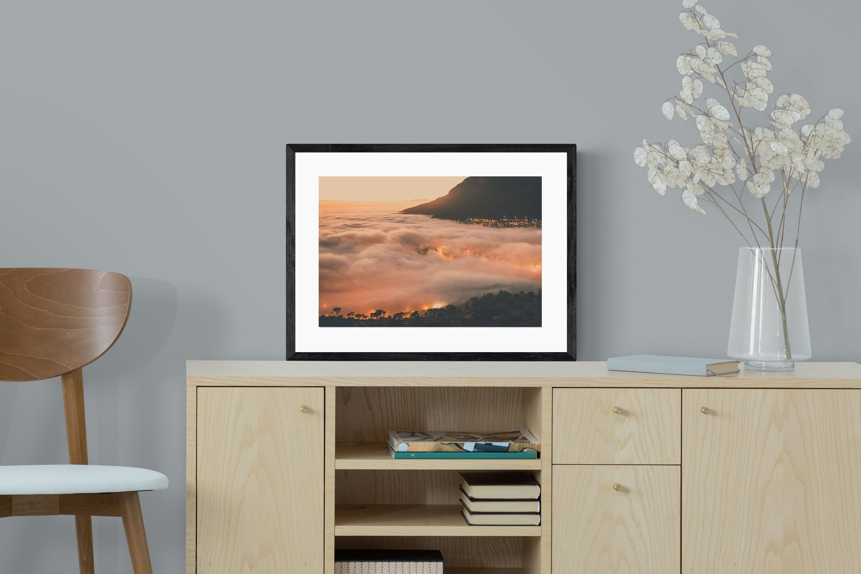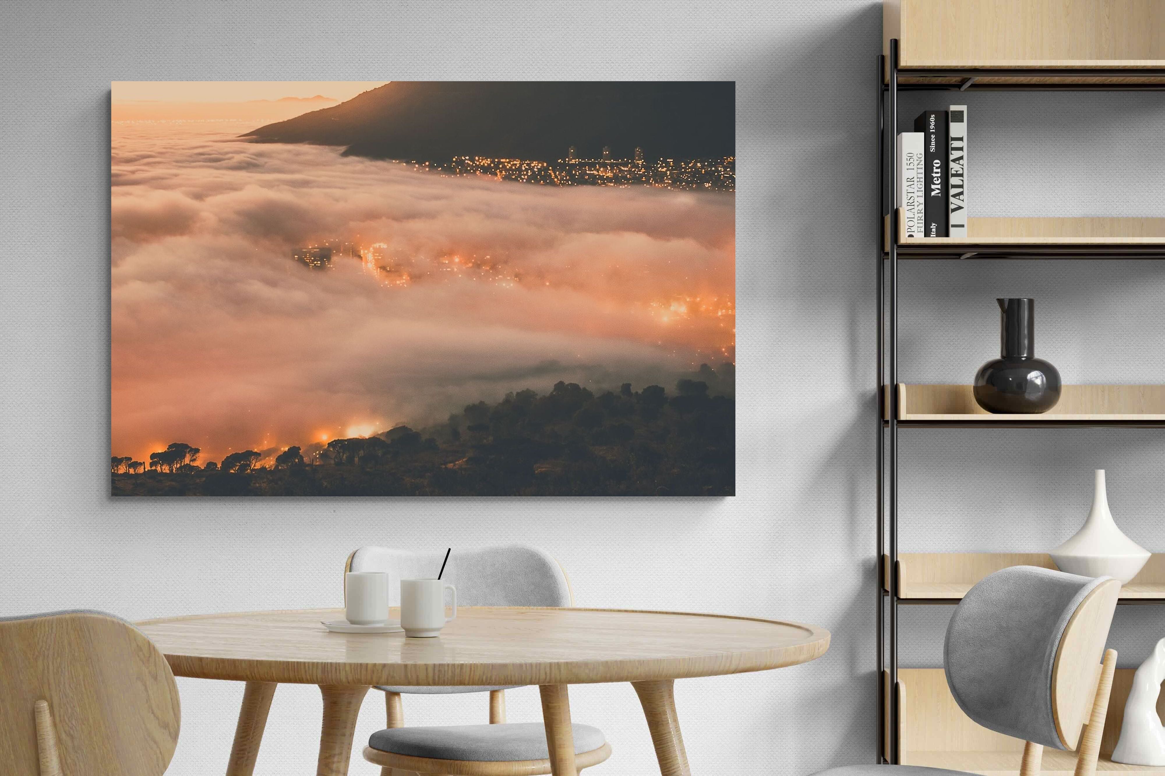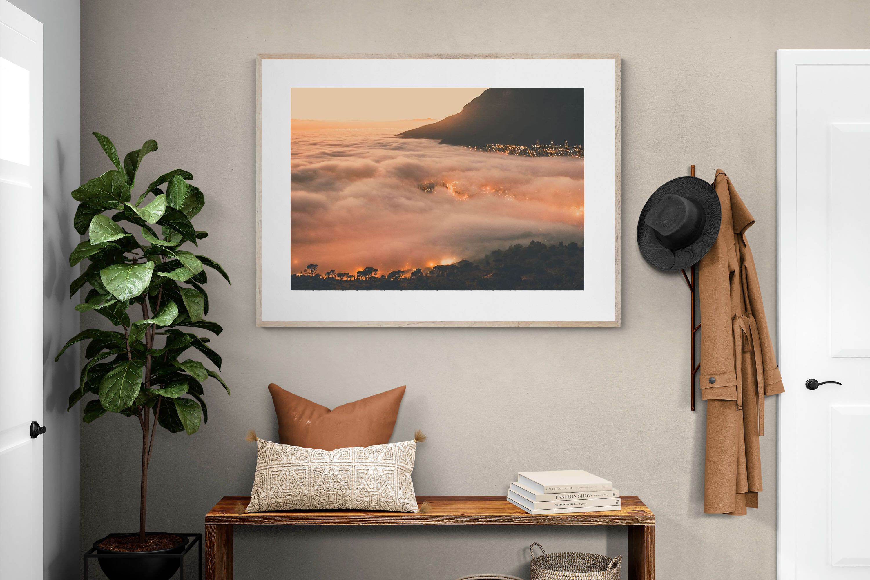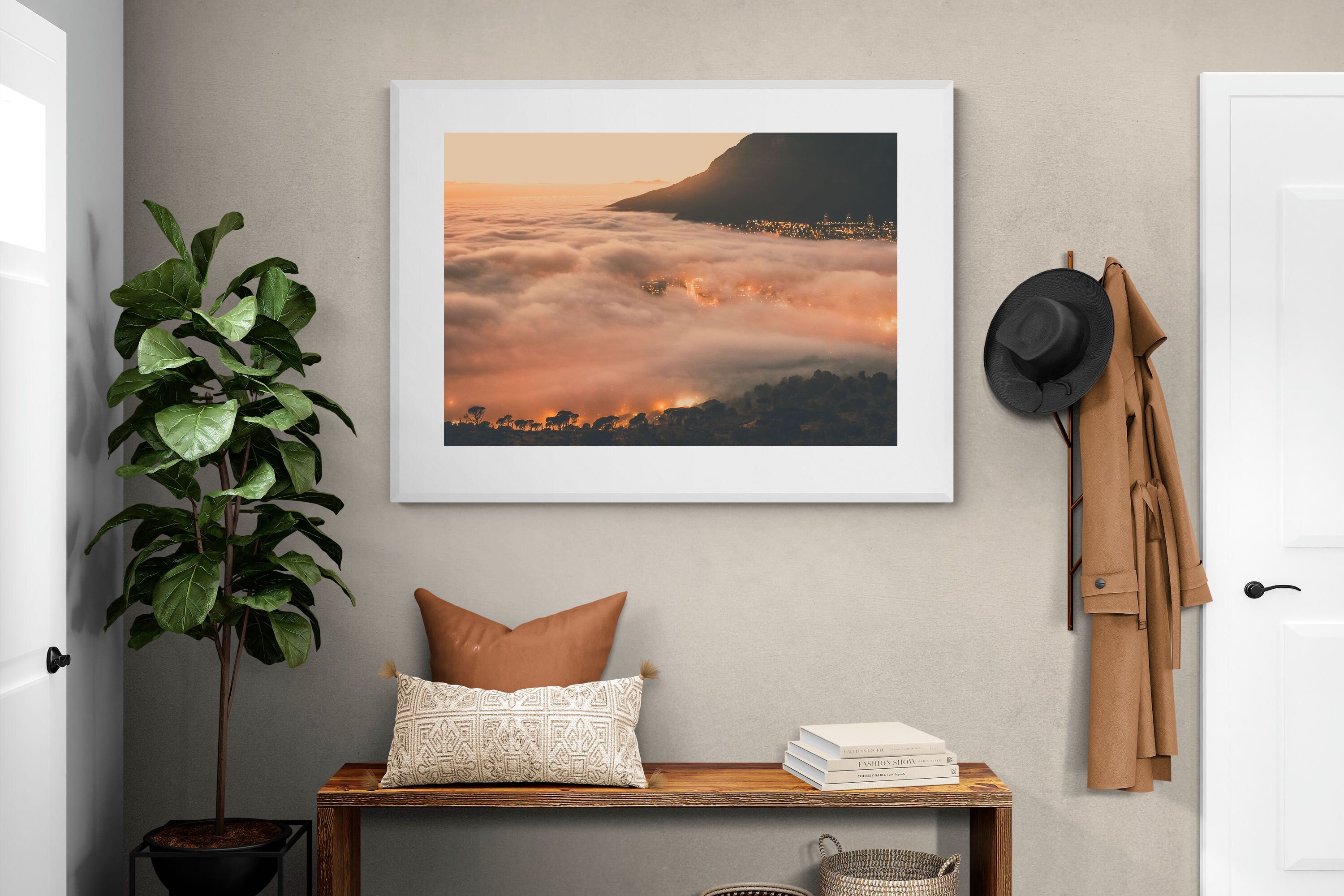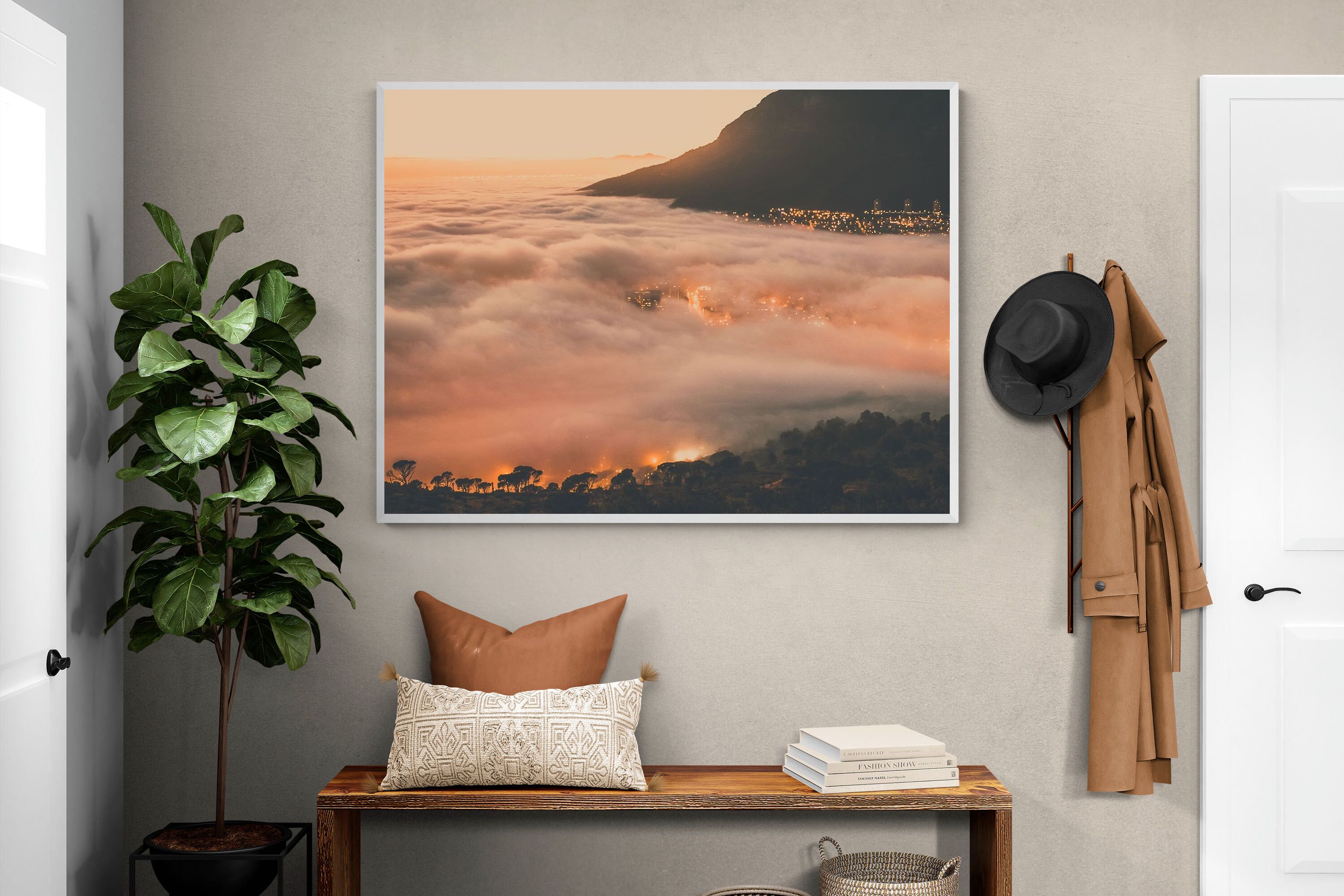 An extraordinary view of Cape Town blanketed by thick clouds with city lights glowing beneath creates a dreamlike urban scene. This photograph captures the mystery and allure of nature meeting city life. Best suited for modern apartments or creative workspaces, it adds ambience and a soft, cinematic touch. A moody, mesmerising piece that speaks of elevation—both in location and spirit.