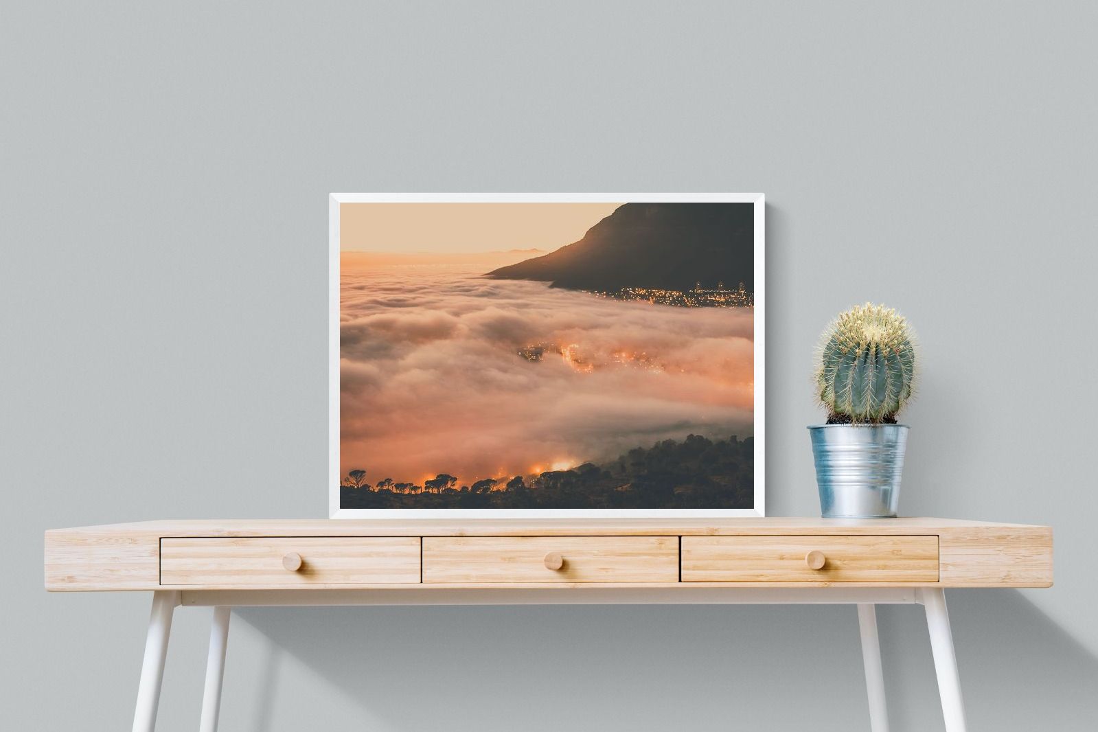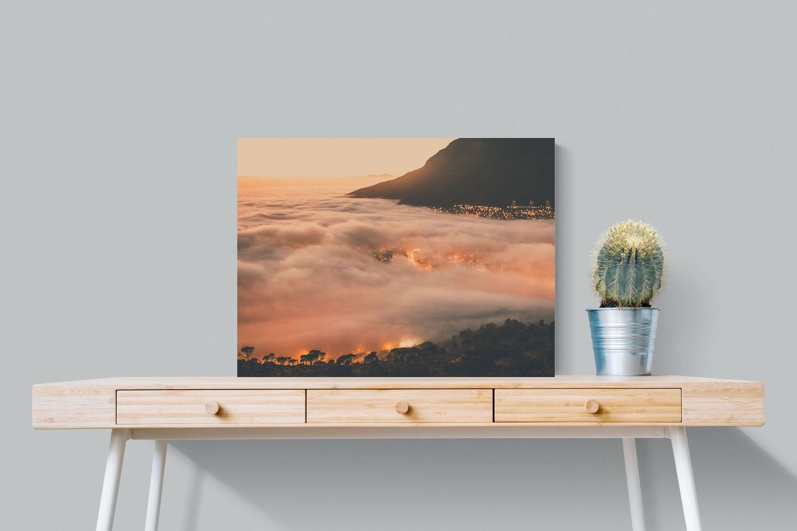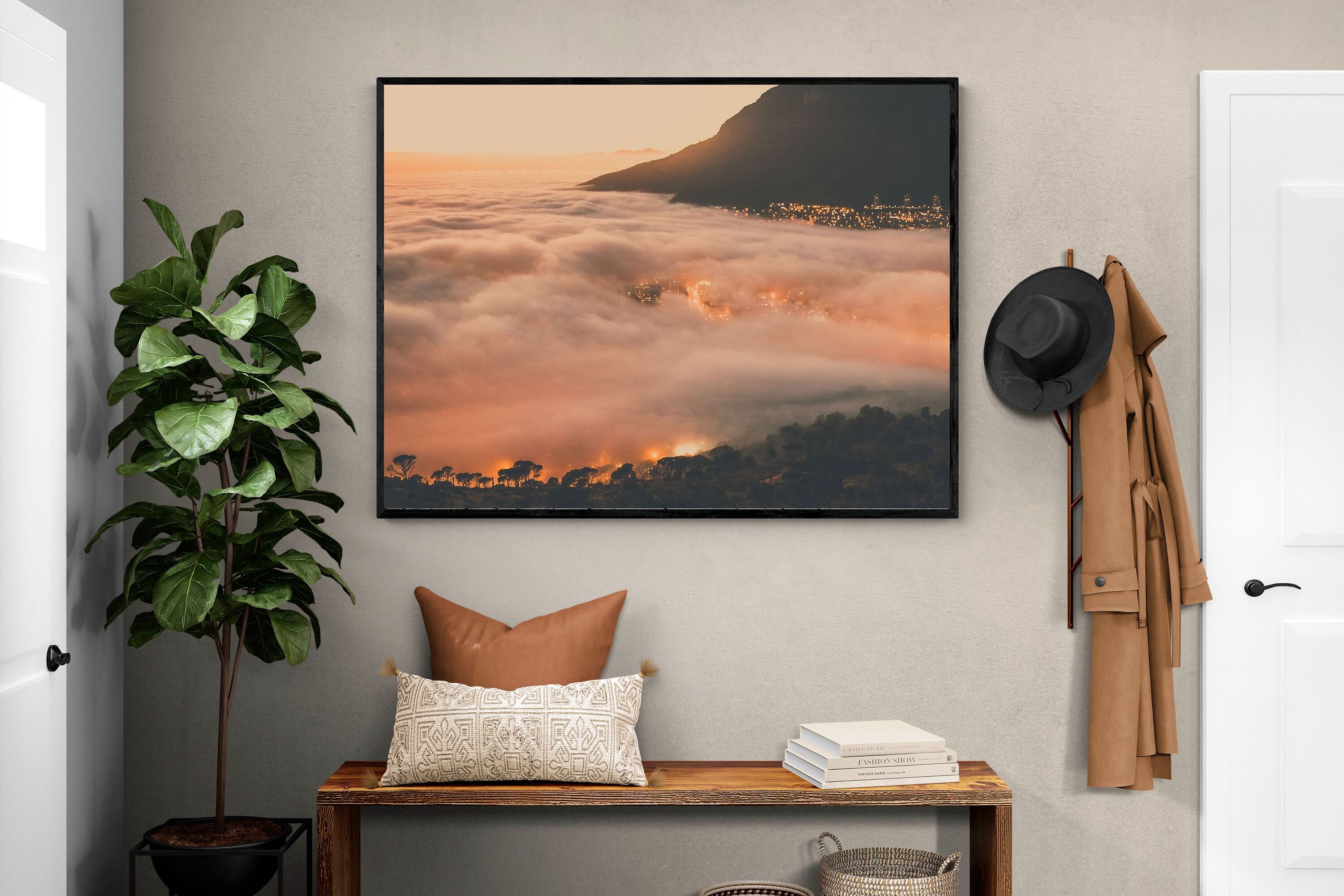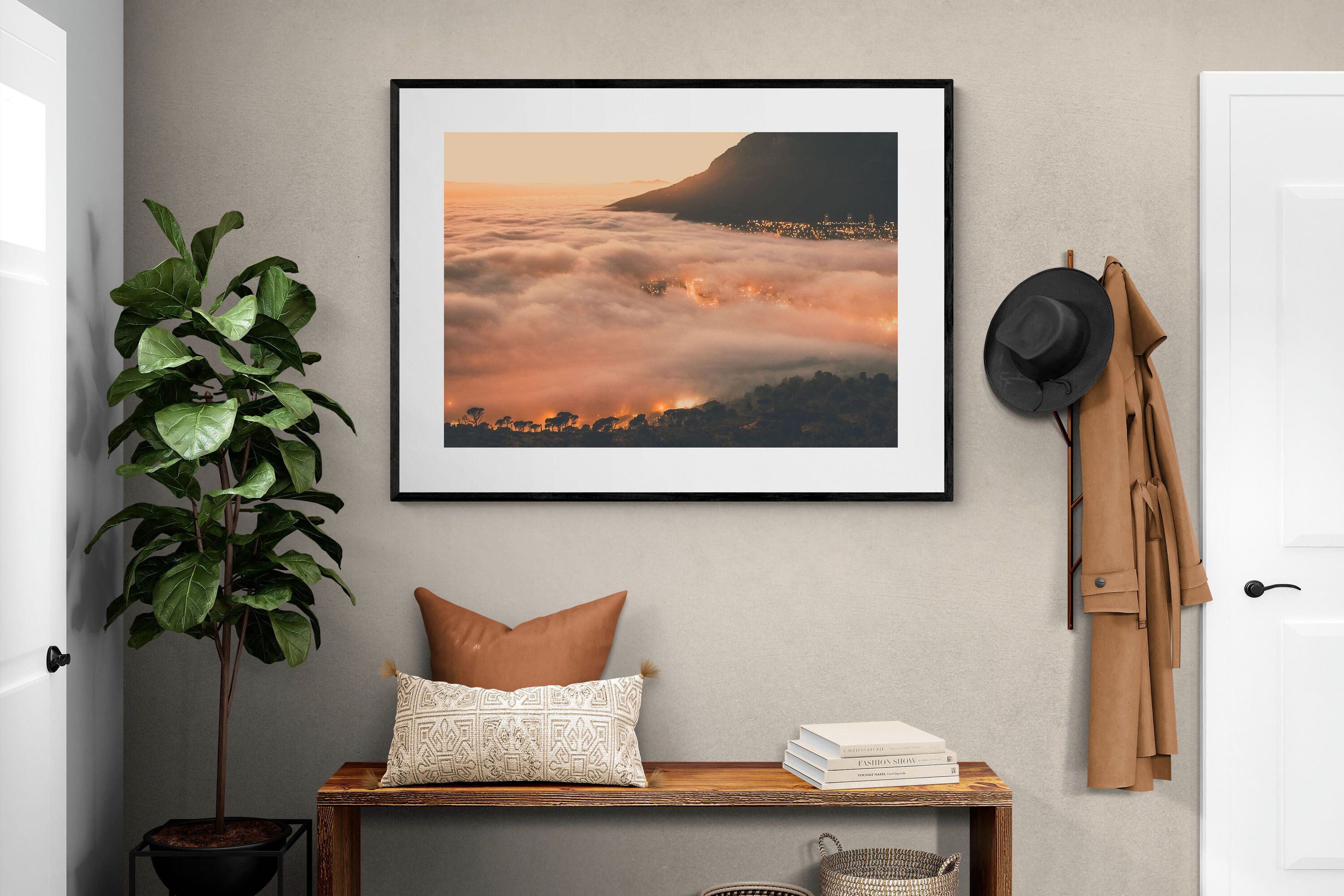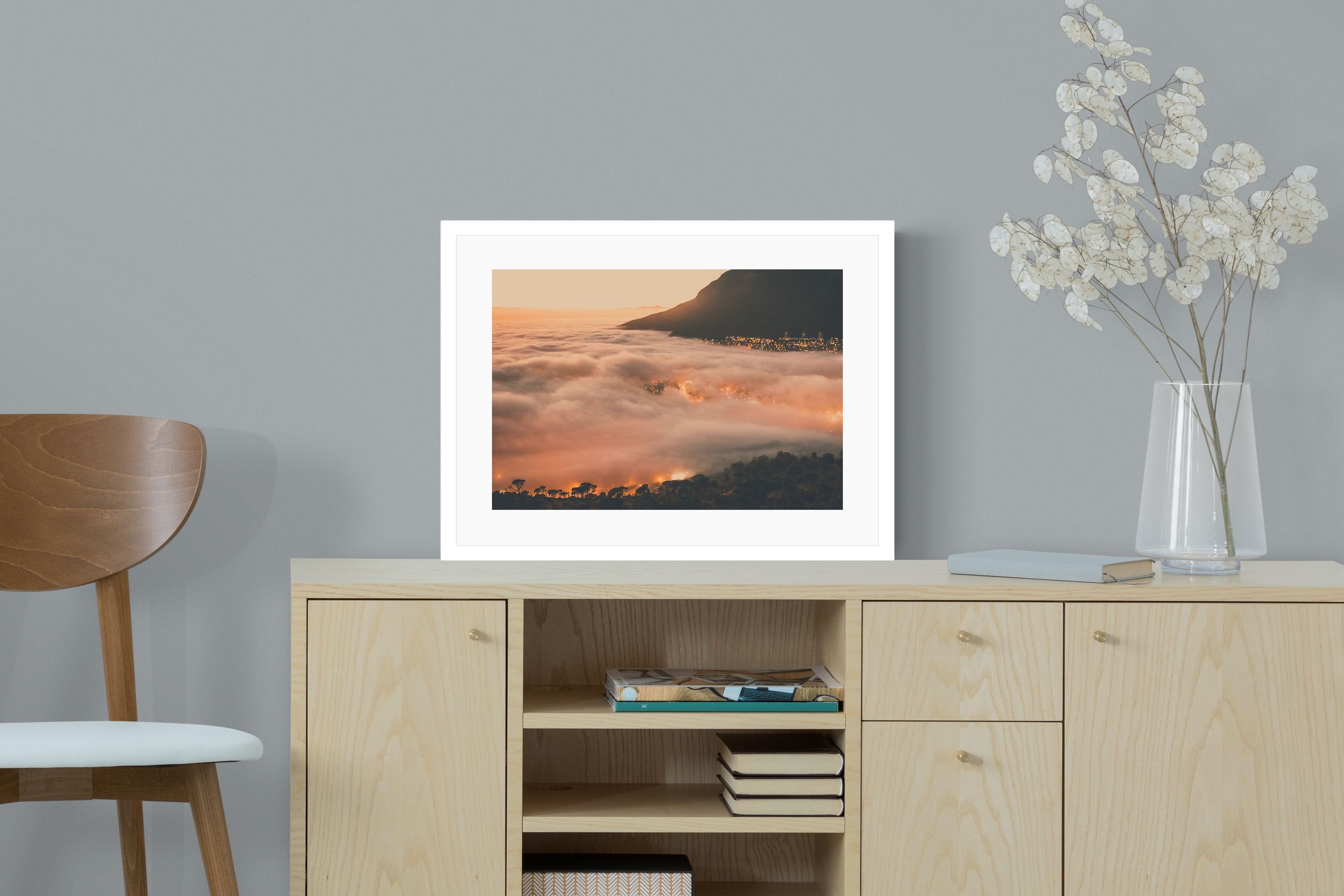 An extraordinary view of Cape Town blanketed by thick clouds with city lights glowing beneath creates a dreamlike urban scene. This photograph captures the mystery and allure of nature meeting city life. Best suited for modern apartments or creative workspaces, it adds ambience and a soft, cinematic touch. A moody, mesmerising piece that speaks of elevation—both in location and spirit.