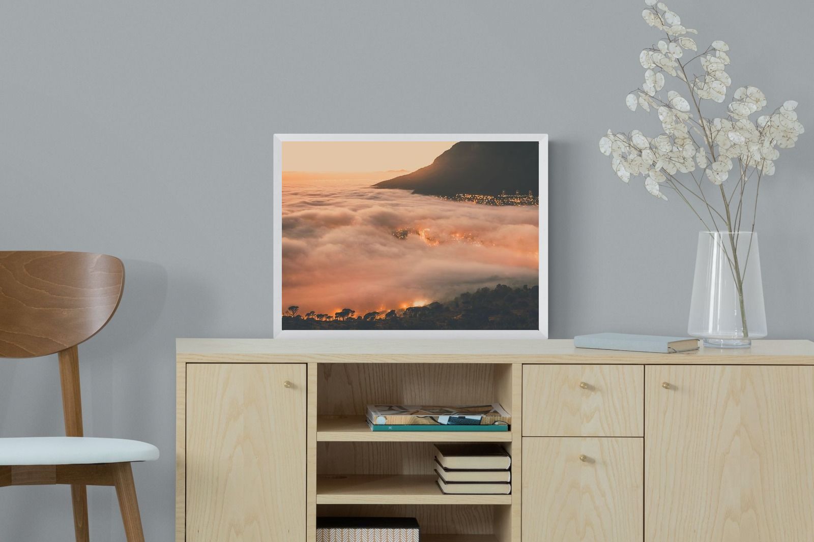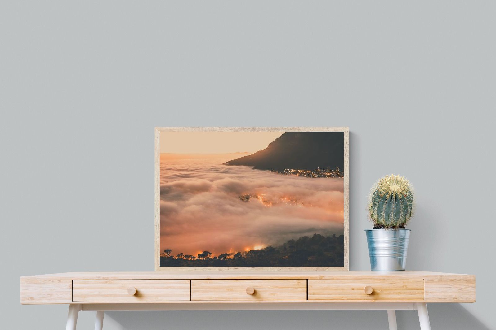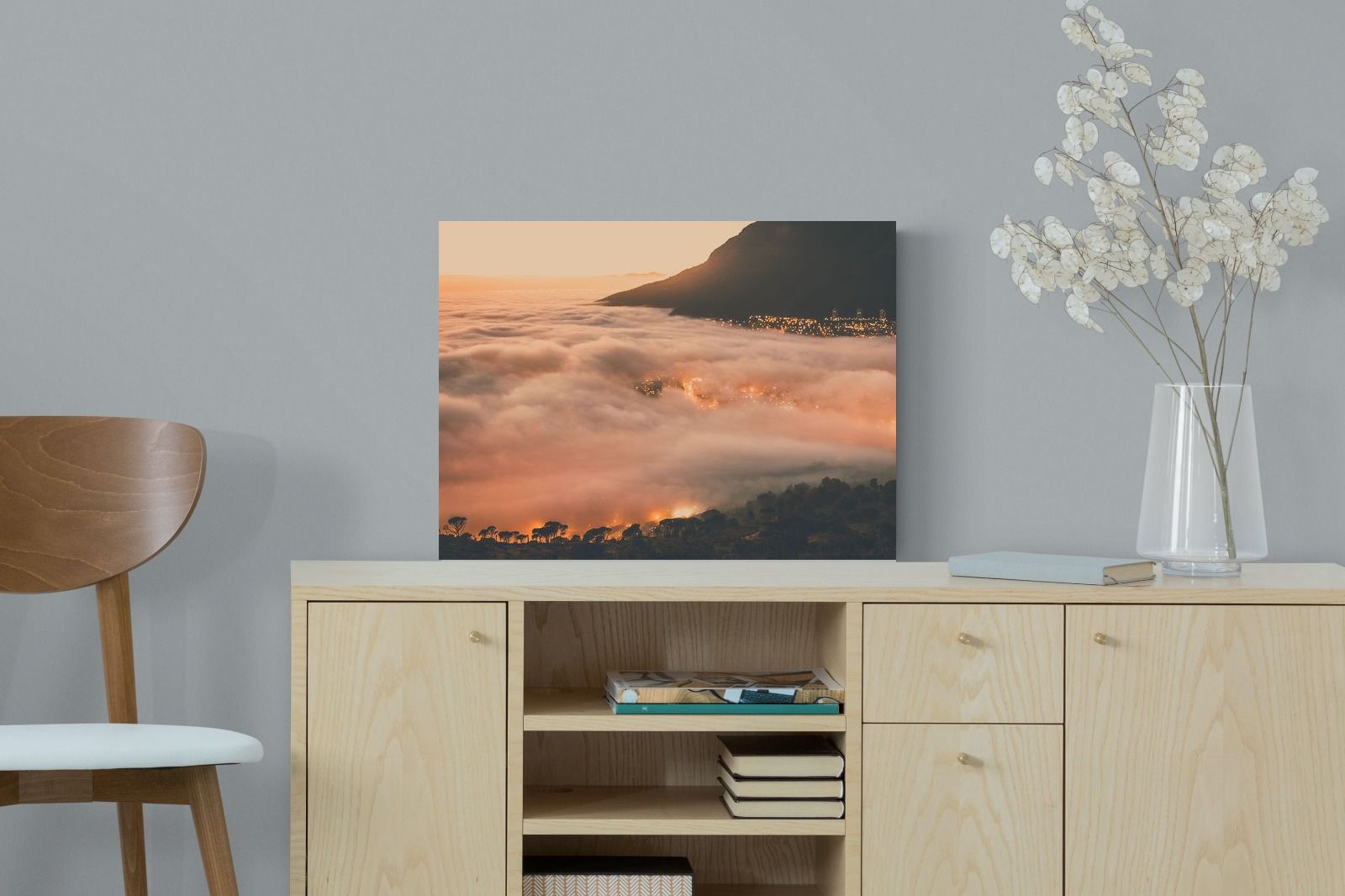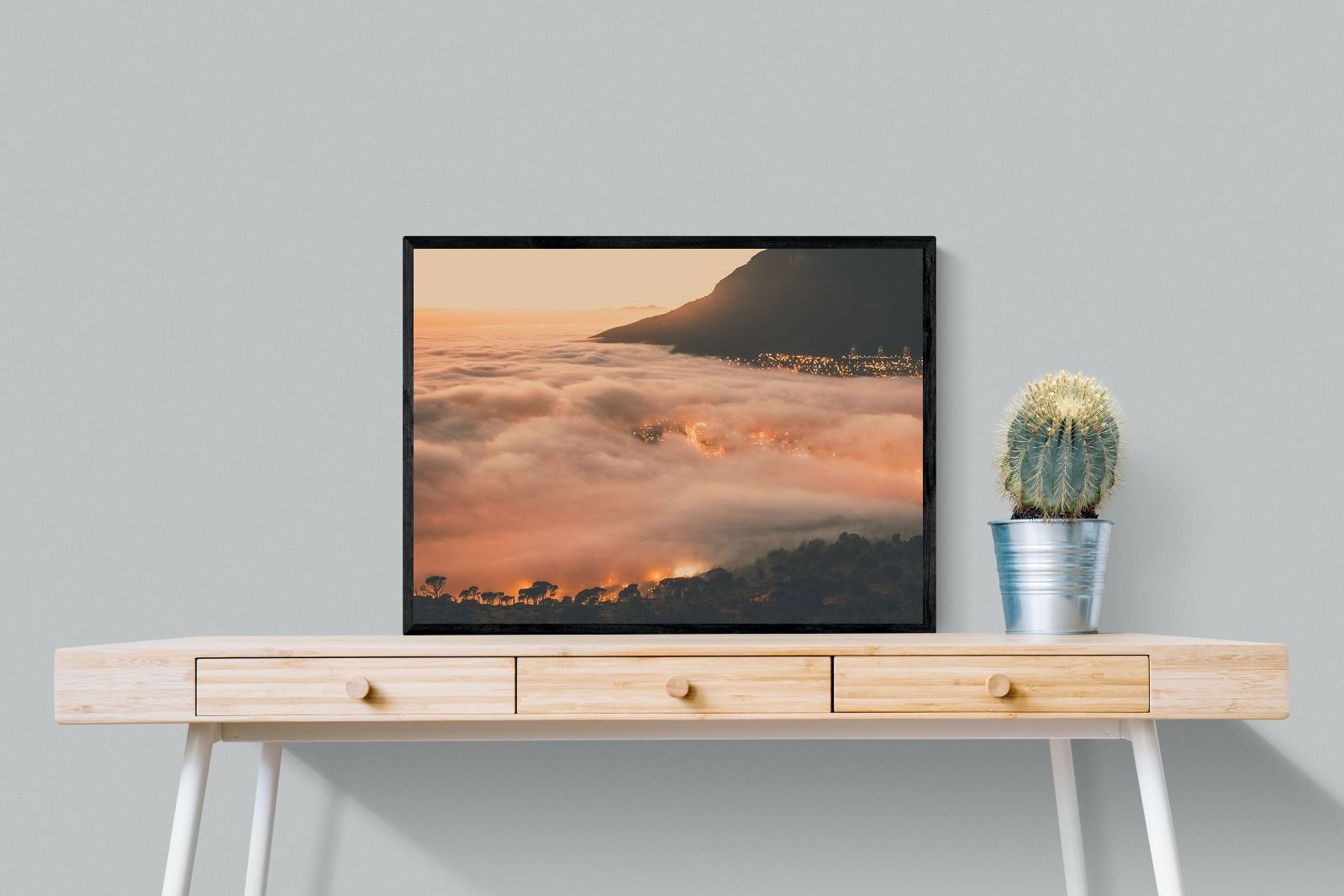An extraordinary view of Cape Town blanketed by thick clouds with city lights glowing beneath creates a dreamlike urban scene. This photograph captures the mystery and allure of nature meeting city life. Best suited for modern apartments or creative workspaces, it adds ambience and a soft, cinematic touch. A moody, mesmerising piece that speaks of elevation—both in location and spirit.