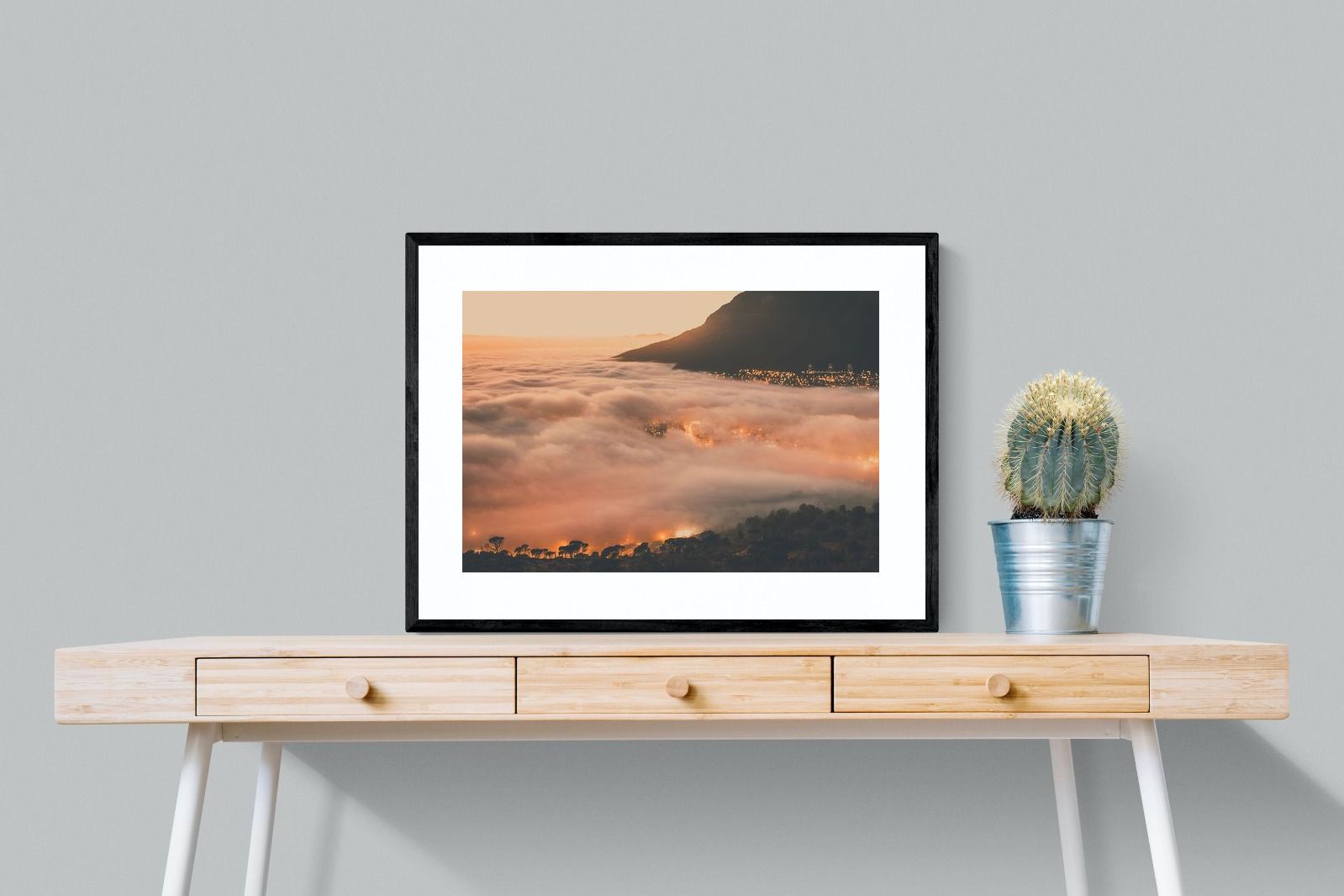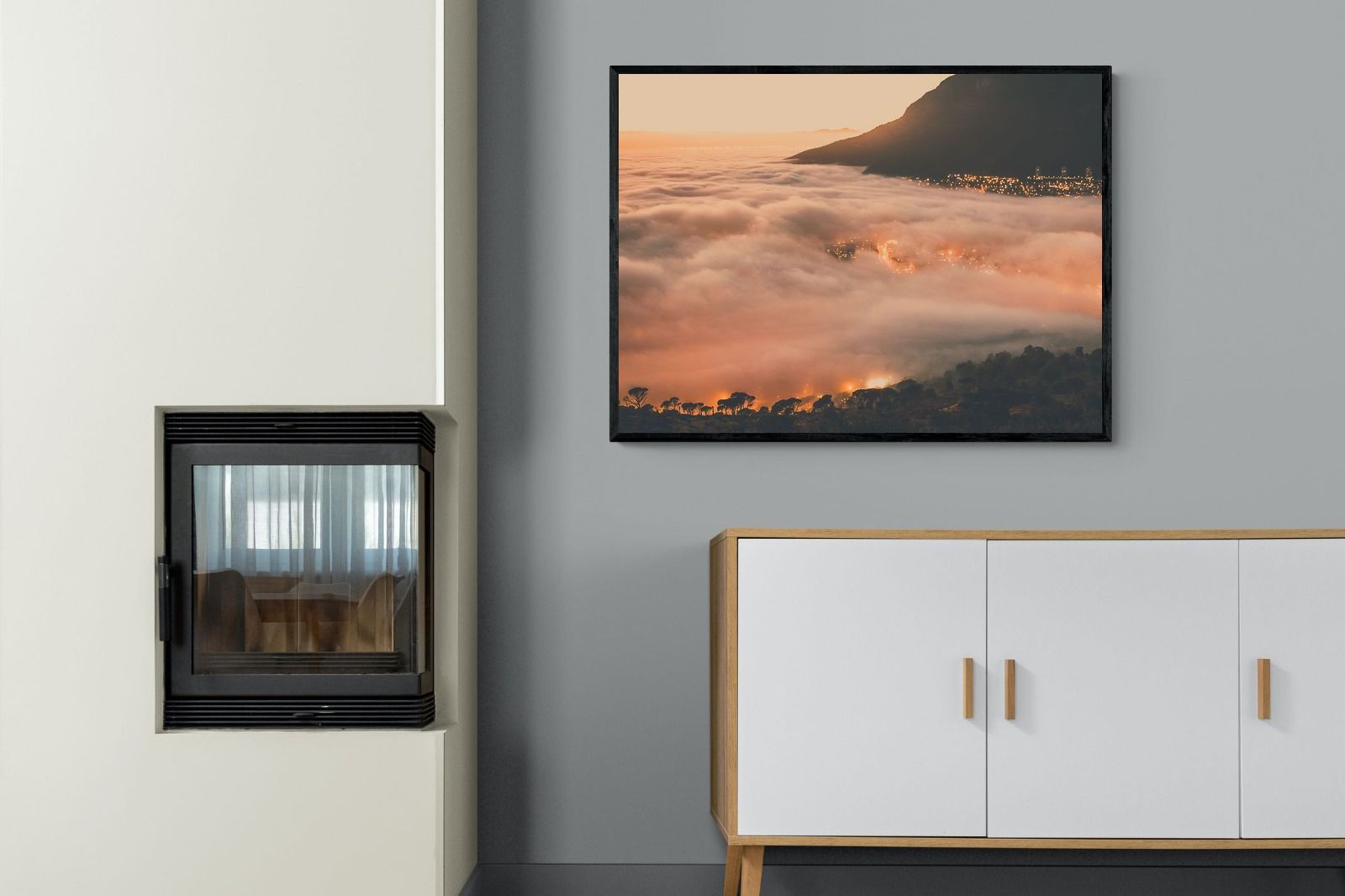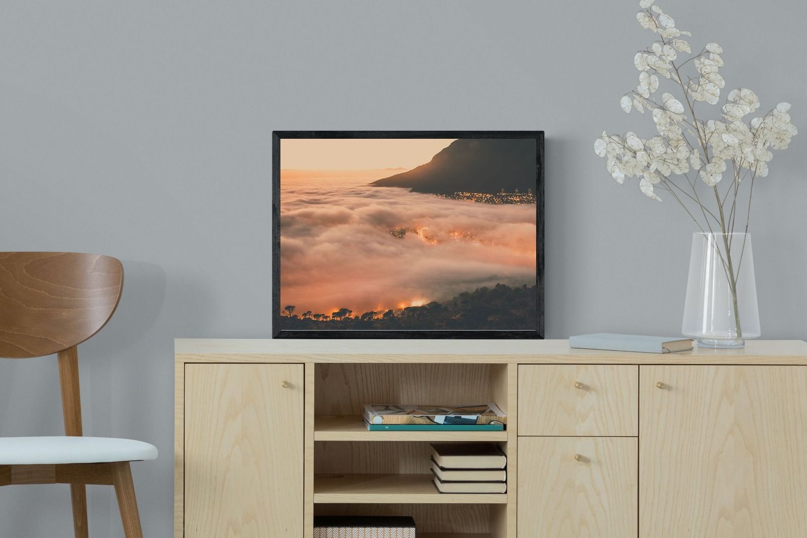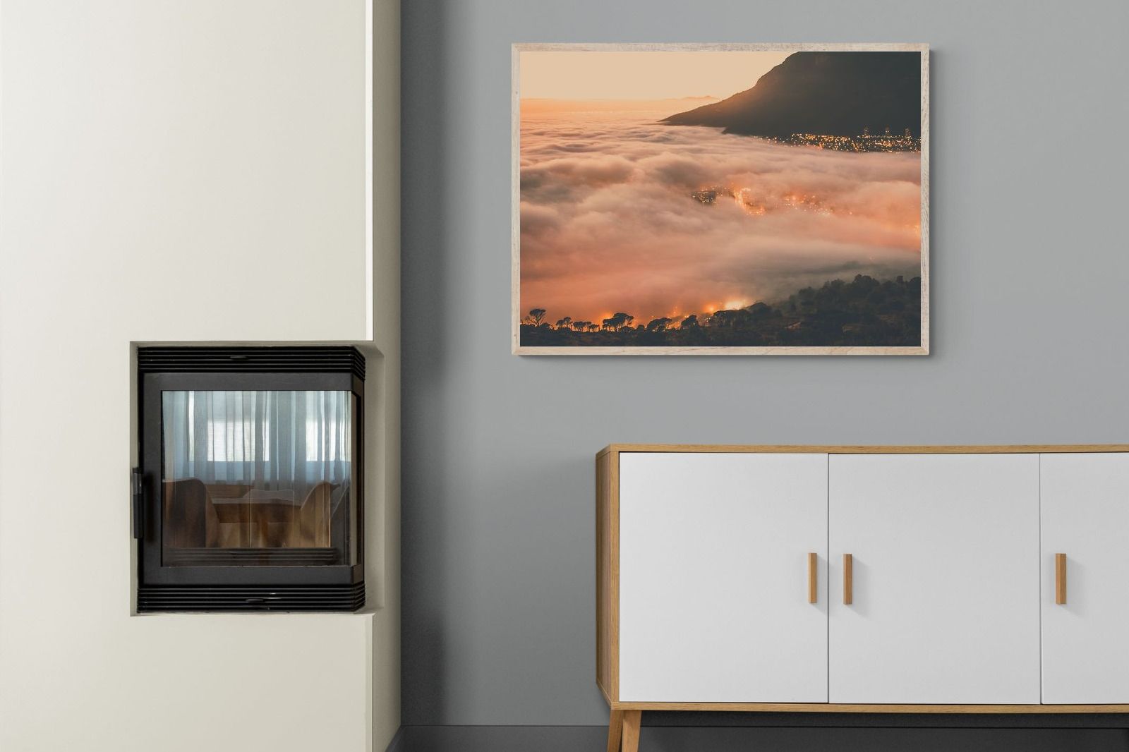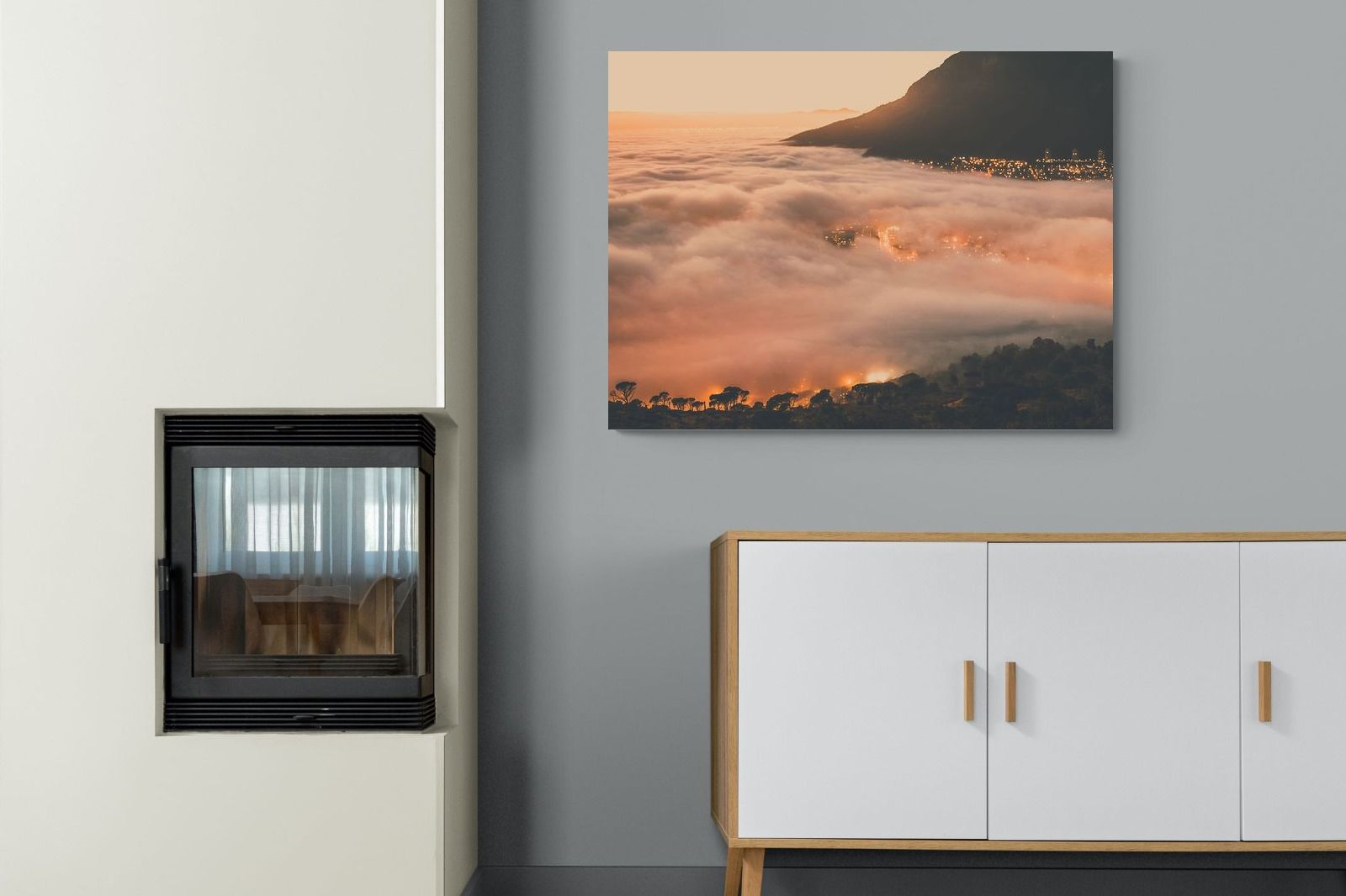 An extraordinary view of Cape Town blanketed by thick clouds with city lights glowing beneath creates a dreamlike urban scene. This photograph captures the mystery and allure of nature meeting city life. Best suited for modern apartments or creative workspaces, it adds ambience and a soft, cinematic touch. A moody, mesmerising piece that speaks of elevation—both in location and spirit.