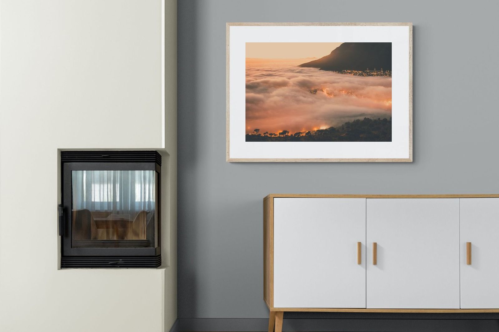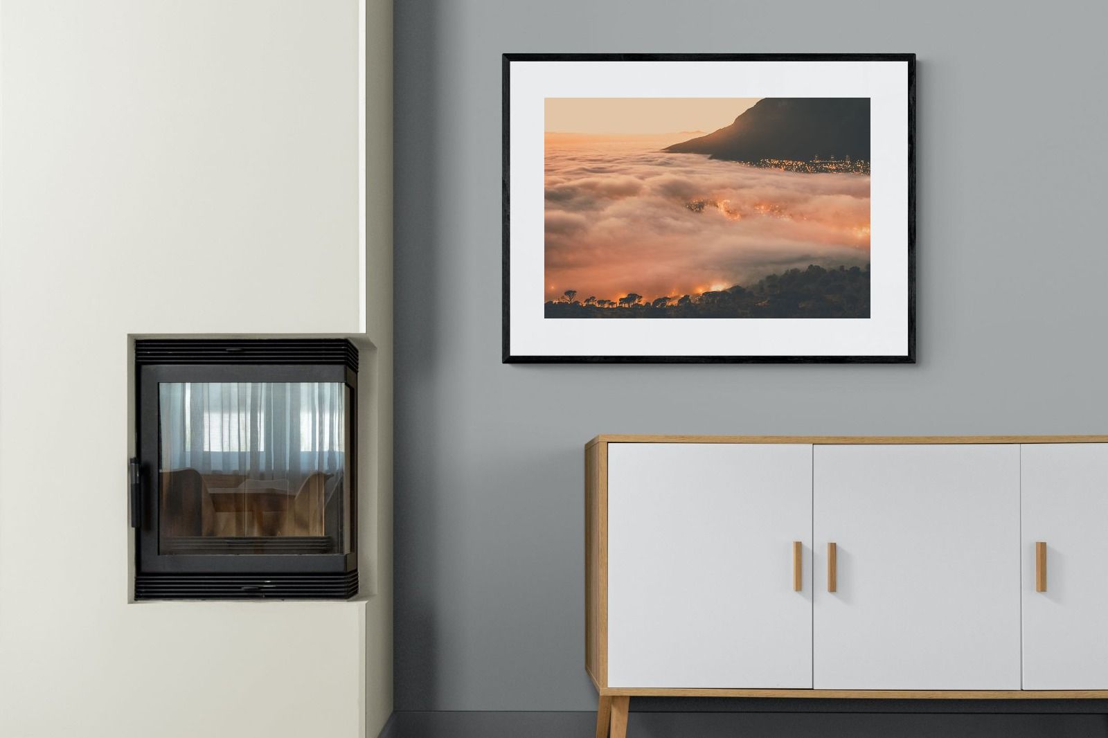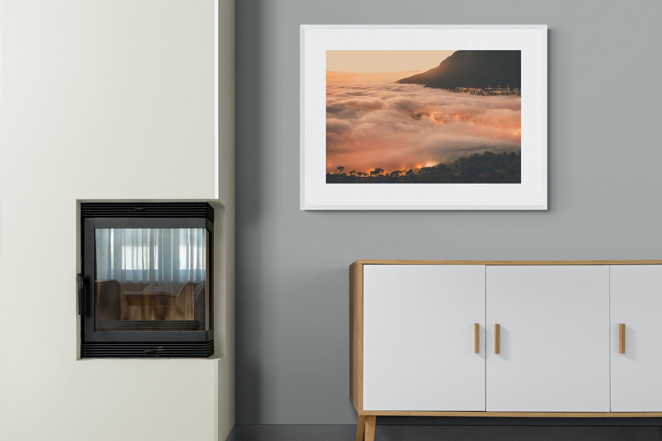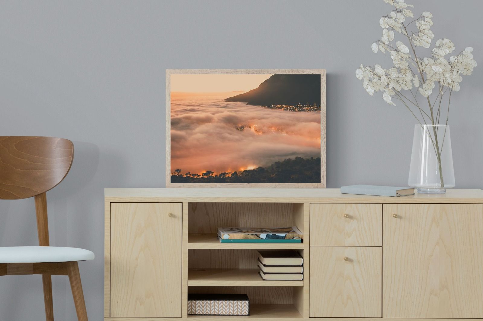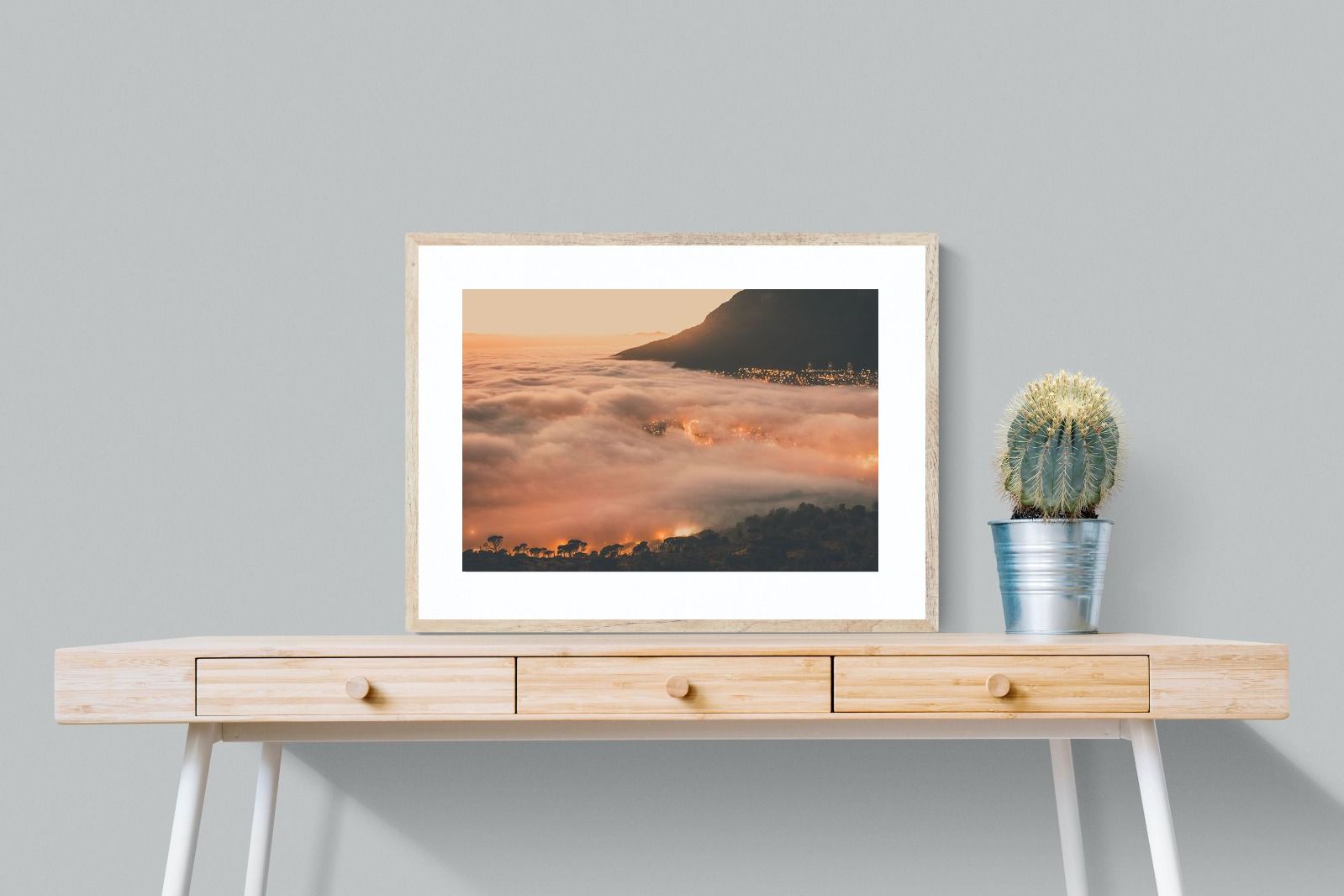 An extraordinary view of Cape Town blanketed by thick clouds with city lights glowing beneath creates a dreamlike urban scene. This photograph captures the mystery and allure of nature meeting city life. Best suited for modern apartments or creative workspaces, it adds ambience and a soft, cinematic touch. A moody, mesmerising piece that speaks of elevation—both in location and spirit.