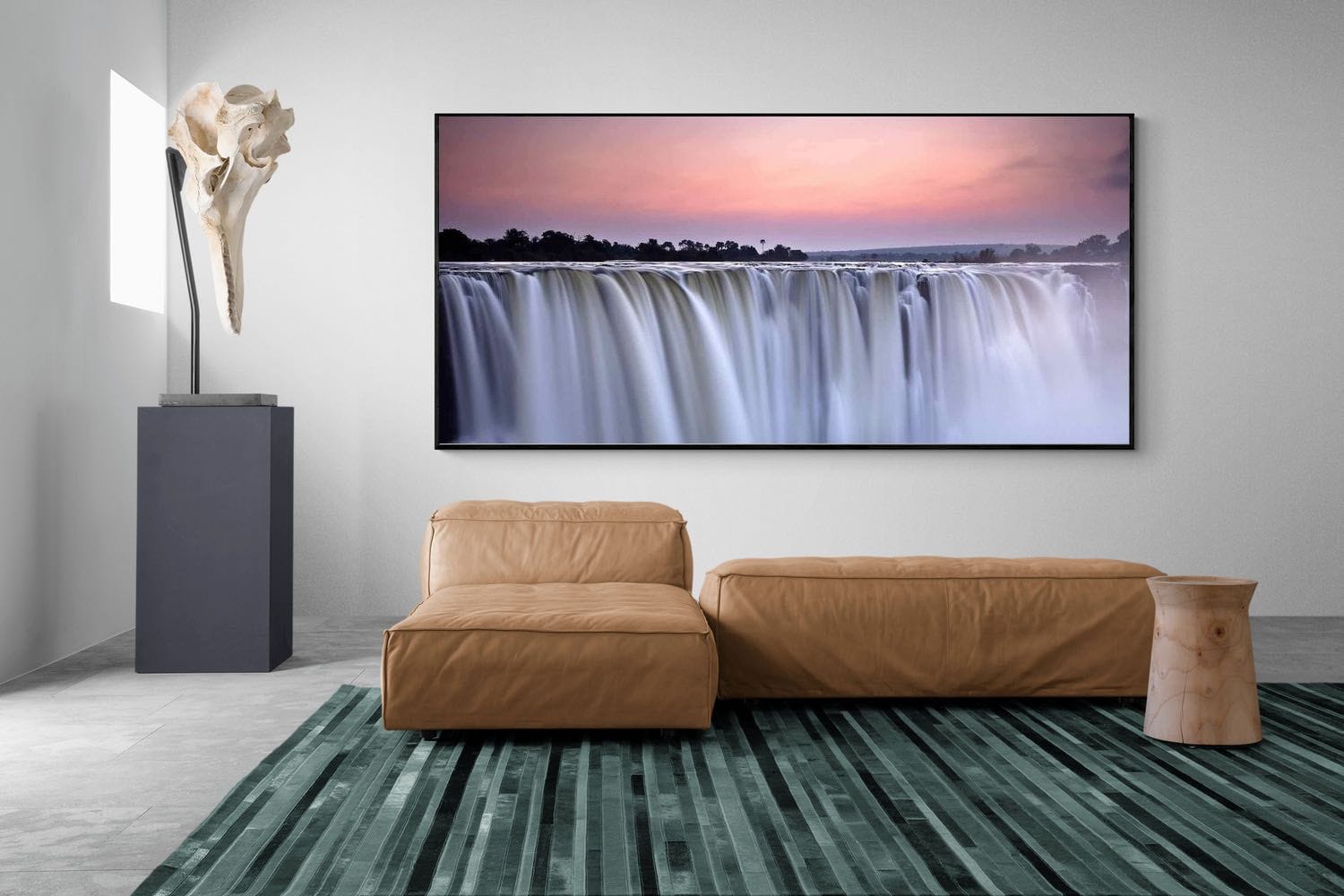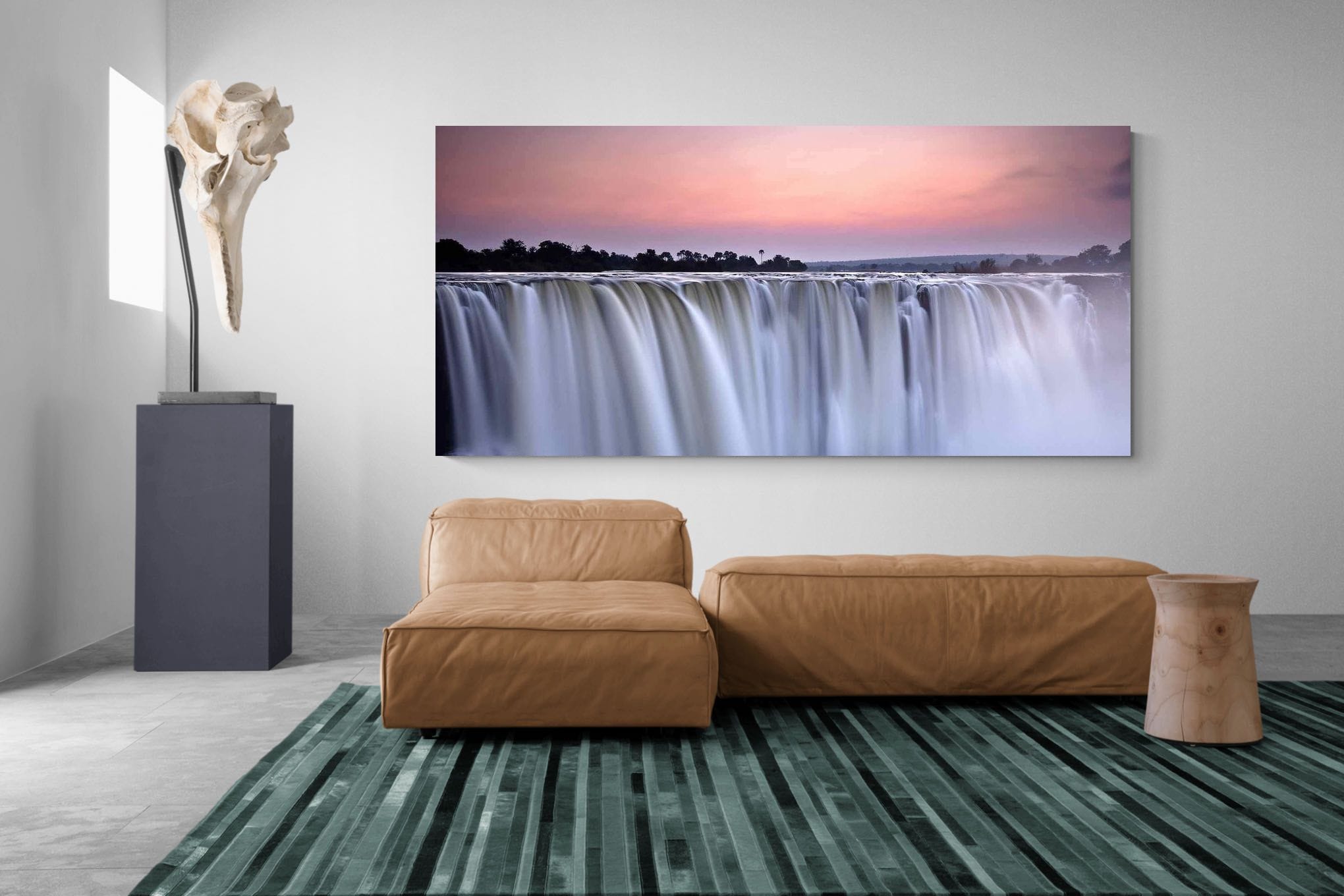 A powerful yet serene depiction of cascading water flowing over the edge of Victoria Falls at dusk. Soft pastel skies contrast with the silky motion of the falls, creating a sense of scale and tranquillity. This artwork brings a refined natural statement to interiors, ideal for living spaces or offices seeking a calming focal point inspired by one of Africa’s most iconic landscapes.