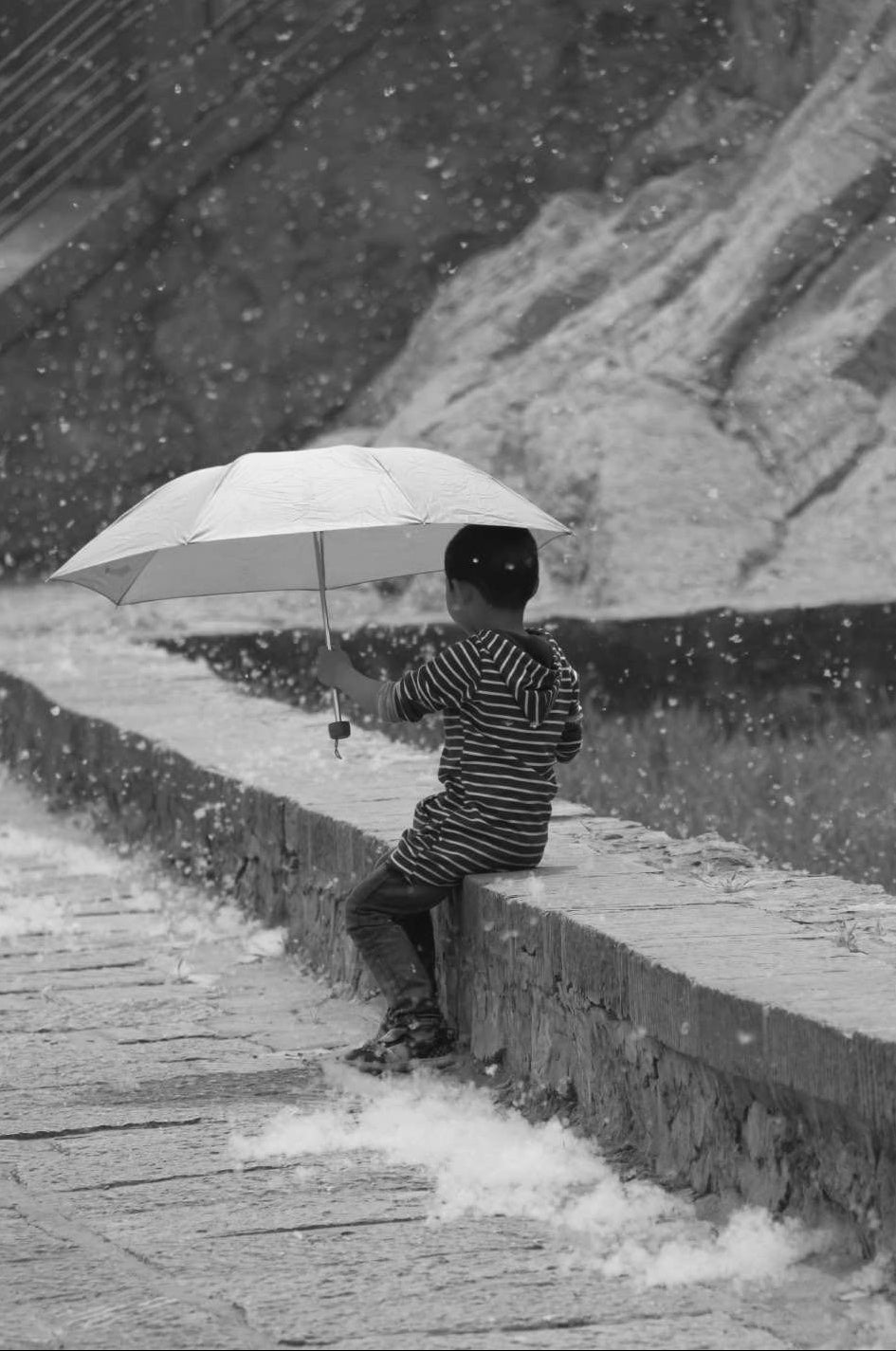 A solitary child sits beneath an umbrella as rain falls around him, captured in a striking black and white composition. The image balances vulnerability and calm, with texture and movement created through falling droplets and reflective surfaces. Ideal for contemporary interiors, it suits living rooms, bedrooms or hallways. This piece offers emotional depth and quiet storytelling, adding a thoughtful and atmospheric focal point to a refined space.