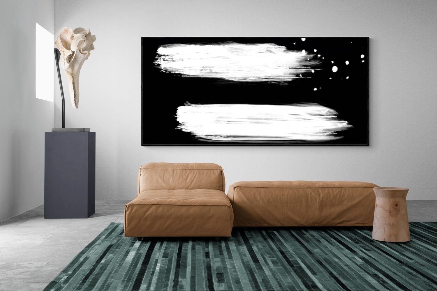 This minimalist abstract artwork features a bold horizontal white brushstroke set against a deep black background, accented with subtle splatter details. The raw texture and directional movement give the piece energy while maintaining a clean, modern aesthetic. Ideal for contemporary, industrial or monochrome interiors, it works well as a standalone statement or within a curated gallery wall, adding graphic impact without overwhelming a space.