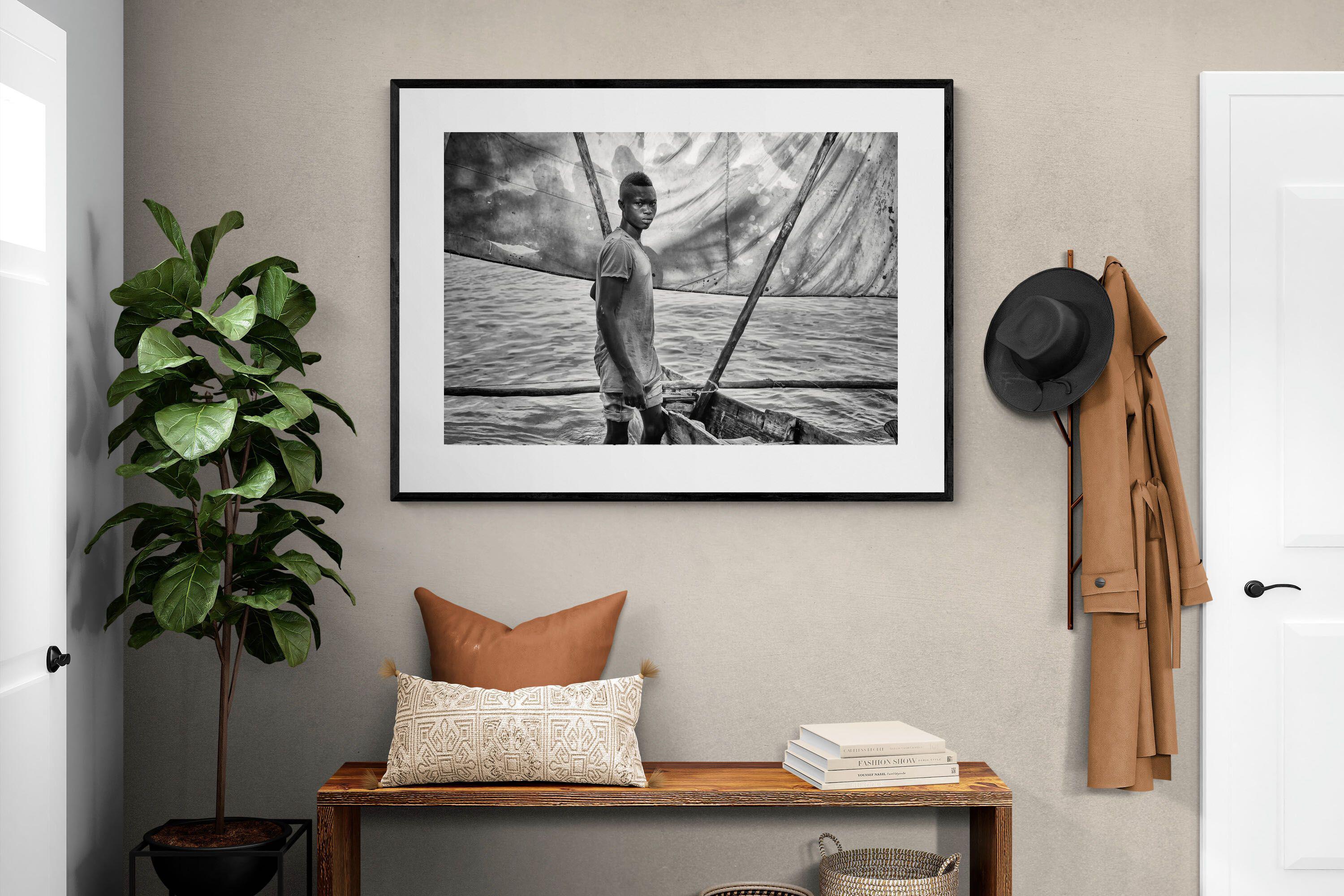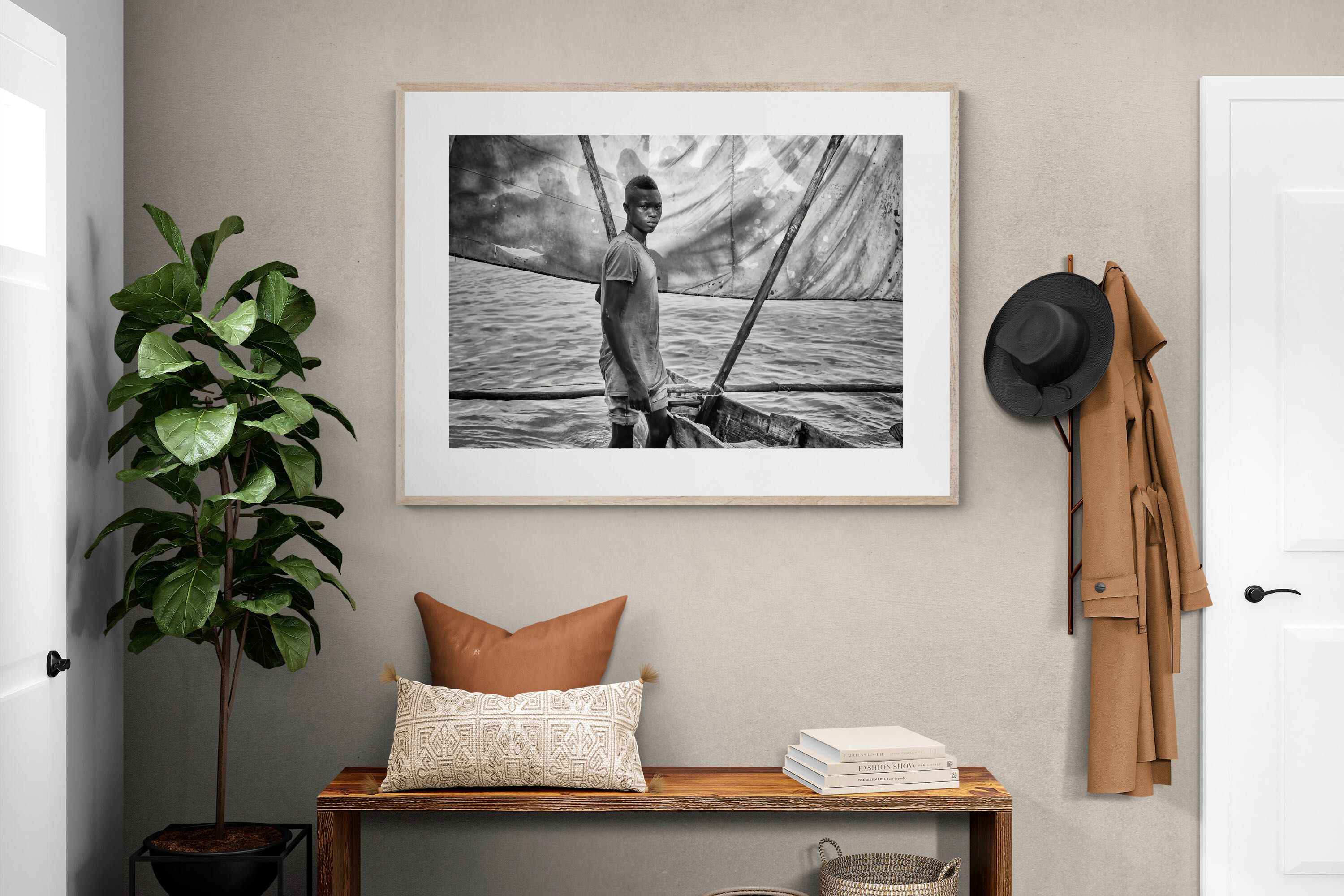 "Fisherboy" captures a poignant moment in the life of a young teenage boy in Zanzibar, ready to embark on another day's fishing. Standing next to his dhow, wearing well-worn clothes, his gaze is filled with determination and hope, highlighting the reality of his daily struggle to earn money to support his family.