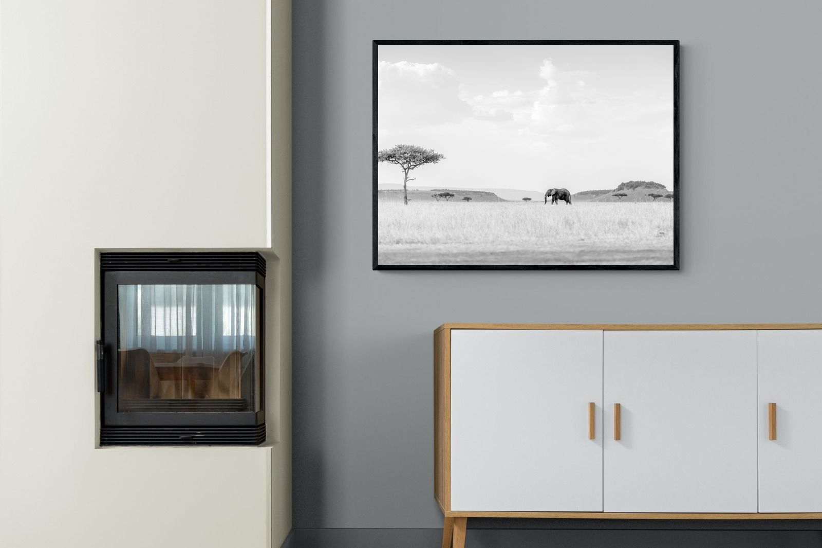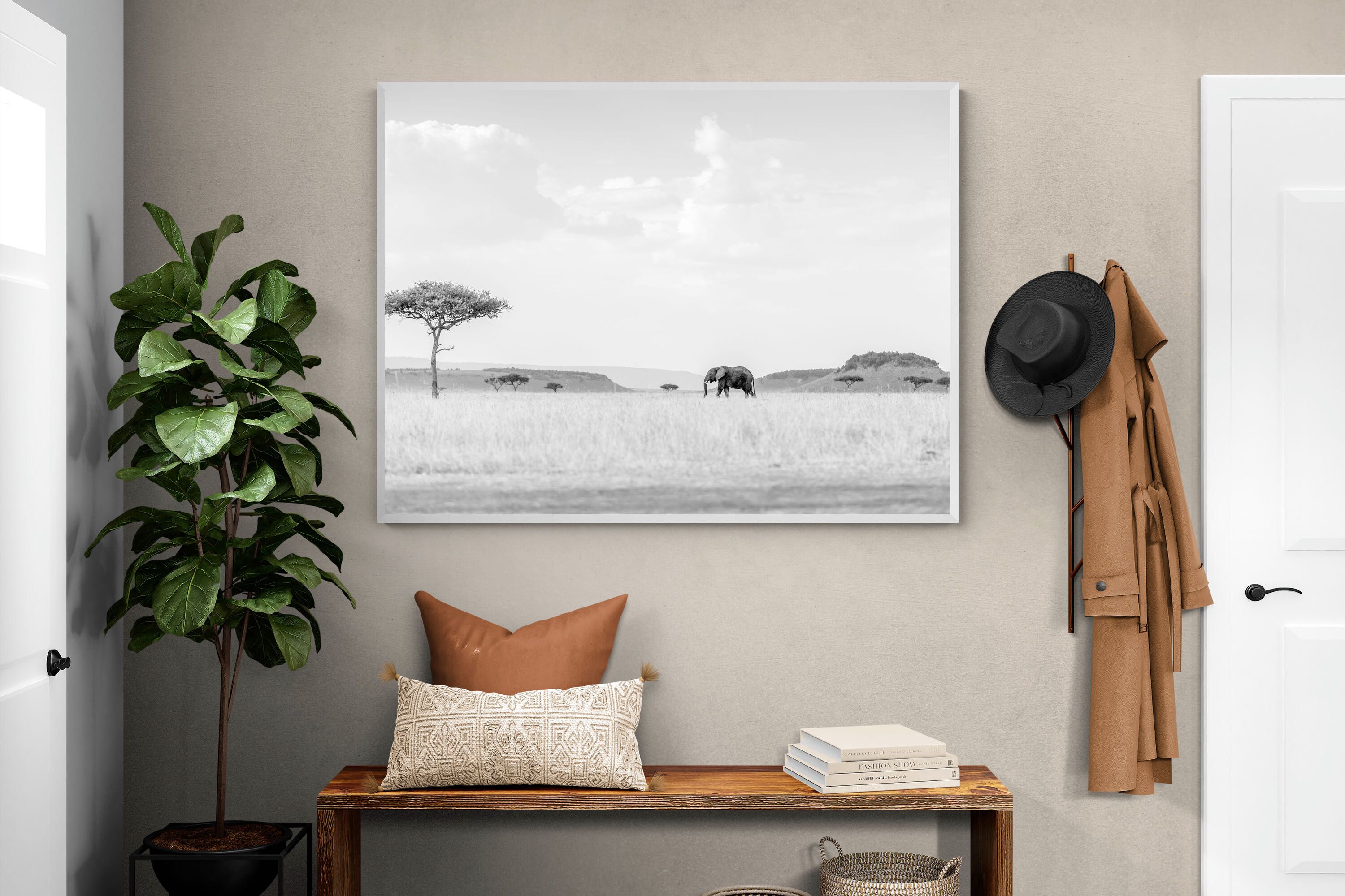 This high-key black and white photograph captures a lone elephant moving quietly across open savannah, framed by scattered acacia trees and distant rolling hills. The soft tonal palette and expansive negative space create a calm, minimalist composition with powerful presence. Ideal for contemporary interiors, safari-inspired spaces or monochrome décor schemes, this piece brings scale, serenity and understated African drama to a feature wall. A refined wildlife statement with timeless appeal.
