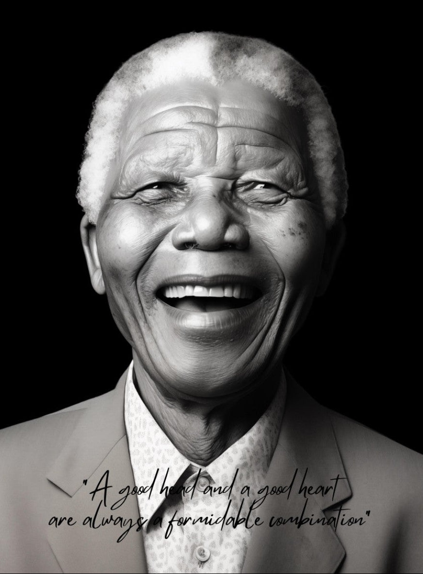 Introducing the "Mandela's Wisdom" Wall Art, a moving black and white image of the inspirational Nelson Mandela. Accompanied by his famous quote "A good head & a good heart are always a formidable combination", this piece embodies the spirit of this unforgettable world leader. Available as wall art on canvas, framed behind glass, or wallpaper, it's a powerful way to bring a dose of wisdom and inspiration into your space.