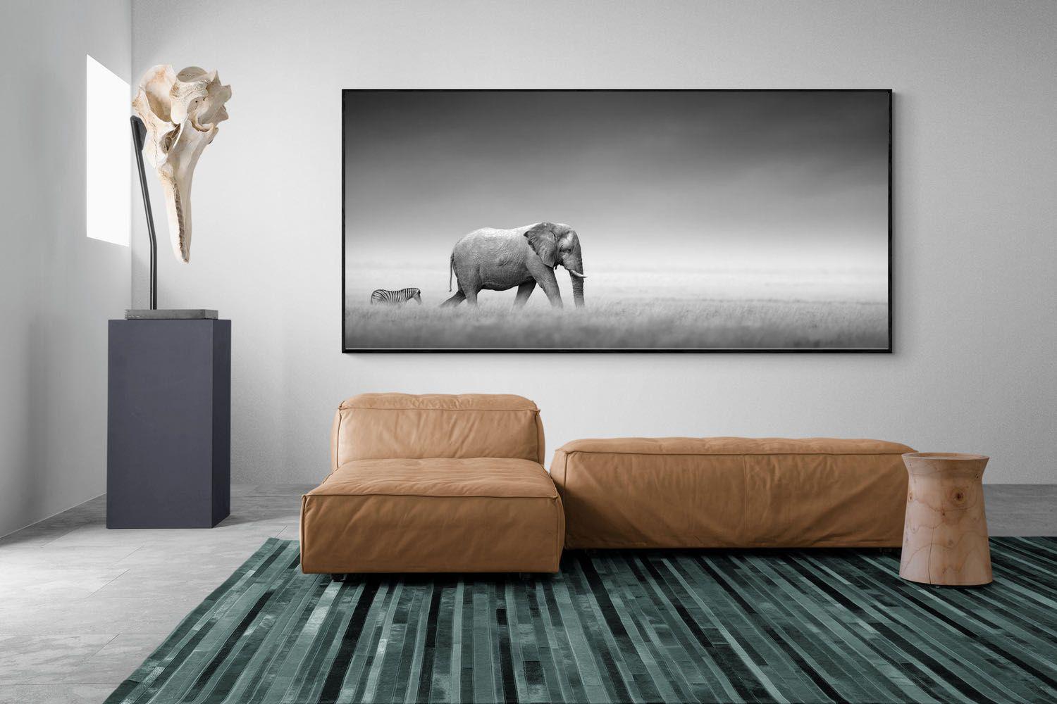 An elephant walks calmly through open grassland while a zebra follows behind, both framed within a vast, misty landscape. The minimalist composition and soft monochrome tones emphasise scale, silence and the quiet movement of wildlife across the plains. With large negative space above the horizon, the photograph feels expansive and contemplative. Elegant and atmospheric, this striking wildlife scene creates refined wall art for modern homes, safari-inspired interiors or spaces celebrating the beauty of Africa’s natural world.