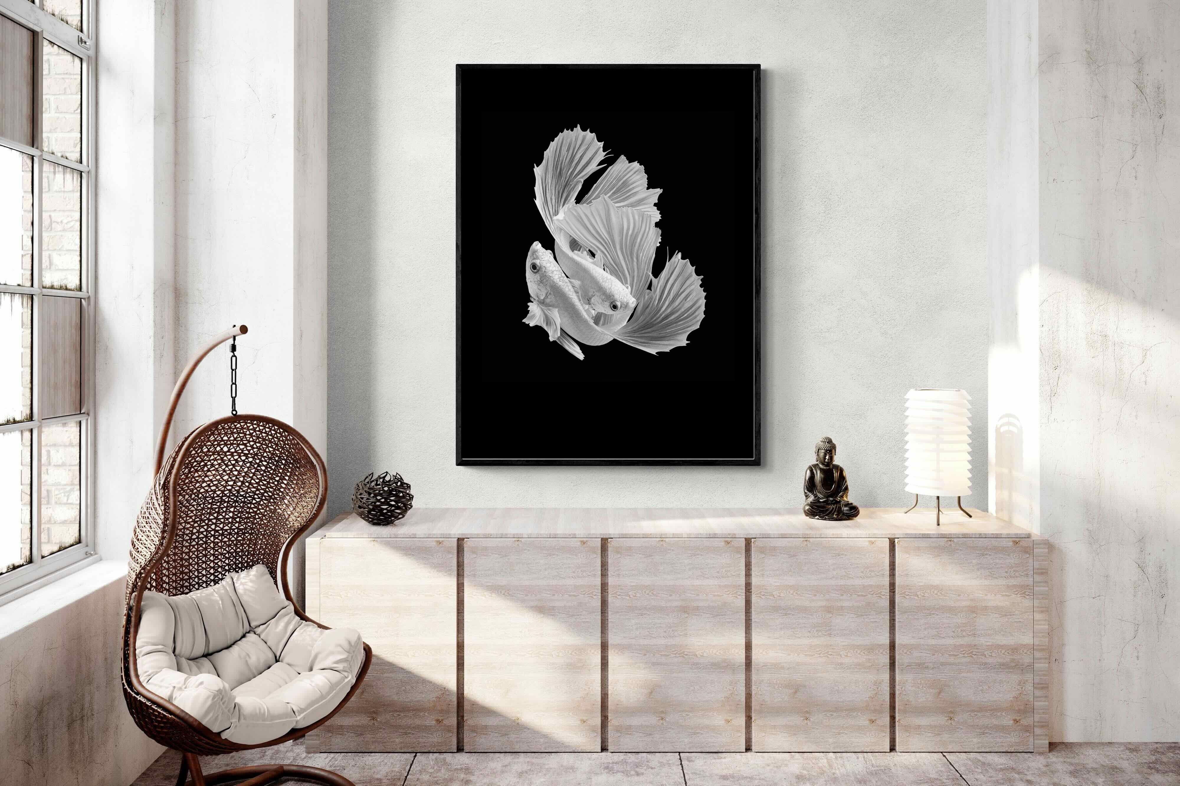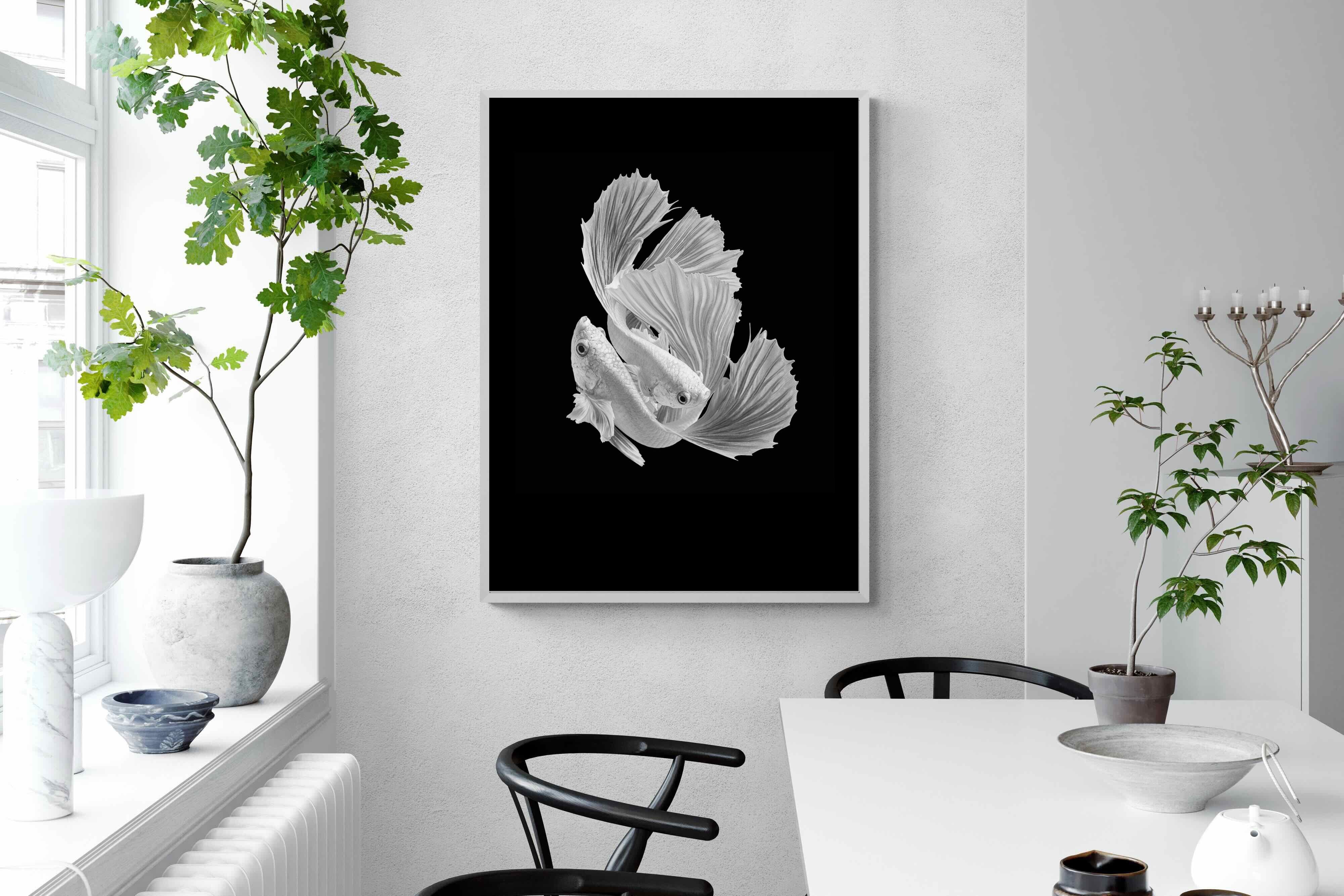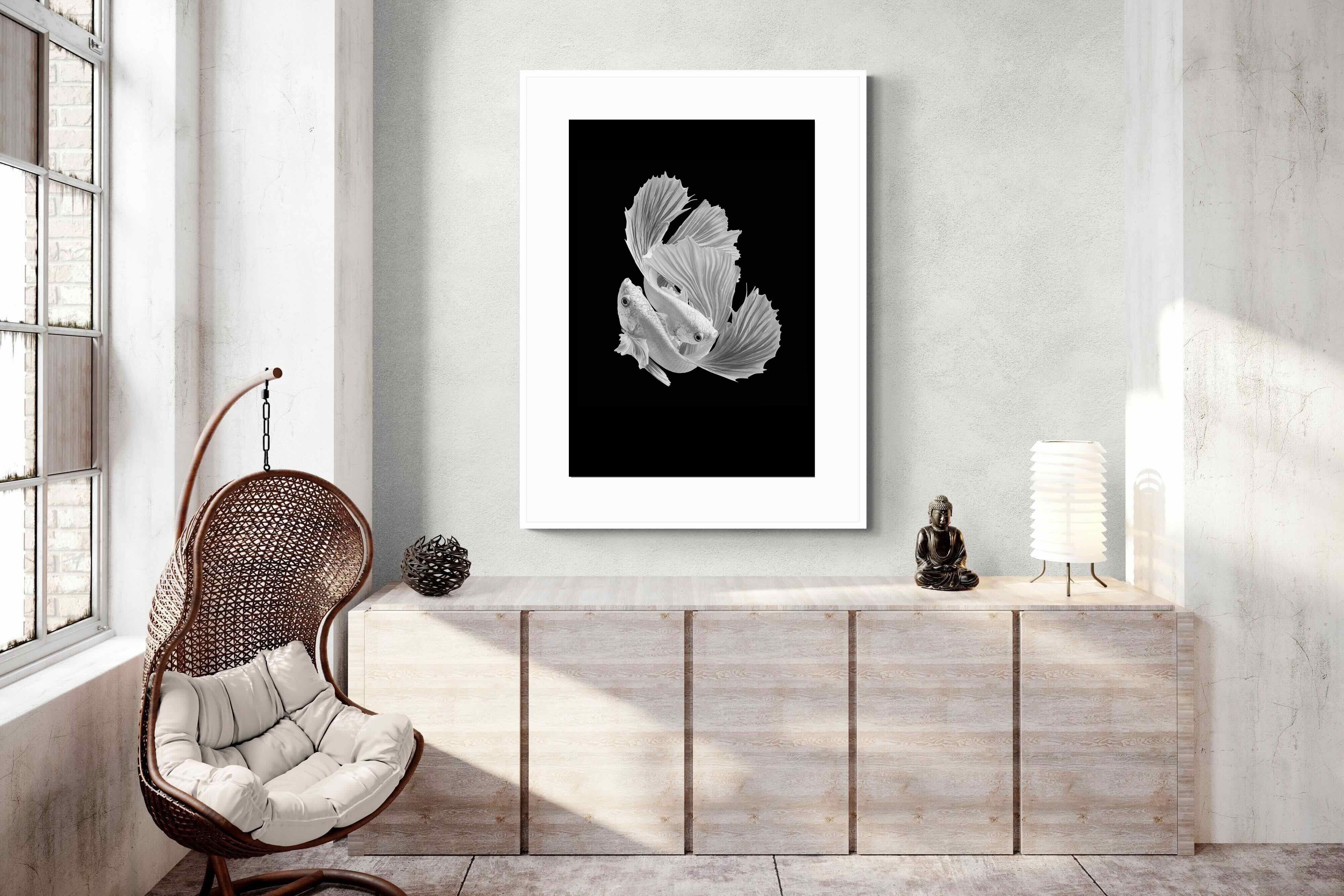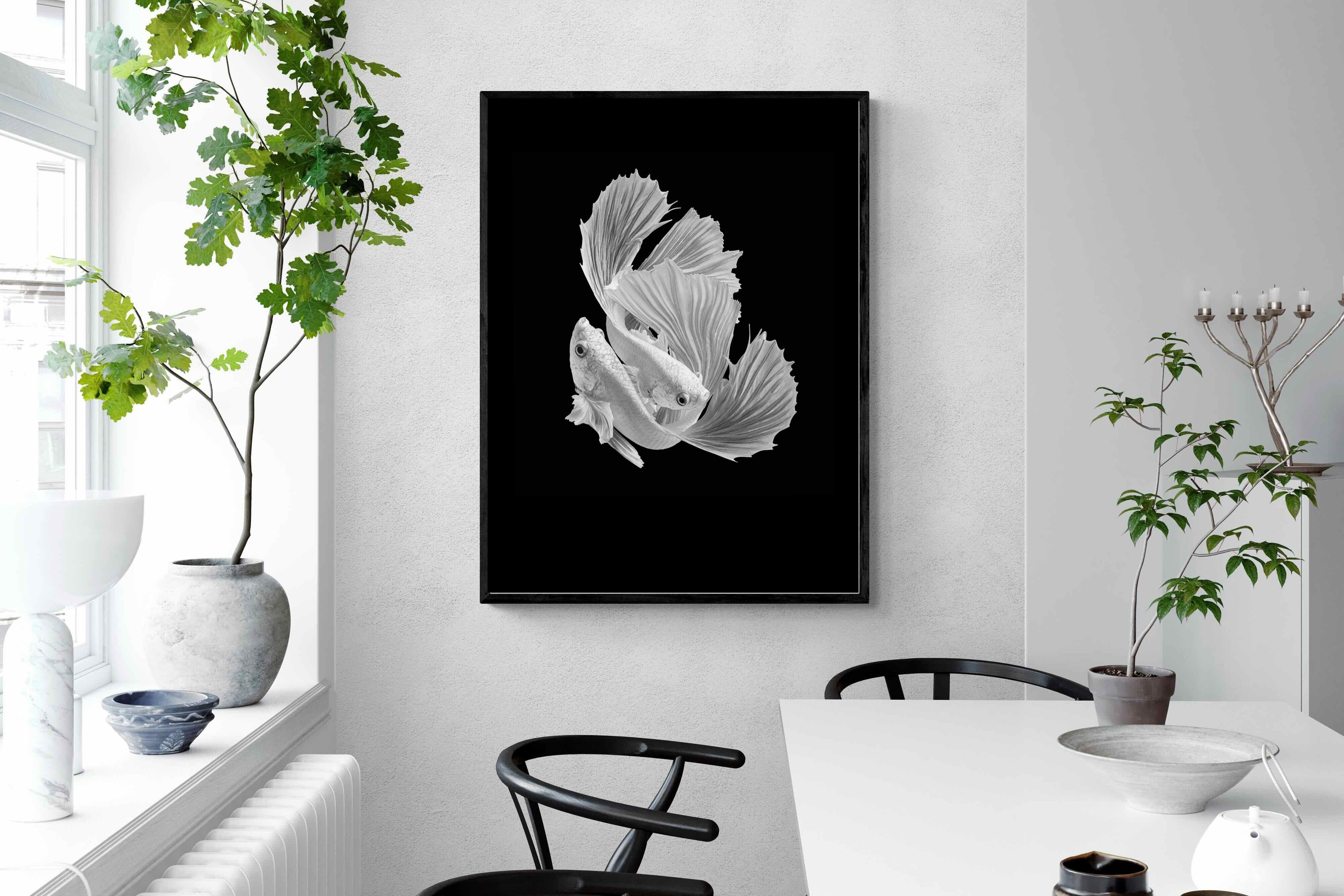 "Monochrome Grace" captures the delicate beauty of a Betta fish, its fins and tail undulating like ethereal fabric. The absence of colour emphasises the textures and movement, bringing a sense of tranquility and the beauty of simplicity to any space. This piece would complement a minimalist decor, drawing the eye with its intricate details and the stark contrast between the fish and the deep black background. It's an ode to nature's artistry in its purest form.